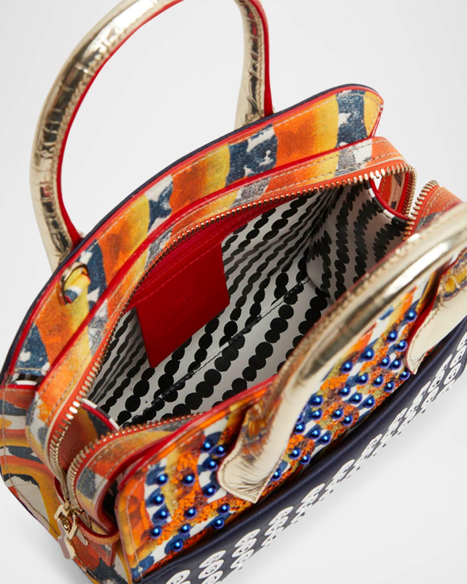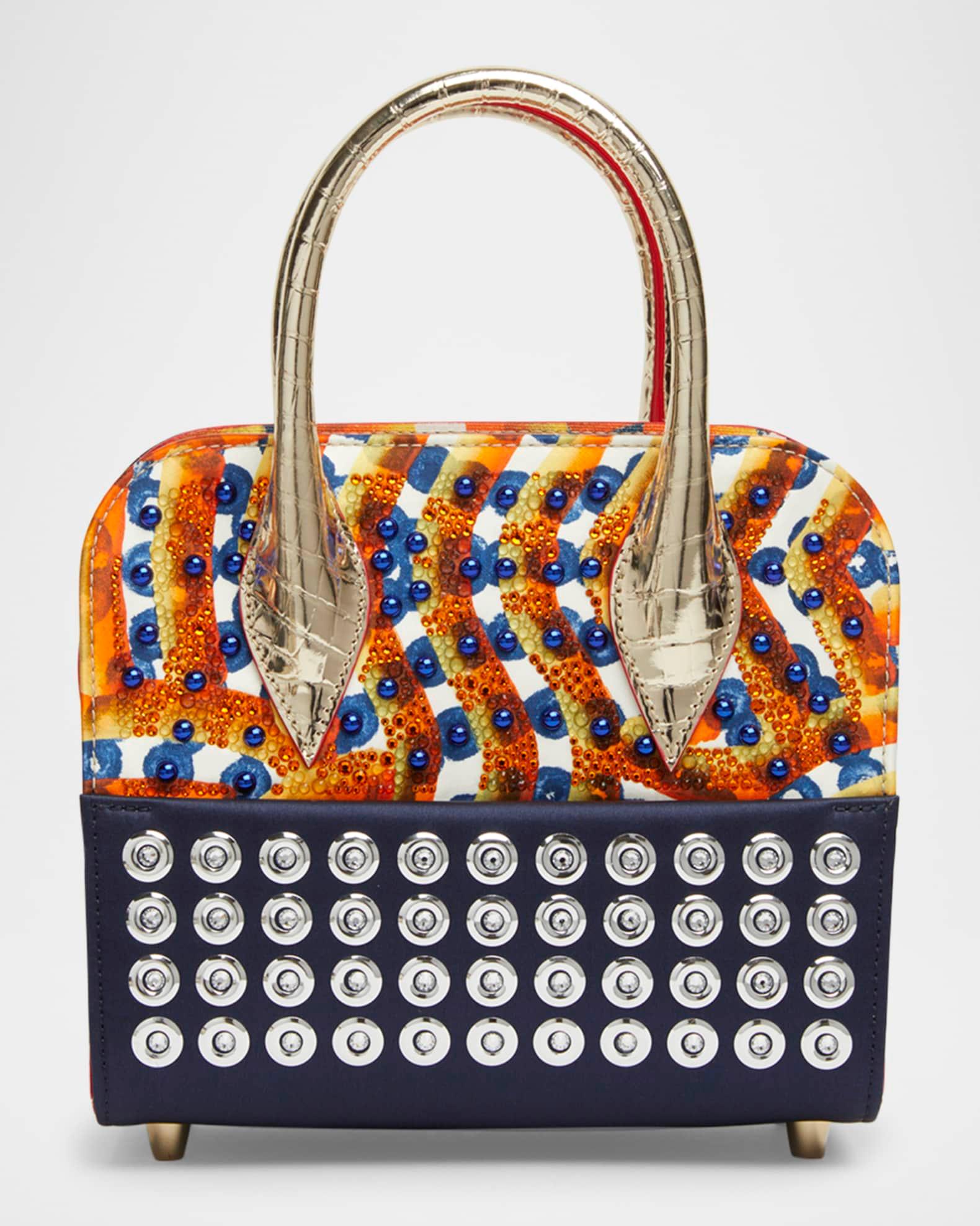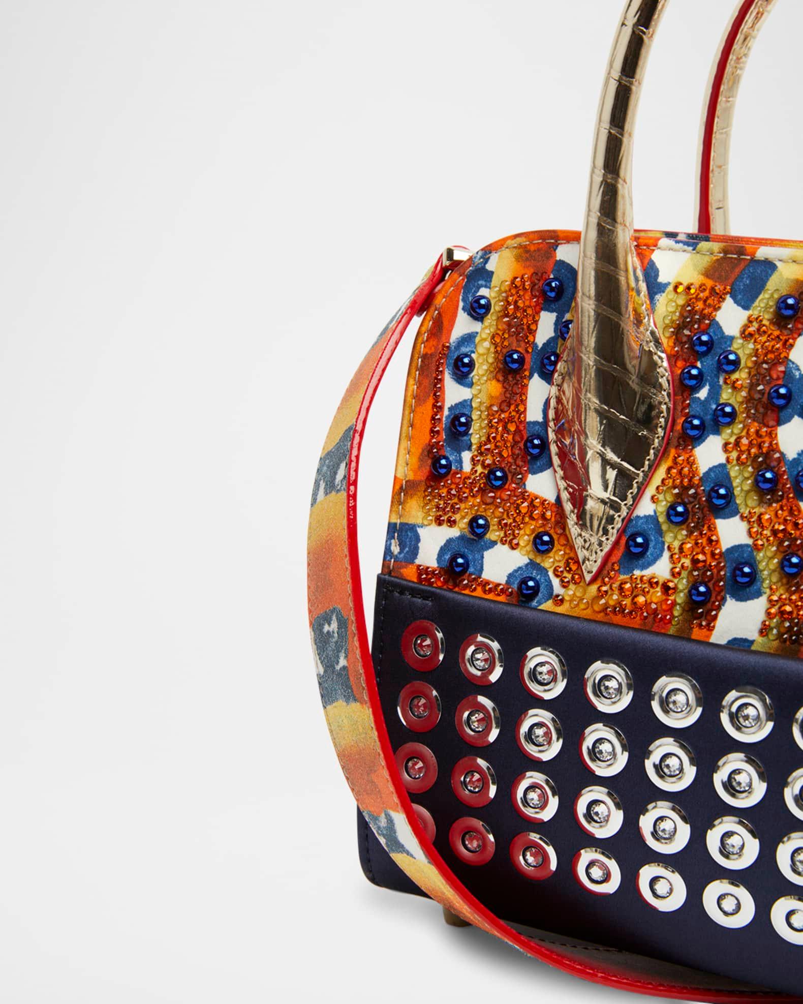 Christian Louboutin "Eloise" top handle bag in gaagal mirror strass embellishment satin and leather Metall croc-embossed leather top handles Detachable shoulder strap Can be worn as a top handle or shoulder bag Zip top closure Interior, one zip pocket Lining: Cotton/leather/cotton/PU Feet protect bottom of bag Approx. 6.9"H x 8.3"W x 4.1"D Silk/leather/cotton Made in Italy