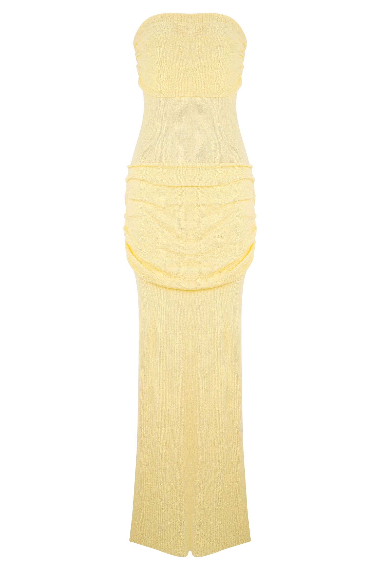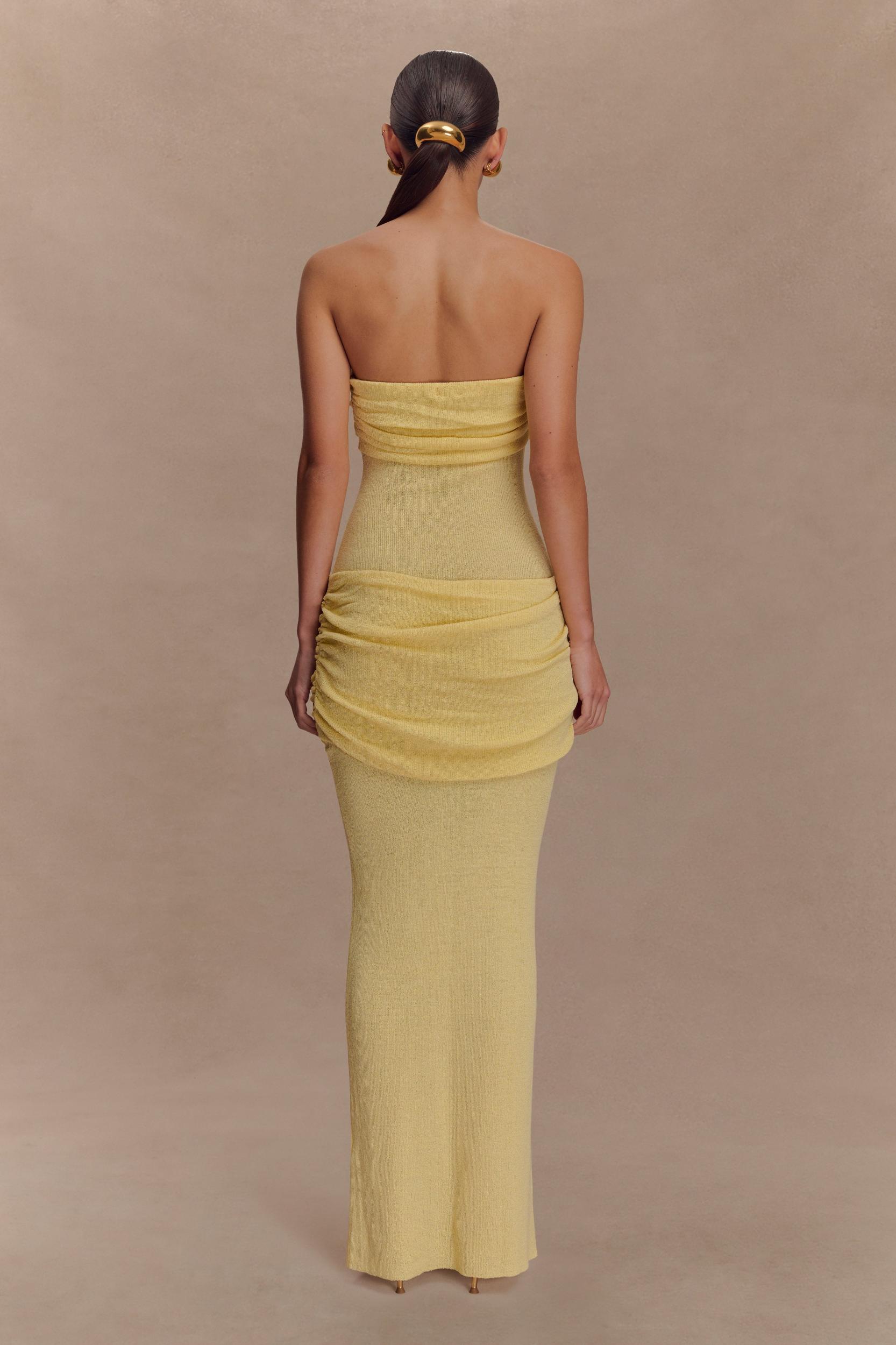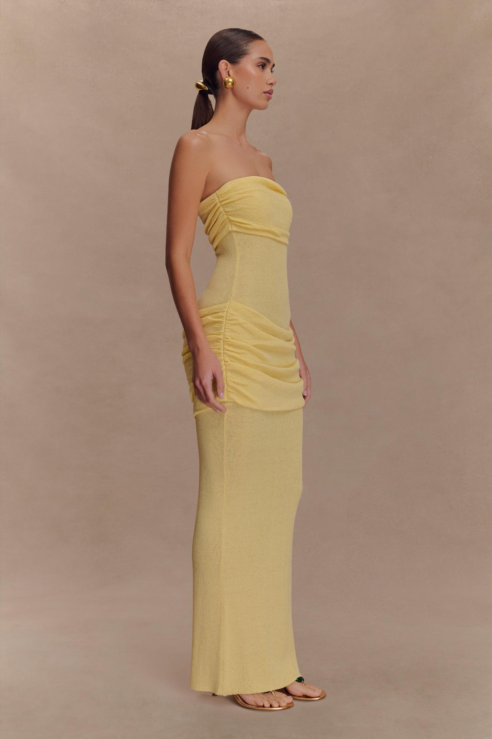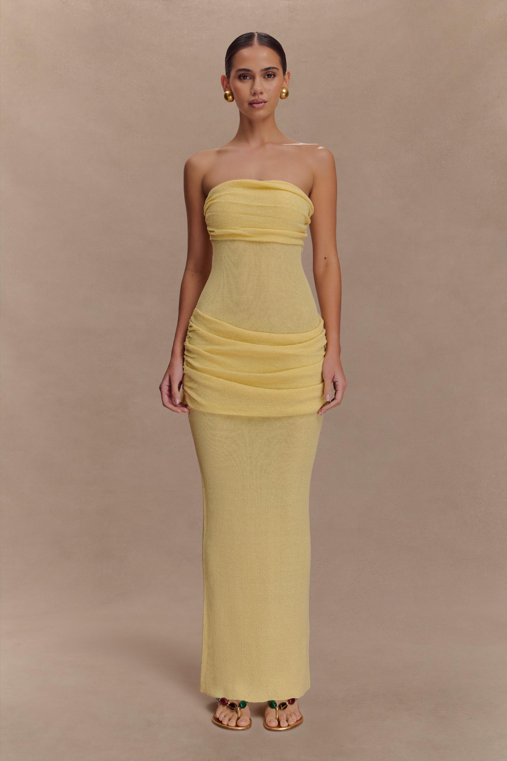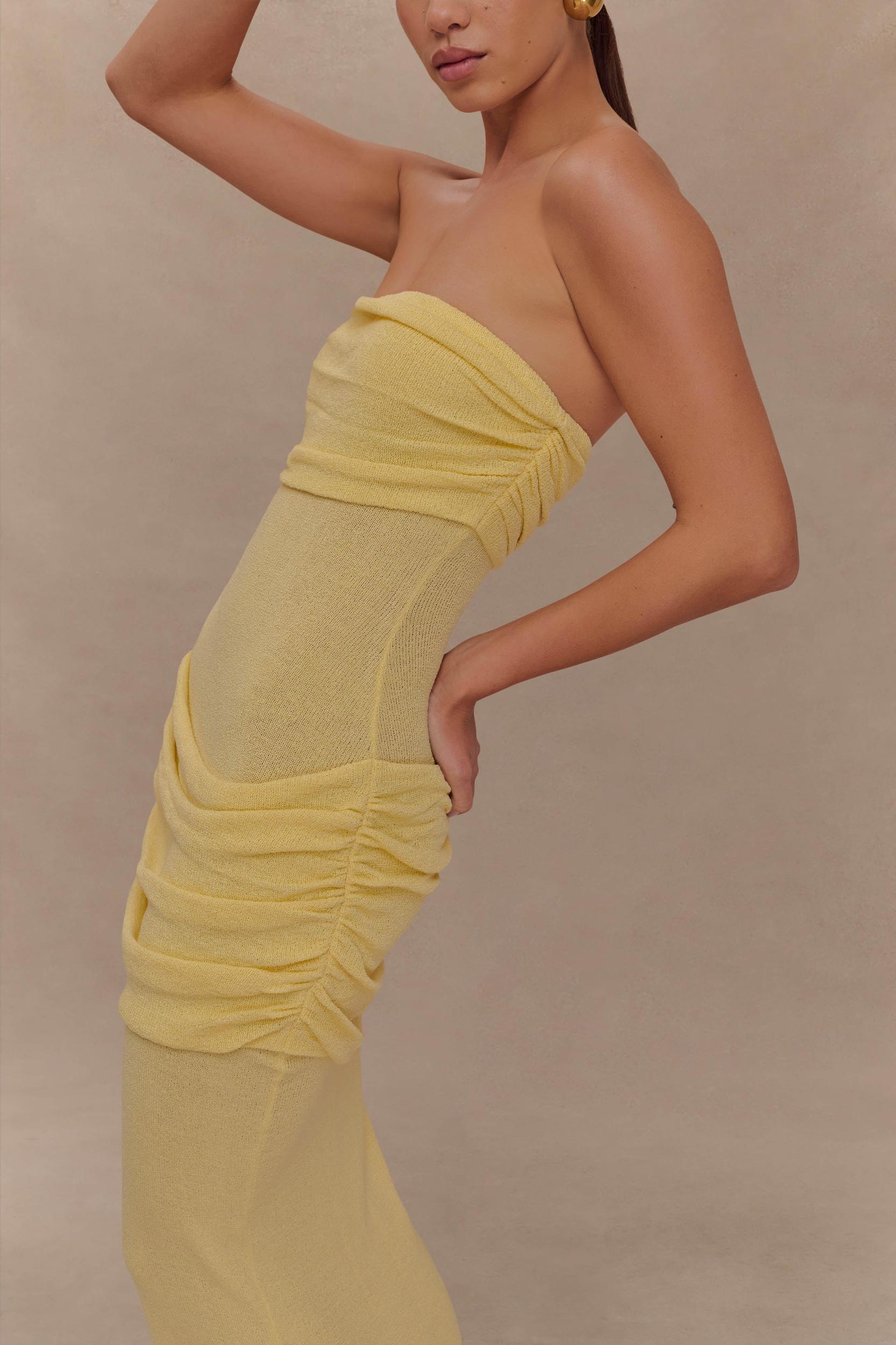 Cool curves, warm days. The ELORA Strapless Knit Maxi Dress is your warm-weather essential for effortless allure. Designed in a semi-sheer knit with a sculpted bodycon silhouette, Elora features a softly gathered bust overlay and matching gathered hip panel to enhance and flatter your natural shape. The strapless neckline keeps things clean and modern, while the maxi length brings easy elegance. Whether you're headed to a long lunch or watching the sunset over the sea, this dress brings quiet confidence to every moment.