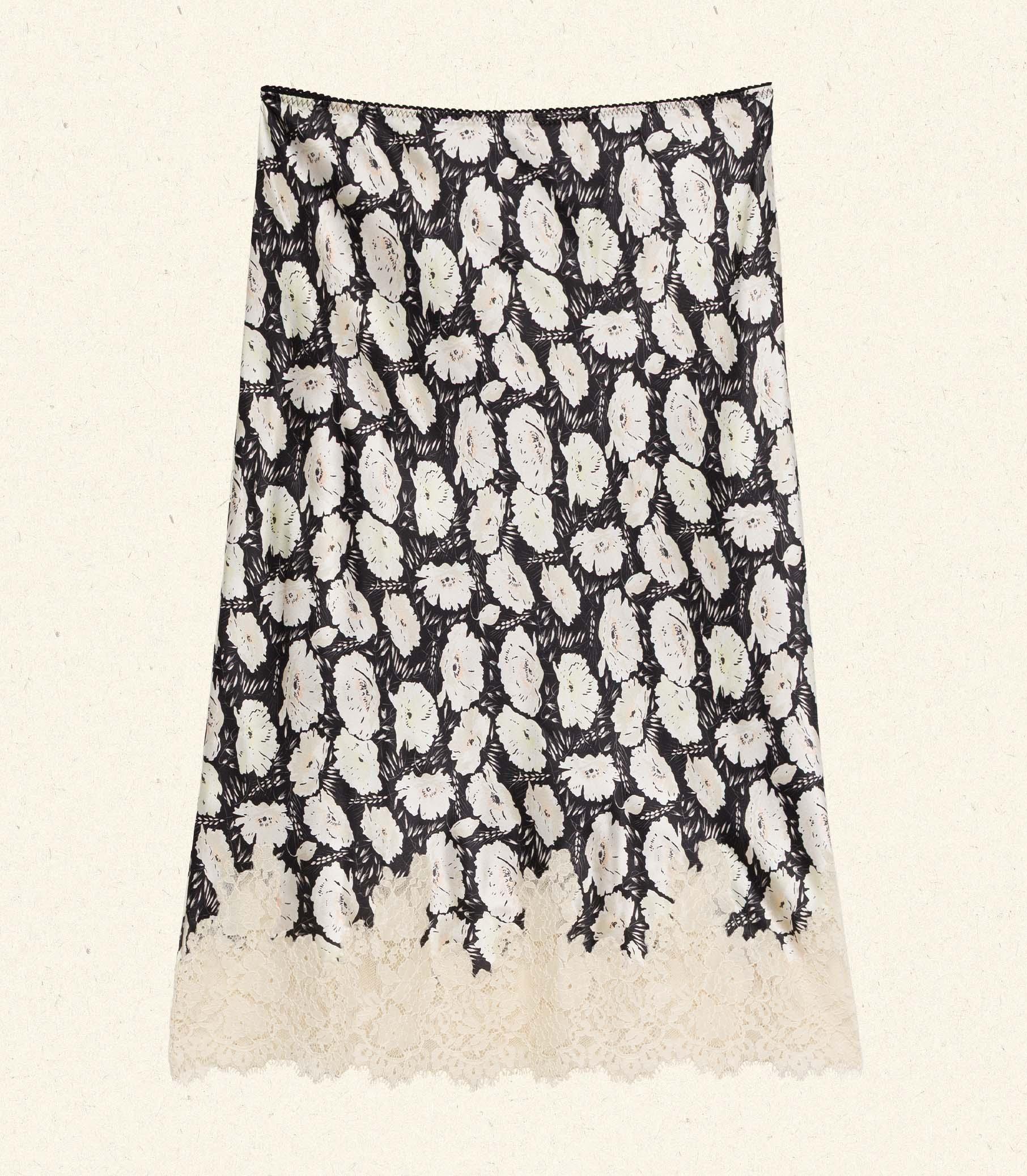 A slightly shorter take on our beloved Elowena, the Elowette Skirt is a bias-cut, midi-length skirt in buttery silk satin. It’s graced with our ‘30s-inspired Fleurs d’Anemone print and finished with delicate scalloped elastic at the high waist and floral lace along the hem.