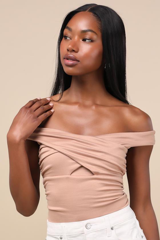 With a buttery jersey knit construction and a flirty figure-fitting look, this lil' top will be your go to for date nights that turn into late nights. A cross-front design forms an off-the-shoulder neckline and slender sleeves that frame the ruched bodice, creating the most flattering silhouette.