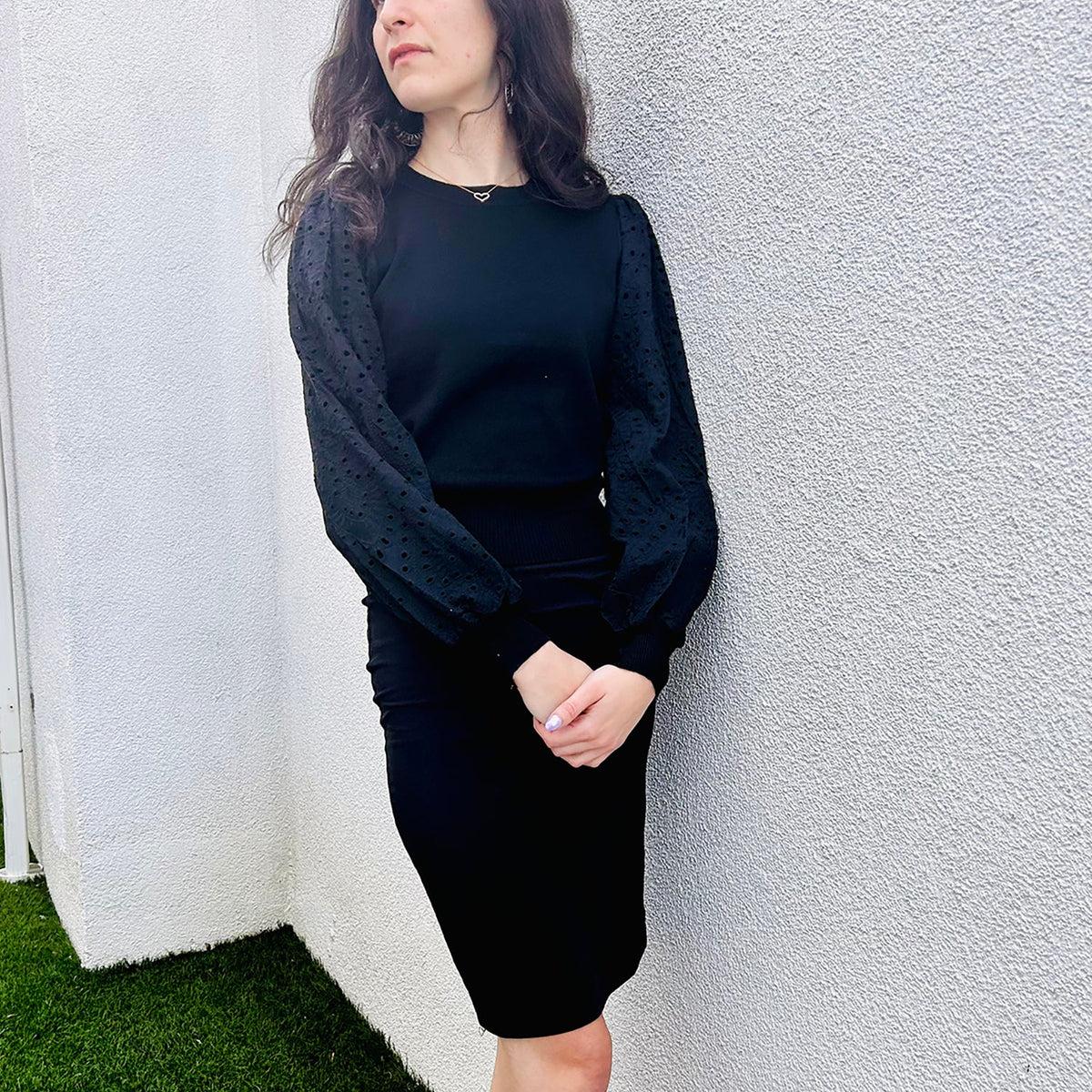 The quality knit fabric provides warmth and durability while preserving the sweater’s unique aesthetics. It also features an intriguing eyelet pattern across the sweater, adding depth and mystery. The charming combination of the lace and eyelet patterns makes this sweater unique and adds a touch of sophistication to any outfit.