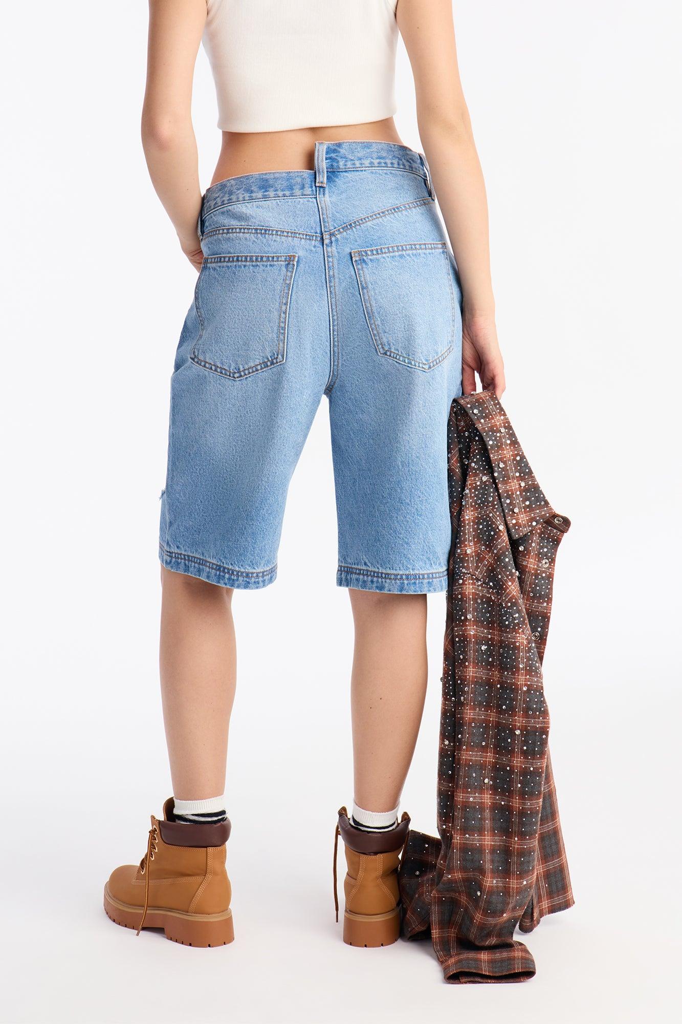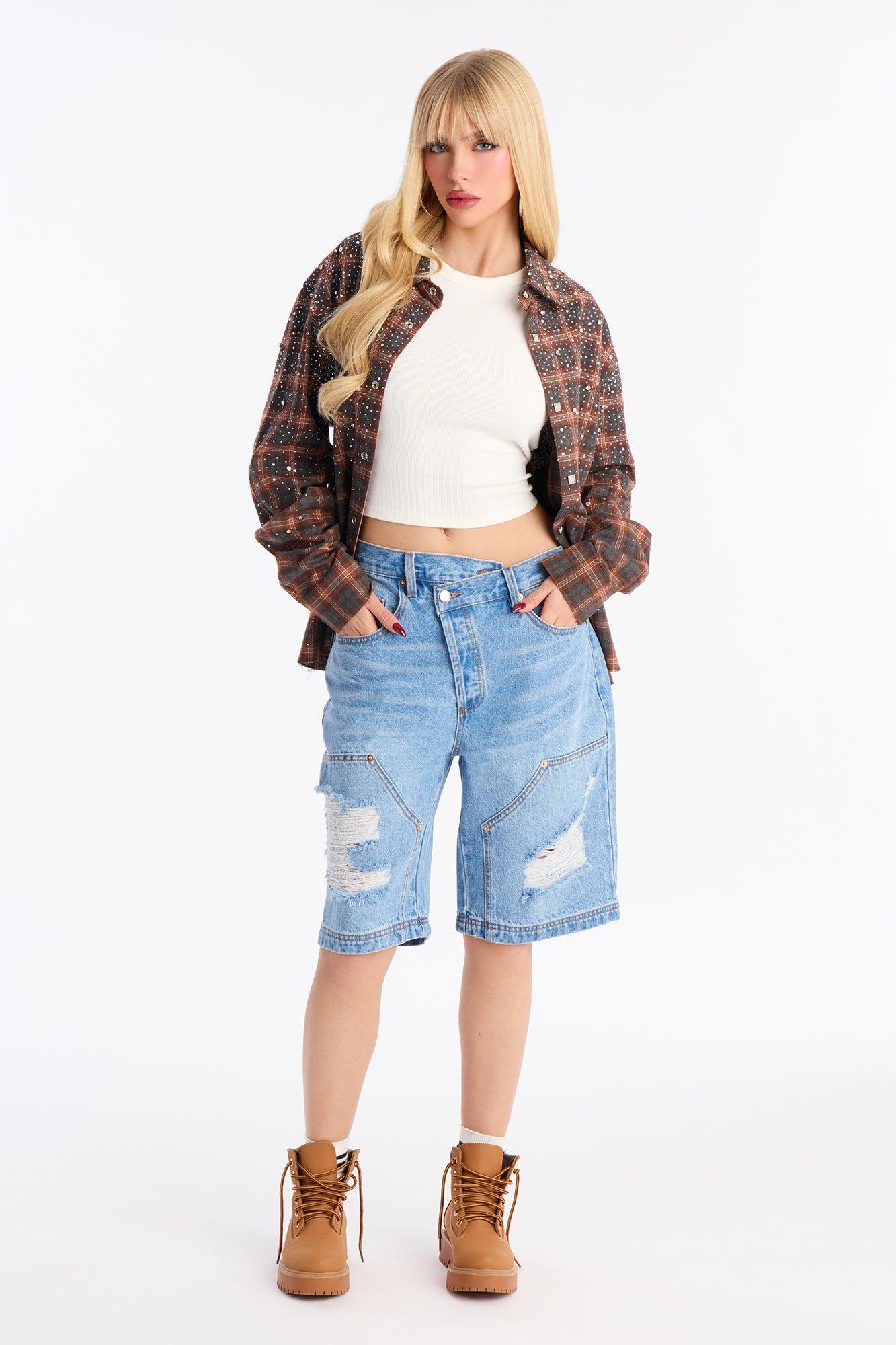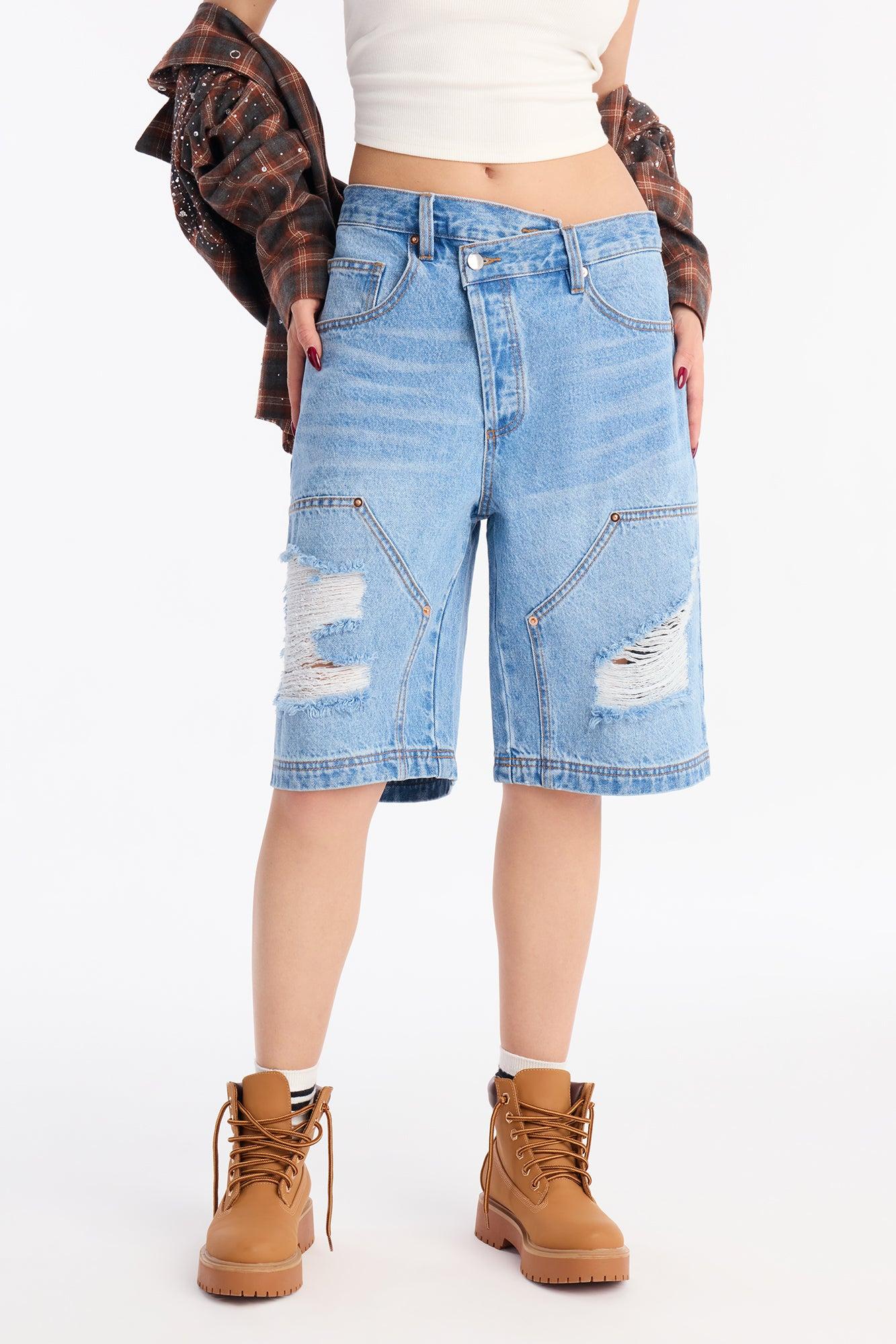 Available In Dark Wash And Medium Wash. Denim Jort 5 Pocket Crossover Waistband Utility Detail Ripped 11.75" Rise 10.5" Inseam Non-Stretch Disclaimer: Due To The Specialized Wash & Distressing Process, Each Garment Is Unique 100% Cotton Imported