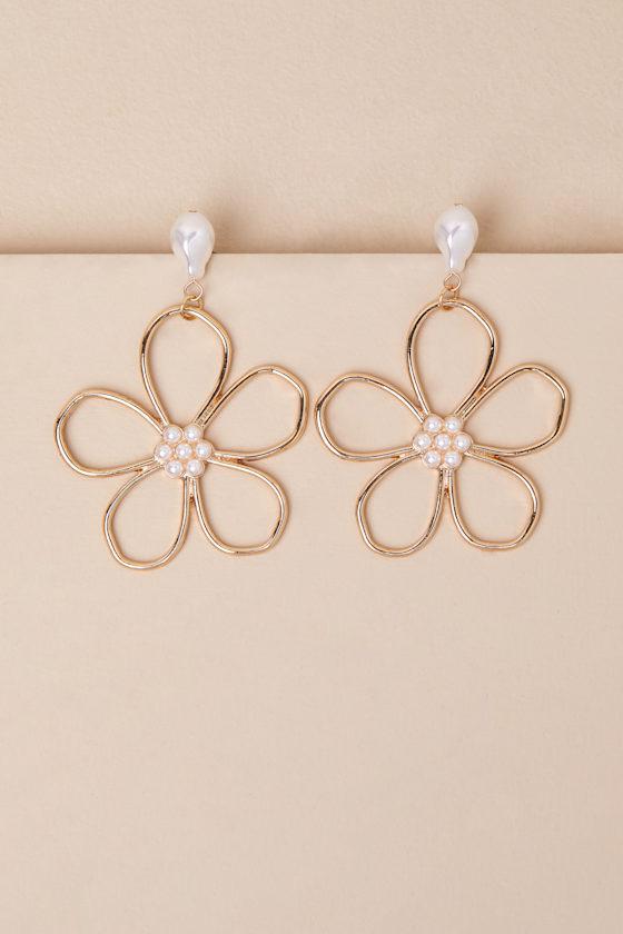 The Lulus Elske Gold Pearl Flower Earrings will pair perfectly with the most important events on your spring calendar! These earrings make the cutest statement thanks to shiny, gold-toned metal that shapes oversized, wire-like floral silhouettes that fall from organically-shaped, faux pearl posts. A gleaming cluster of matching faux pearls accent the center to lend an even sweeter finish to the drop-style design.