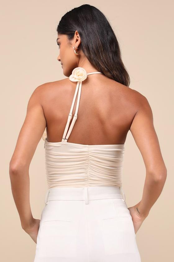Slip into something a little more elegant, starting with this mesh bodysuit that features a figure-hugging bodice with flattering ruching throughout. A three-dimensional rosette detail accents the halter-style neckline, supported by dual adjustable straps that sit asymmetrically across the open back design, connected via a matching rosette. Attached bottoms have snap closures.