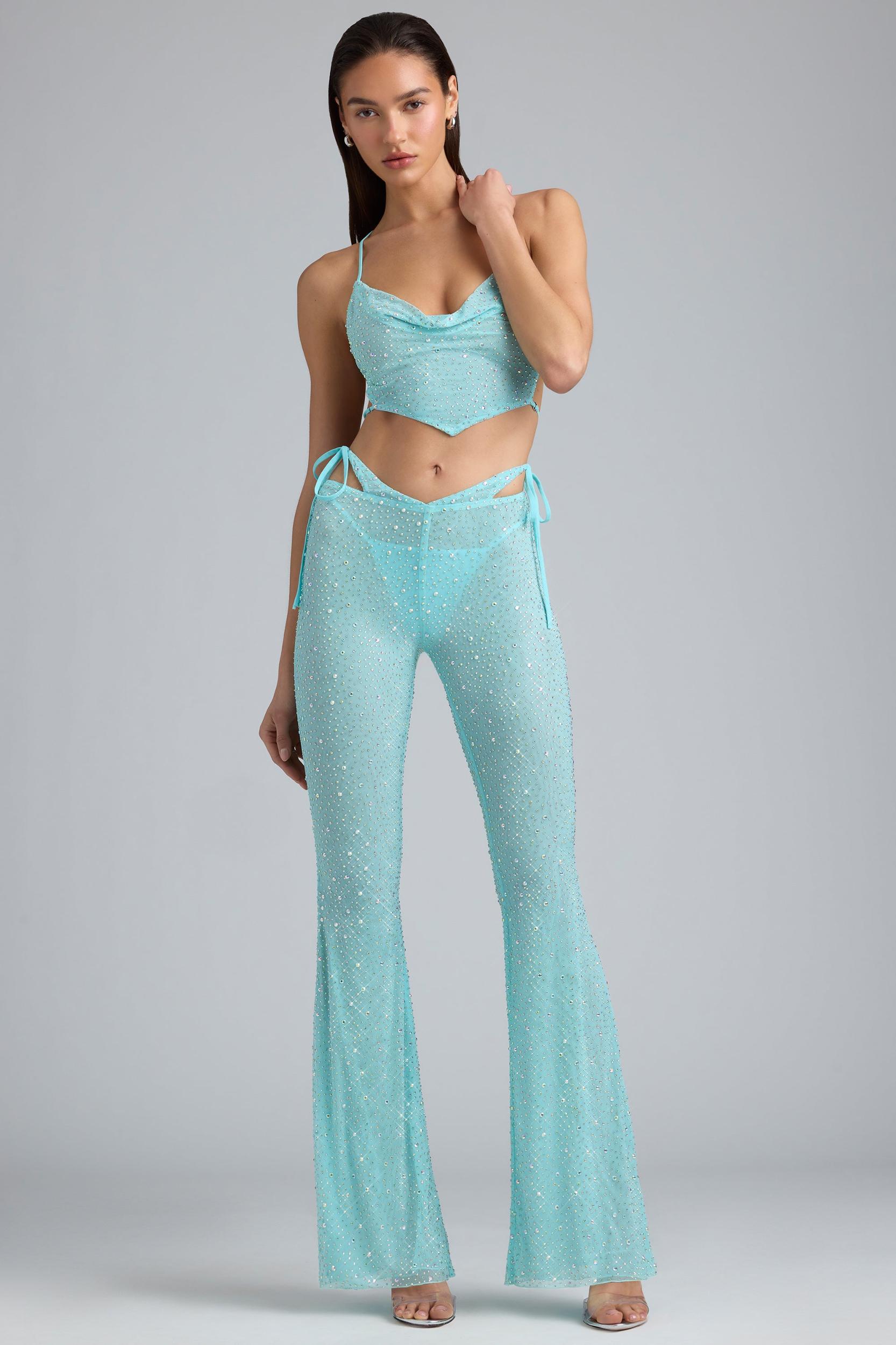 Upgrade your festival rotation with the Ruby trousers. Ideal for all-day dancing, they’re designed in our figure-enhancing 20D mesh fabric to a mid-rise silhouette with flared hems. The V-shaped waistline is punctuated with striking cut-out detailing at each side and complete with functional ties, cementing the iconic noughties inspiration.Mid-rise V-shaped elasticated waistbandSide cut-outs with functional tiesAll-over rhinestone embellishmentPull-on designFlared legFull length, inseam approx. 77cm (Petite), 82cm (Regular) and 89cm (Tall) based on a UK size 8Product code: 8355We do our best to ensure that our photos are as true to colour as possible. However, due to inconsistencies in monitors, digital photography, and product variations, we cannot guarantee that the colour you see on your screen accurately portrays the true colour of this product.