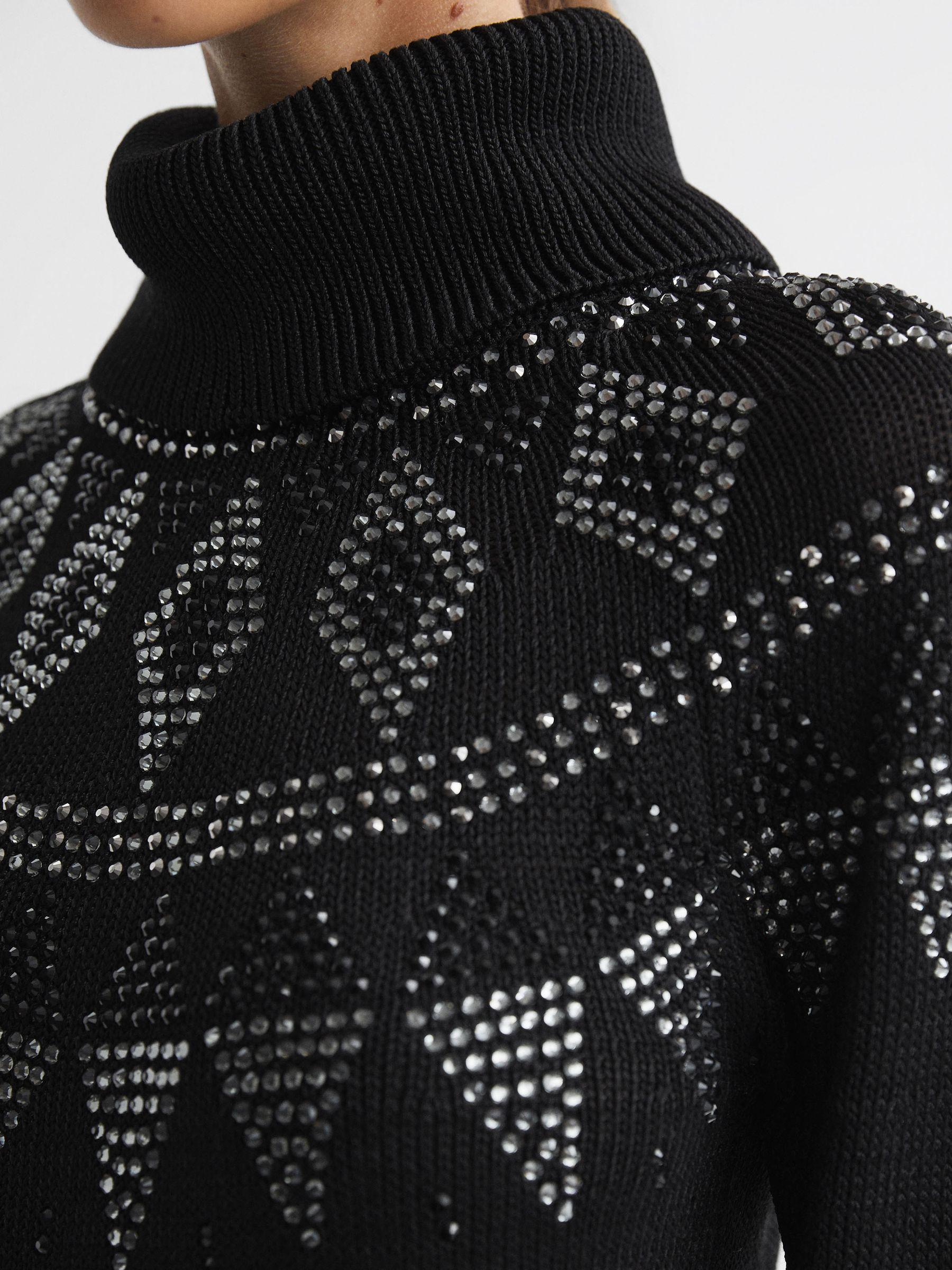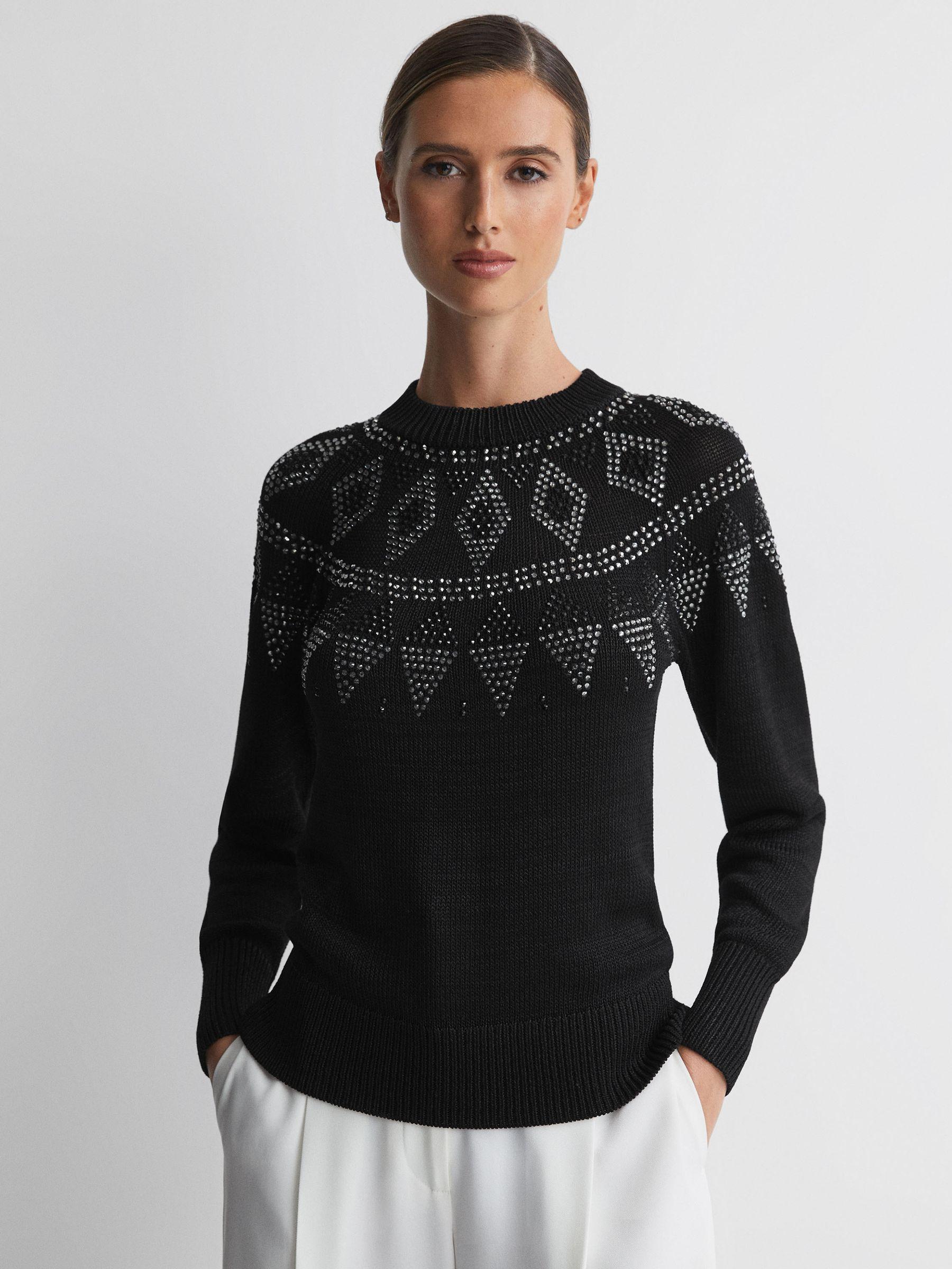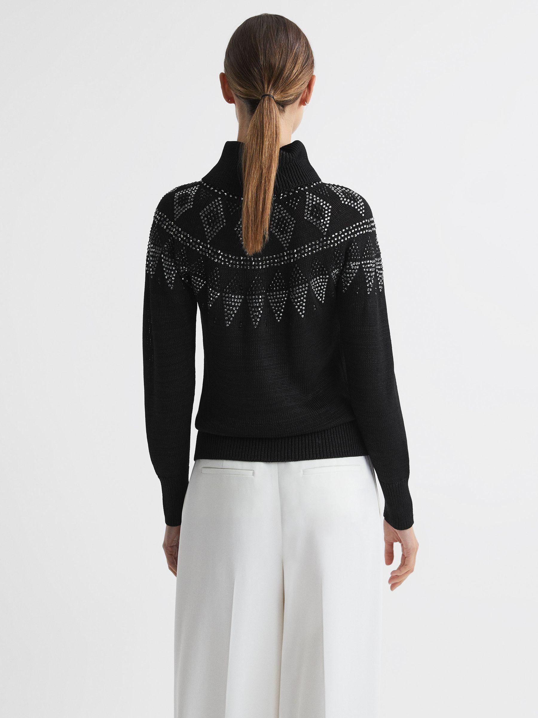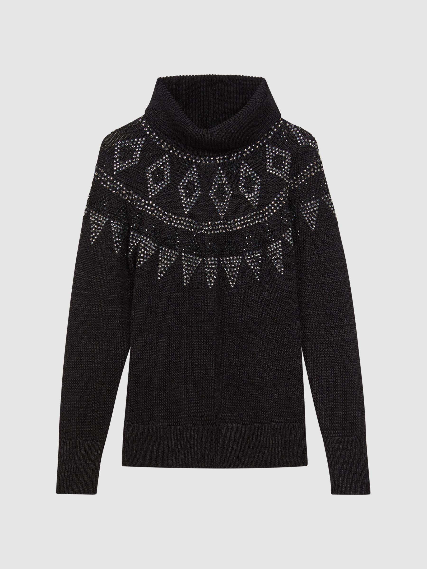 Invest in the Bella black jumper, a stylish long-sleeve shape designed with rhinestones in a timeless fair-isle pattern. Ribbed trims refine the look and a removable roll-neck element allows you to customise the wear. Style simply with trousers and trainers, or choose loafers to refine the look. Fair-Isle design. Rhinestone detailing. Removable roll neckline. Long sleeves. Ribbed trims. The model is wearing a size S. Measurements of model: Height 5ft 10" / 178cm.