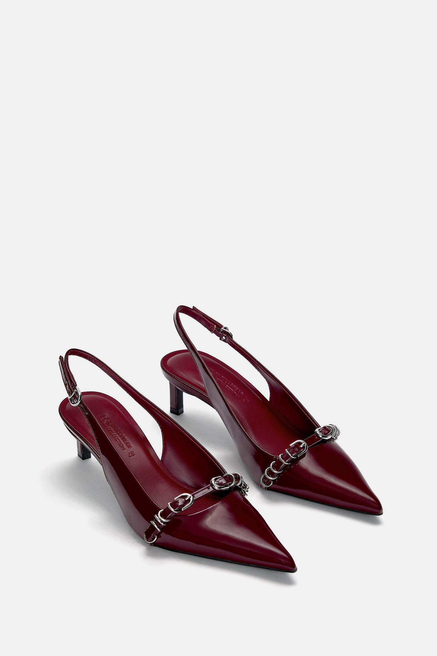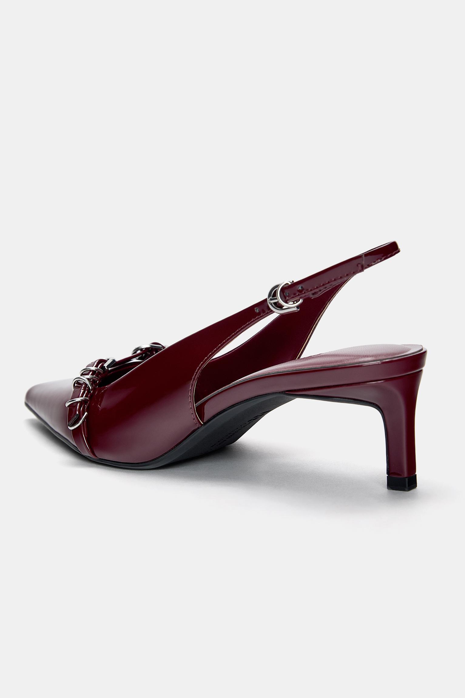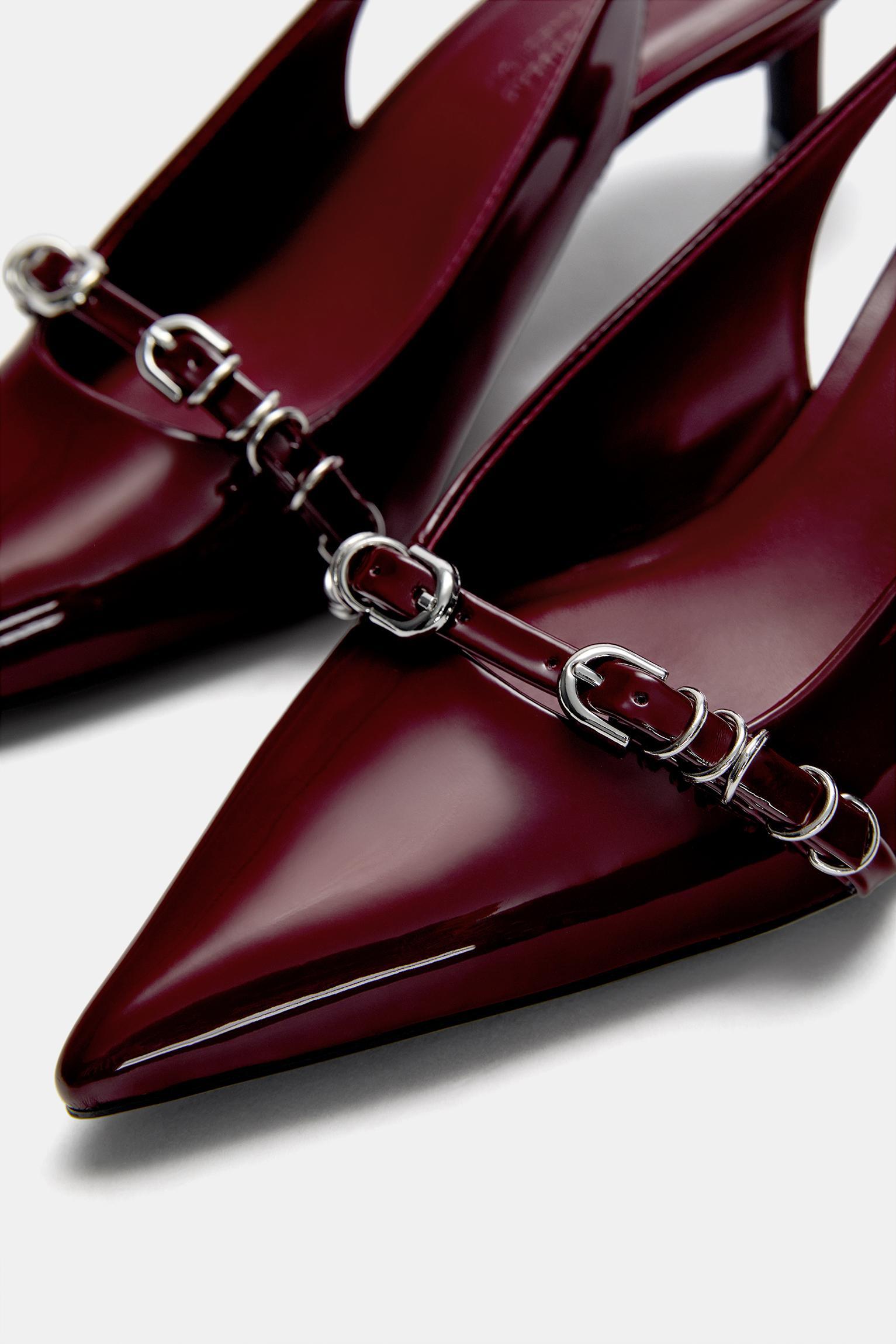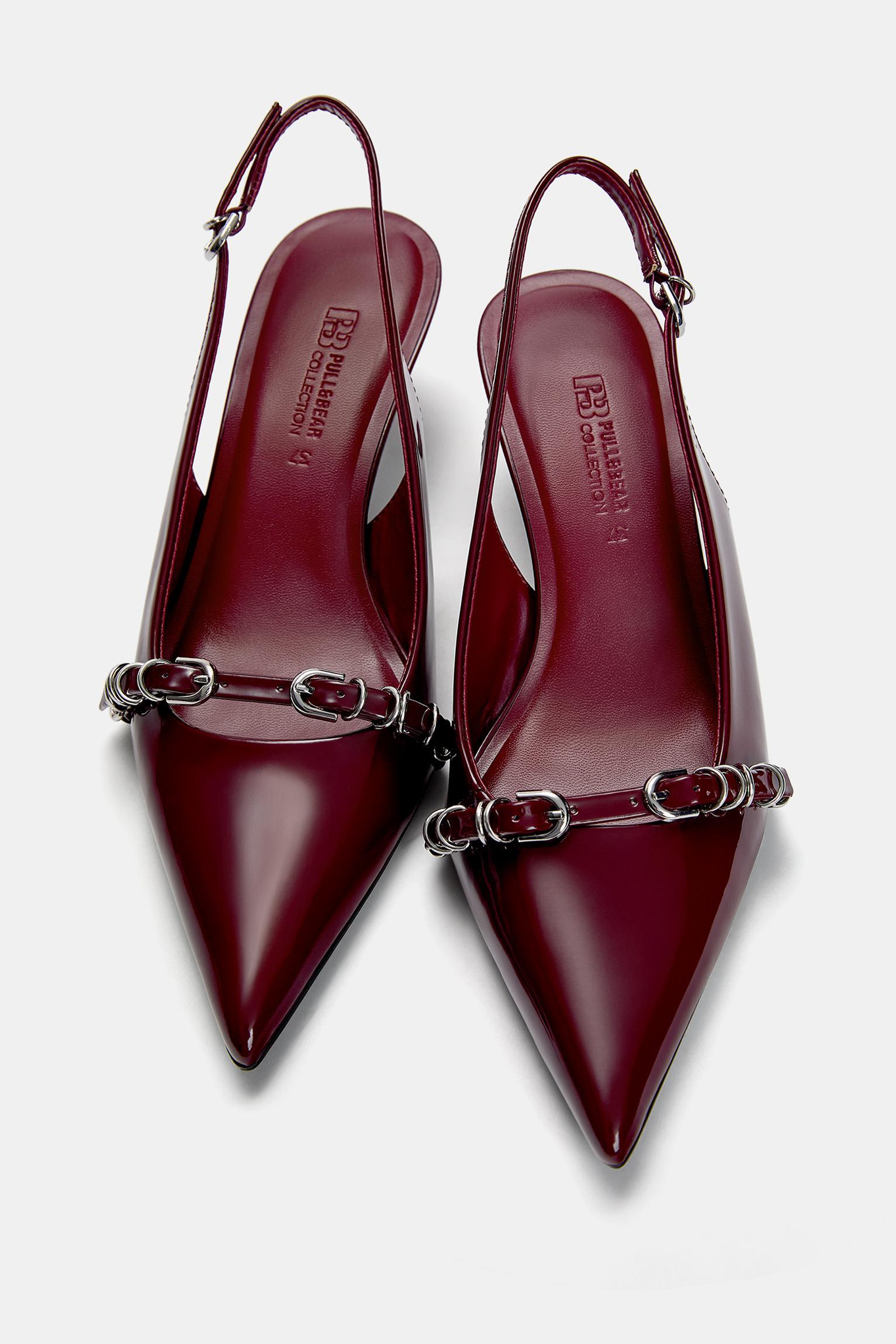 Heeled shoes in faux patent fabric available in maroon. Metallic appliqués on the front strap. Low heel. Pointed toe. Buckled ankle strap fastening. Heel height: 6 cm.