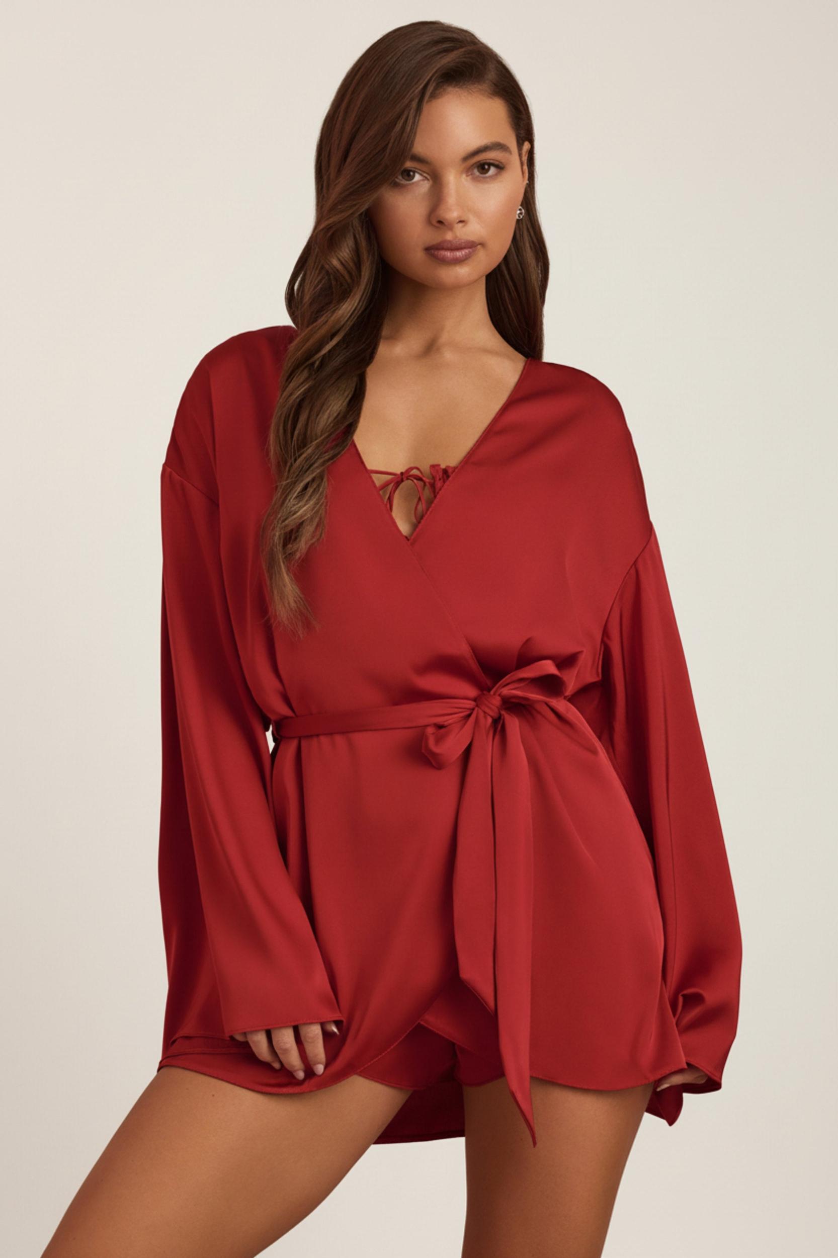 Just a girl. Elevate your mornings or cosy evenings with the Reina robe, crafted from premium, lightweight and lustrous recycled satin. Available in three standout hues, it’s cut to a wrap-over silhouette with a self-tie waist belt for custom styling and features dropped shoulders for a loose and comfy fit. The back is embellished with cursive HOTFIX lettering. V-neckFloaty long sleevesDropped shouldersSelf-tie waist belt HOTFIX-embellished lettering at backLoose fit Mini length, centre back length approx. 78cm based on a size SProduct code: 12526