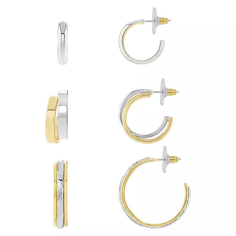 Accent your ensemble with this beautiful Two Tone C-Hoop Earring Trio Set. Click on this JEWELRY & WATCHES GUIDE to learn about fit, styles, materials and more! Accent your ensemble with this beautiful Two Tone C-Hoop Earring Trio Set. Click on this JEWELRY & WATCHES GUIDE to learn about fit, styles, materials and more! FEATURES 3 pairs of earrings Diameters: 19 mm, 24 mm, 30 mm Backings: post Metal: brass, stainless steel Plating: gold tone, silver tone Finish: hammered, polished Packaging: decorative card Imported Nickel free Not appropriate for children 14 years old and younger. Size: One Size. Color: Multi. Gender: female. Age Group: adult.