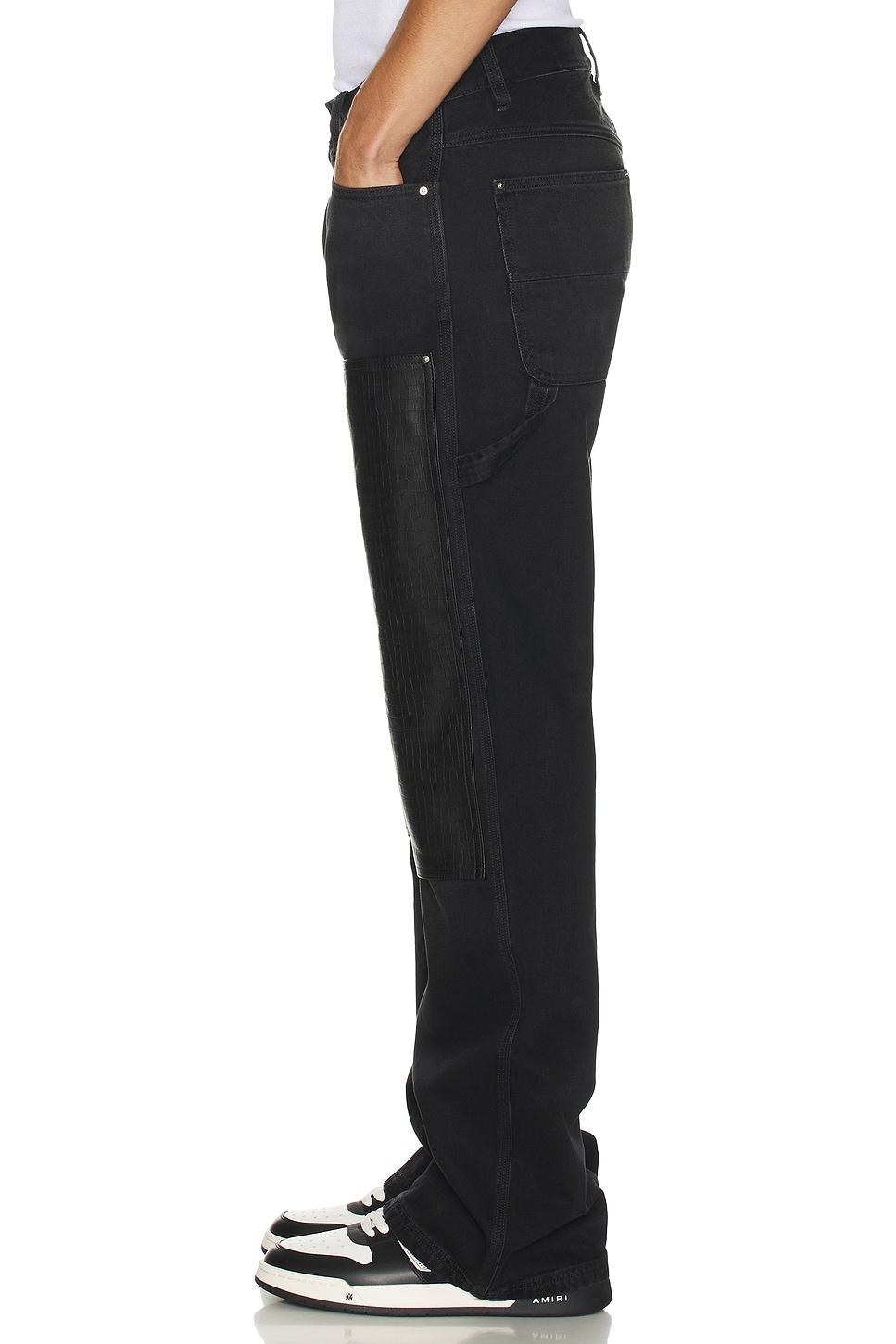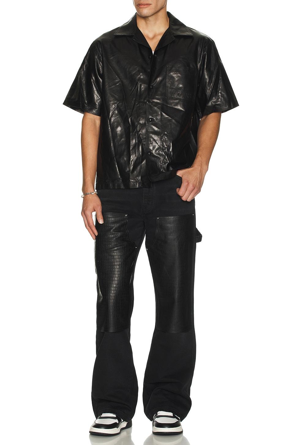 carpenter jeanSelf: 100% cottonLining: 65% polyester, 35% cottonContrast Fabric: 100% lamb leather / Dry clean only / Button fly closure / Carpenter pocket design / Croc embossed lamb feather knee patches / Back suede logo patch / Intentional fading / Heavyweight denim fabric / Made in Italy / Our Style No. AMIF-MJ406 / Manufacturer Style No. AMDNGH1103 / Model is wearing size 32.