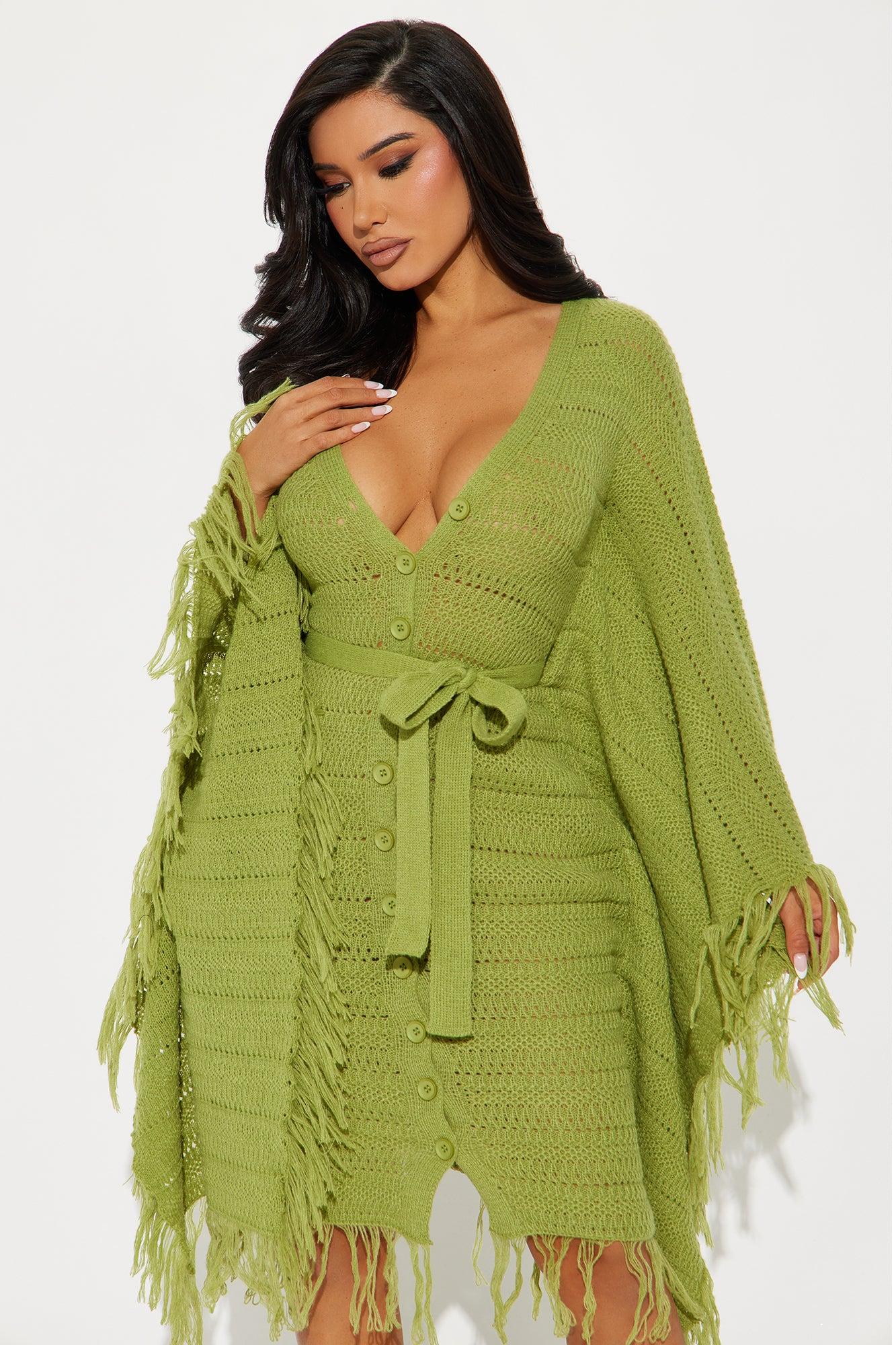 Available In Chocolate And Lime. Sweater Midi Dress V-neck Short sleeves Button up Tie waist Fringe trim Stretch Length = 41" 100% Polyester Imported California Proposition 65WARNING: Cancer and Reproductive Harm - www.P65Warnings.ca.gov.