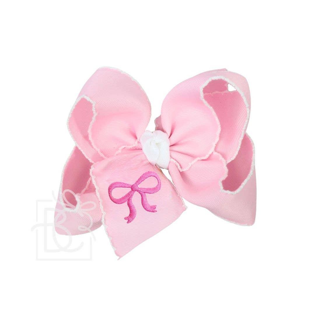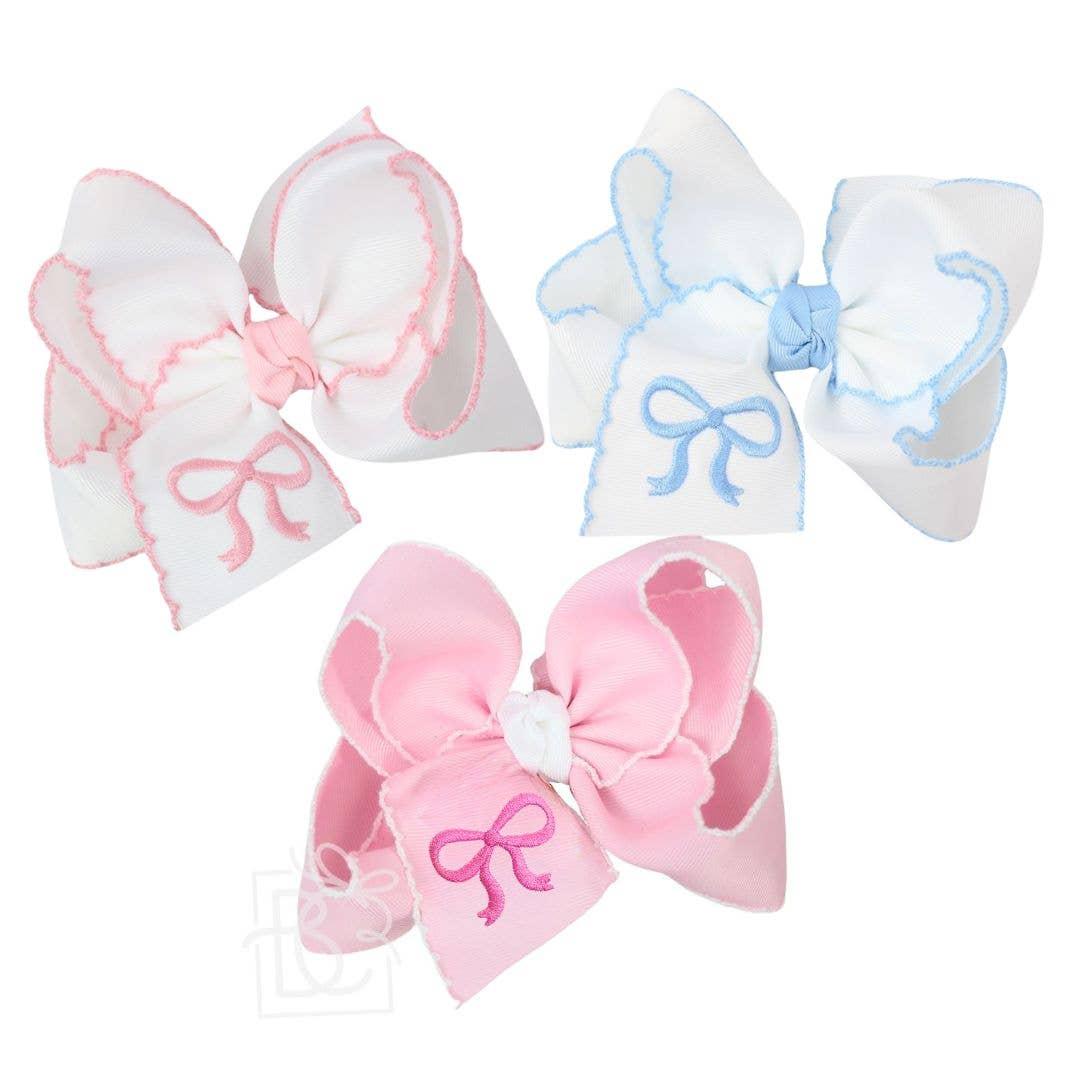 EMBROIDERED BOW CROCHET EDGE HAIR BOW ON ALLIGATOR CLIP : Light Pink w/ White Crochet Edge & Hot Pink Embroidered Bow / 5.5" Huge