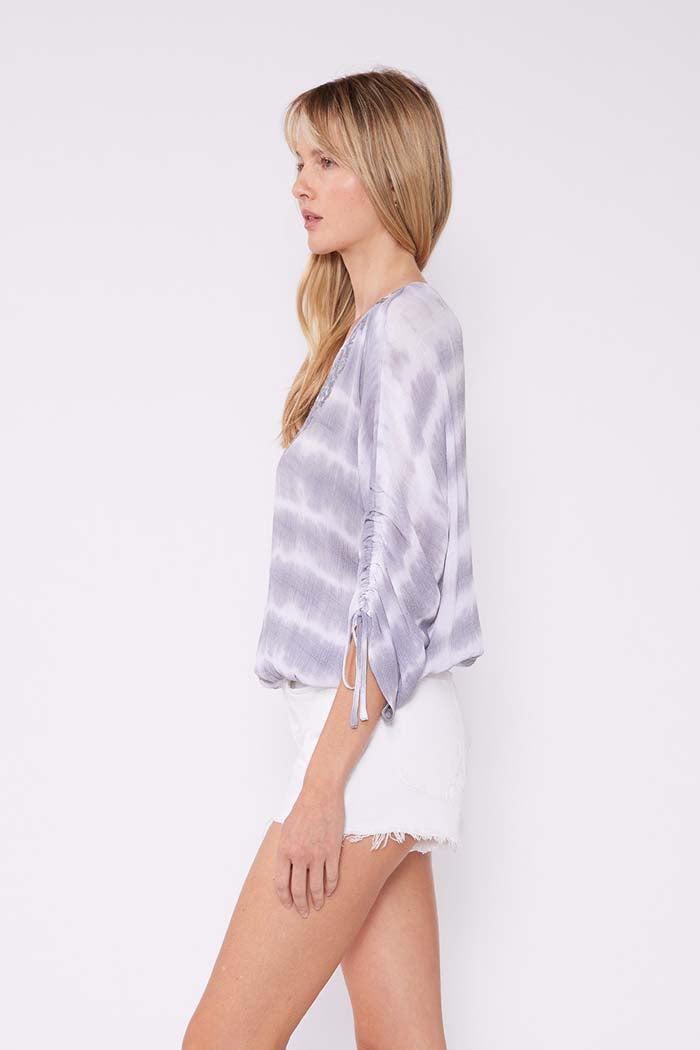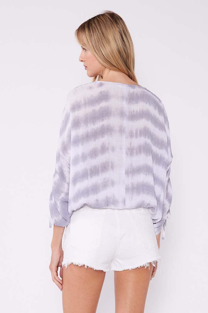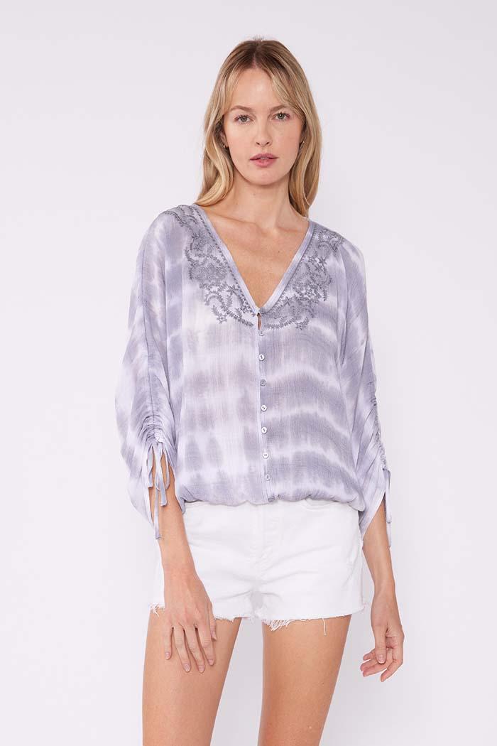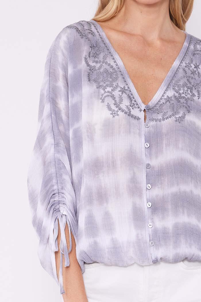 A perfect lightweight option for the upcoming season. This tie-dye, embroidered blouse features a v-neckline, ruched 3/4 sleeves, functional button front, and an elastic hem for comfort. A chic bohemian top, designed to add a unique flair to your summer collection.