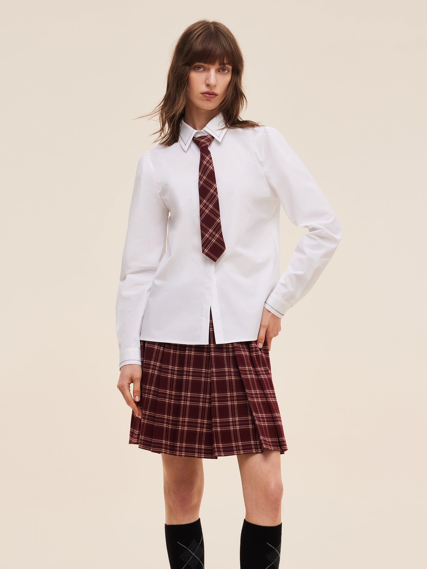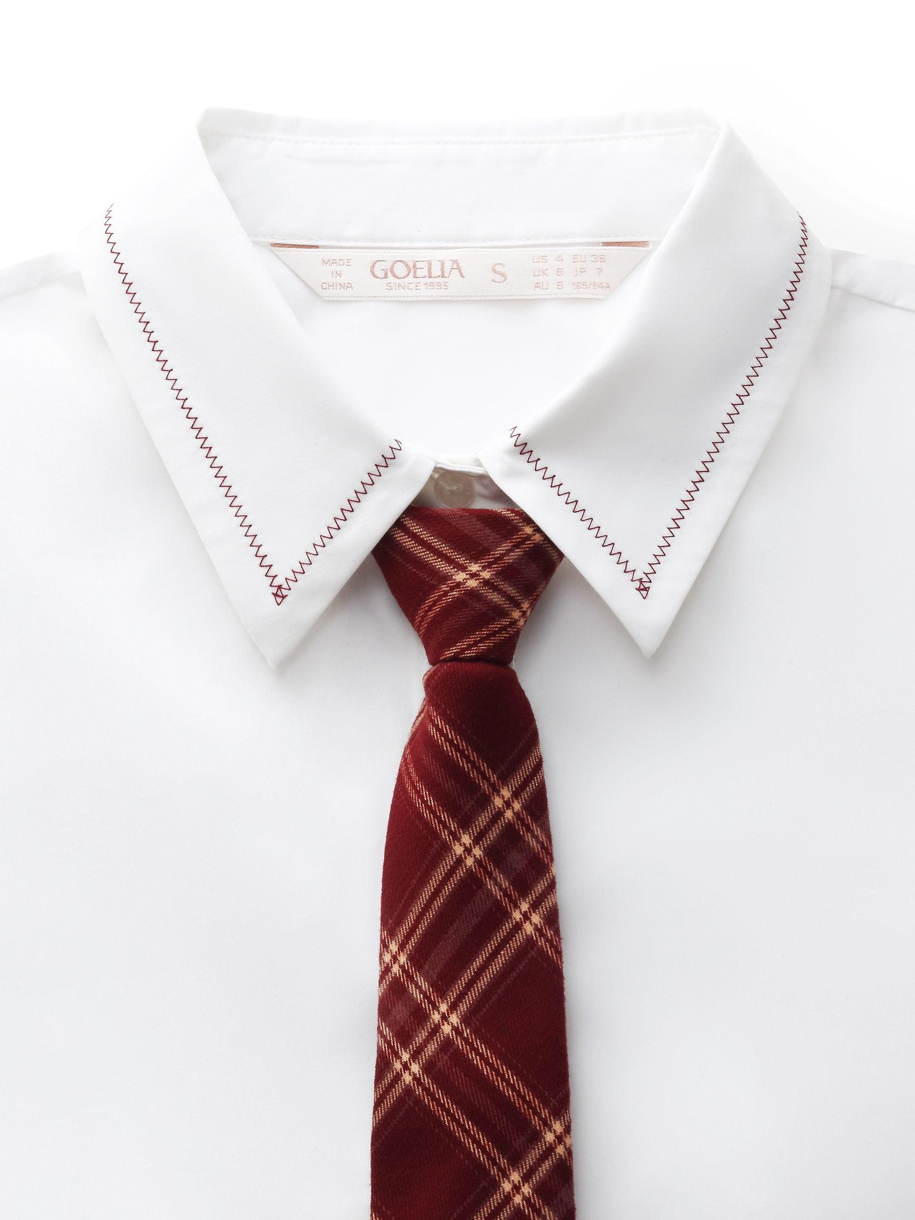 -Cotton blend stretchy fabric -With detachable plaid tie -Slim fit This long-sleeve shirt is made from breathable cotton blend with added stretch for a comfortable, body-skimming fit. It comes with a plaid zip-up tie—no knots needed—for easy styling. A red herringbone stitch at the collar echoes the tie’s color, adding