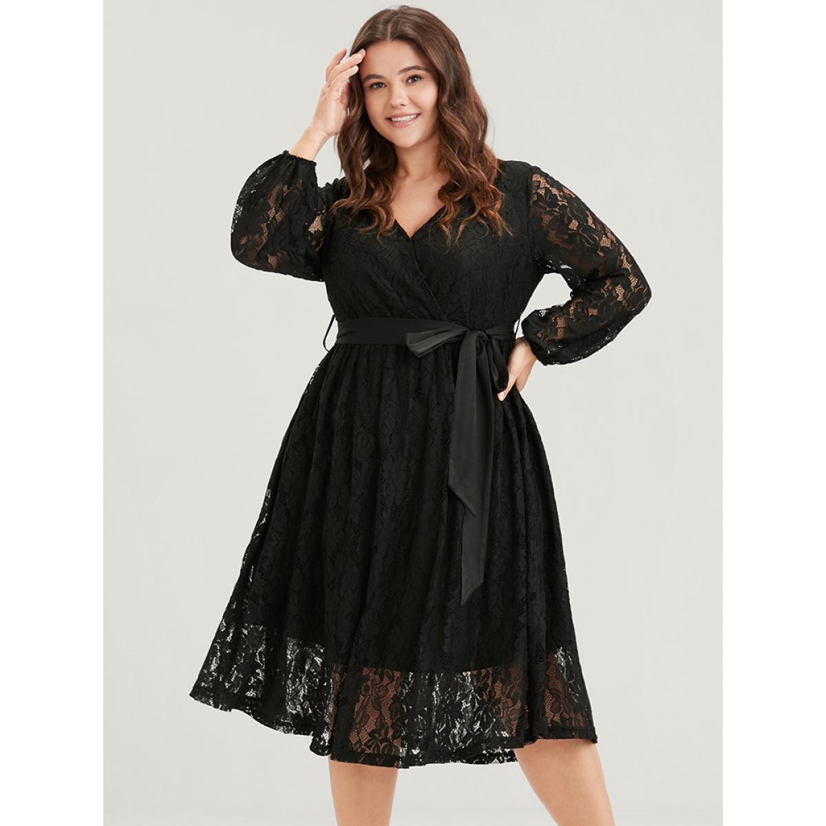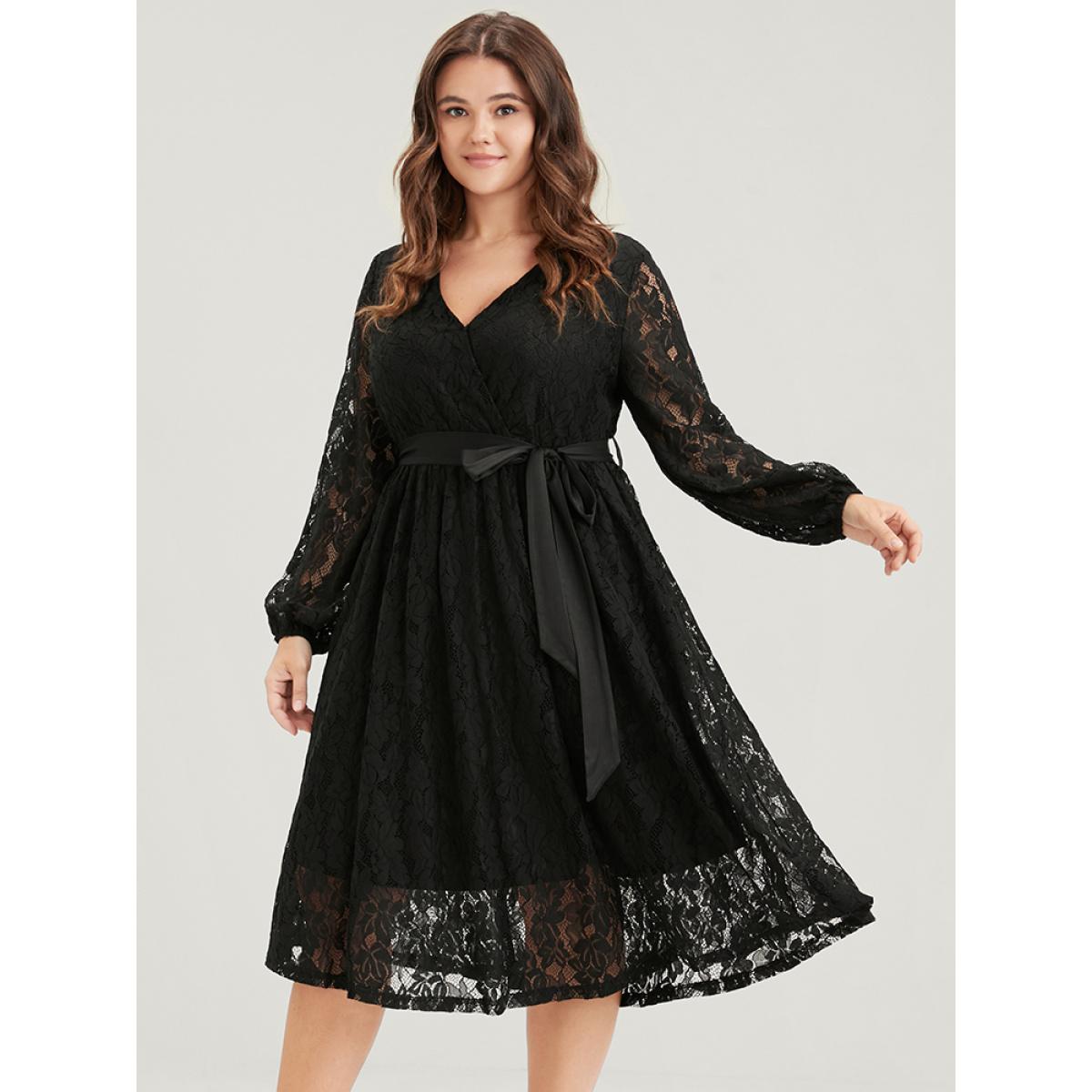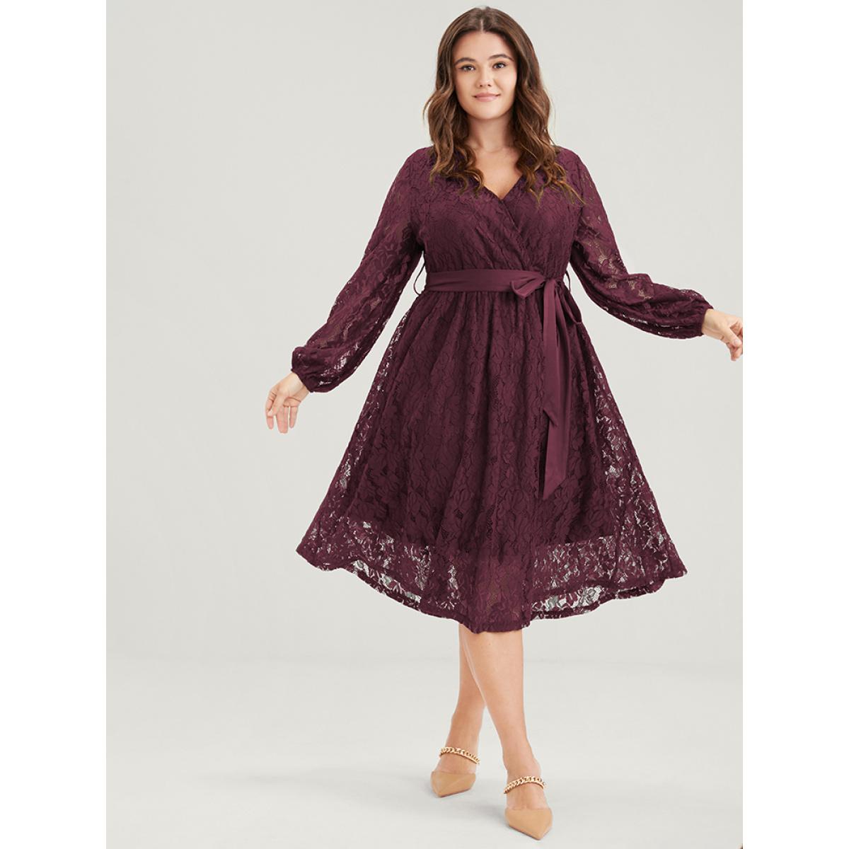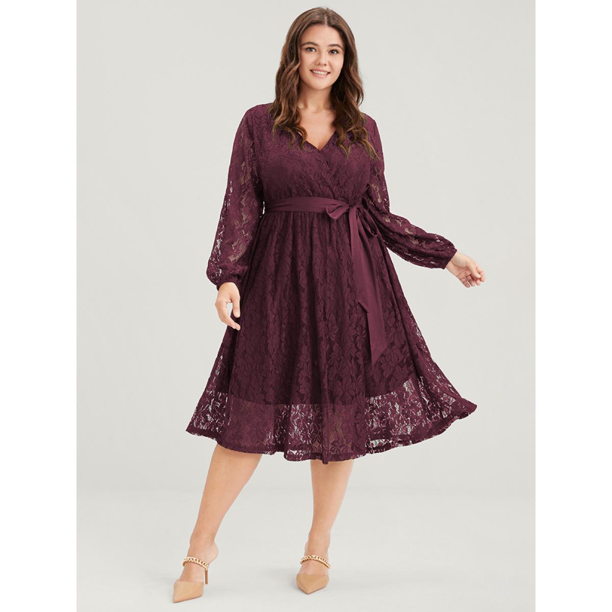 Embroidered Elegant Plus Size Women Going out Plain Midi Dress Ties Slightly Stretchy Lantern Sleeve Long Sleeve V Neck Belt Glamour Dresses BloomChic