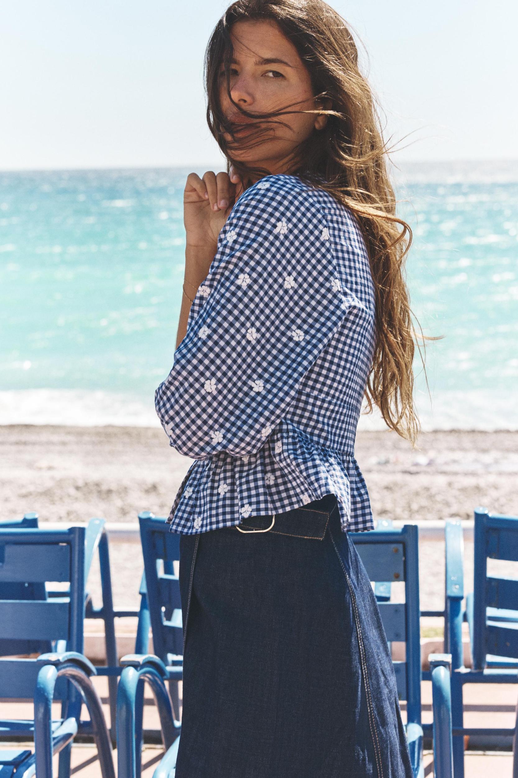 V-neck top. Puffed, below-the-elbow sleeves. Embroidered floral detail. Front closure with covered buttons.
