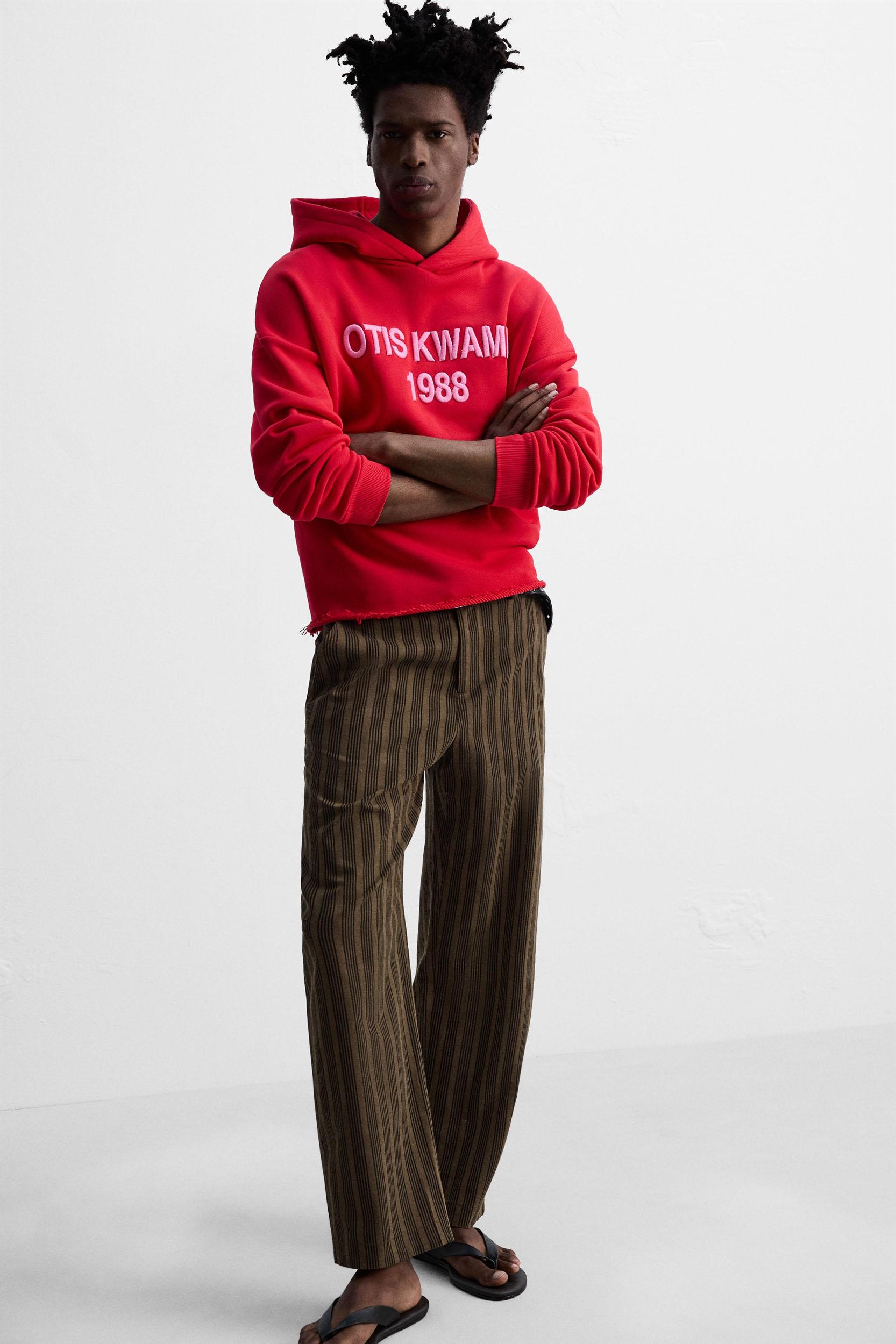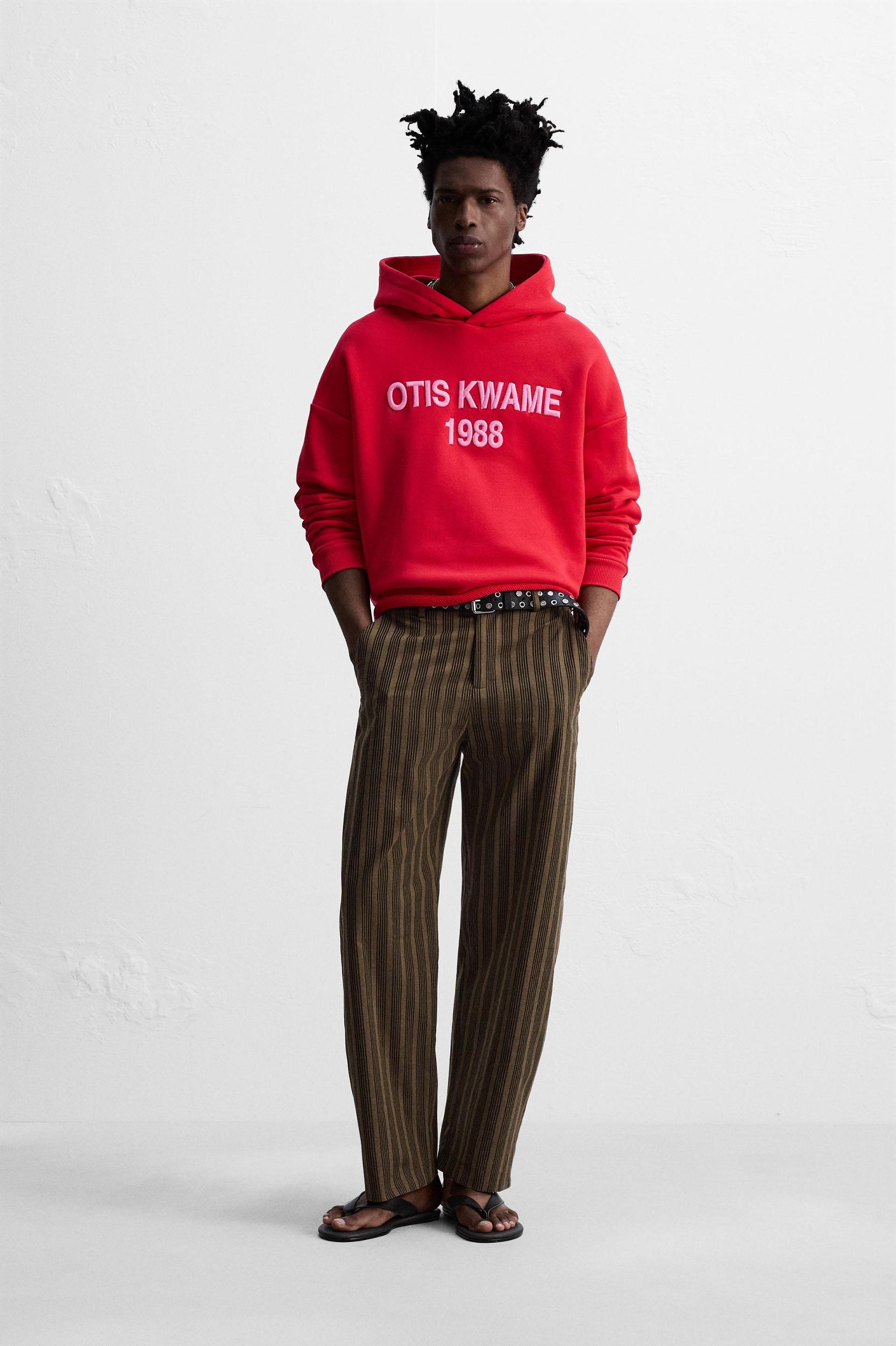 Regular fit hoodie sweatshirt made of cotton fabric with a brushed interior. Hooded collar. Long sleeves with ribbed cuffs. Contrasting combined embroidery on the front. Asymmetrical hem. Special collaboration Zara x Otis Kwame Kye Quaicoe.