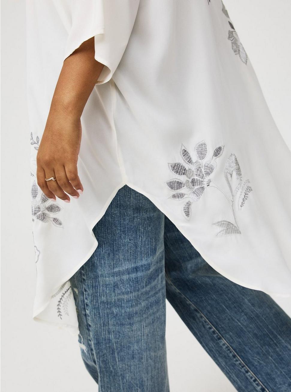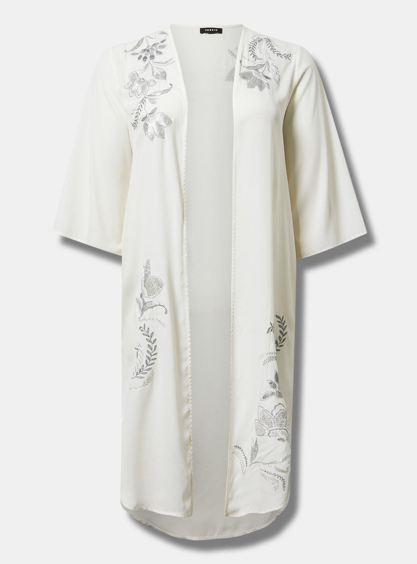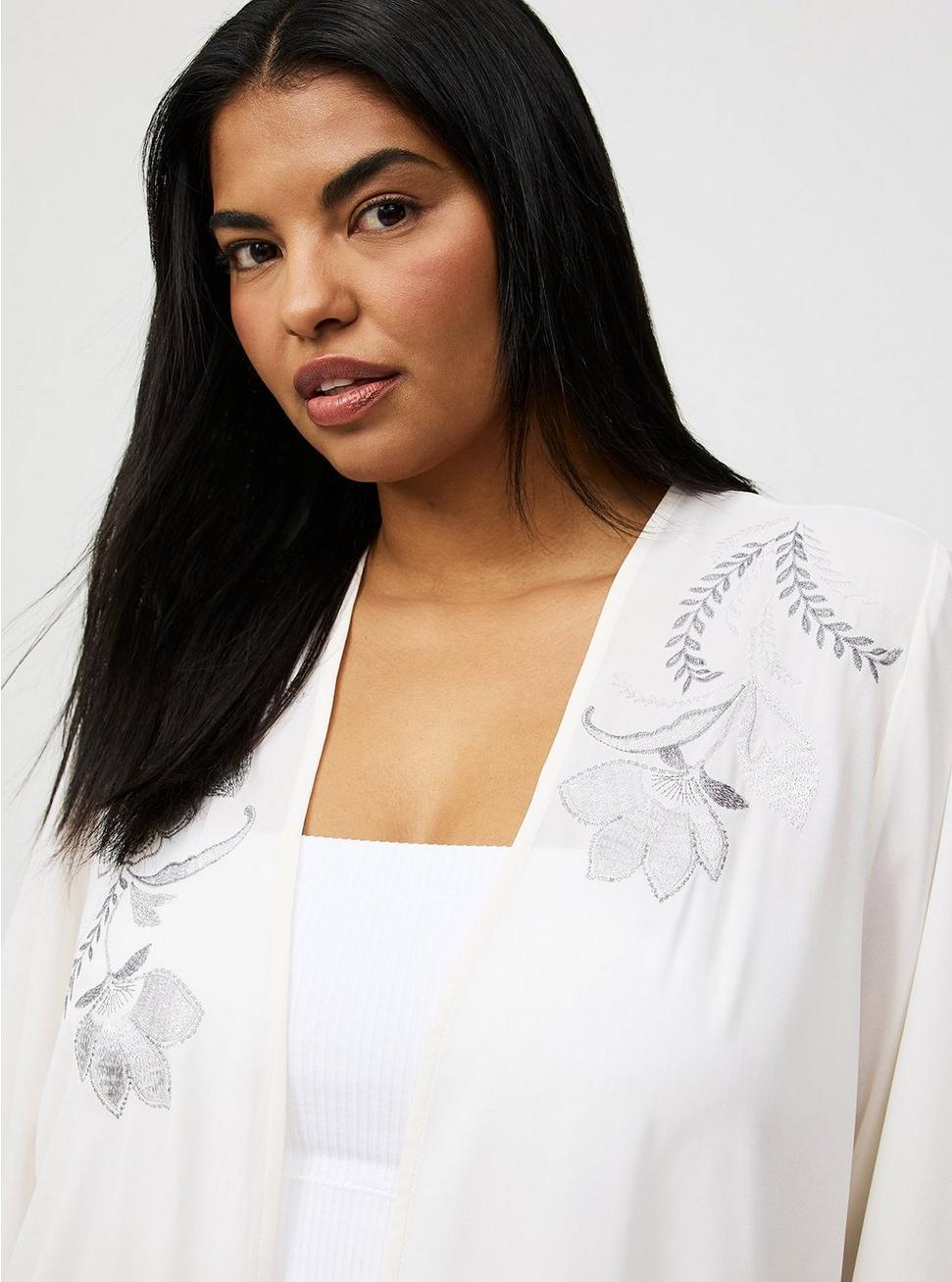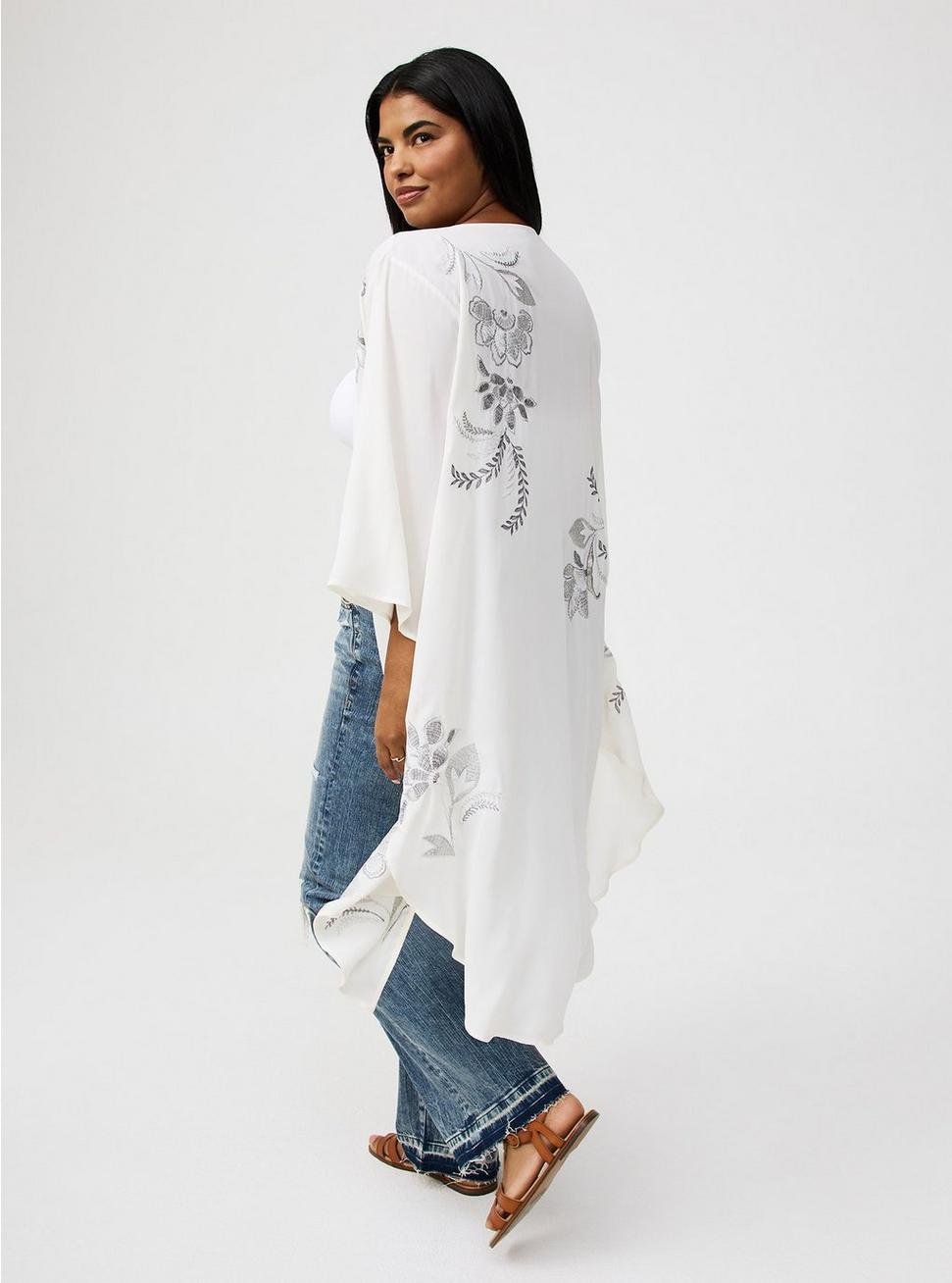 FITMeasures 48'' from shoulder (size 2).Kimono silhouette.MATERIALS + CARETextured chiffon woven fabric: A semi-sheer, lightweight fabric that drapes beautifully.Stretch level: None.100% polyester.Machine wash cold. Dry low.Imported.DETAILSOpen front.Wide elbow-length sleeves.Shirttail hem.