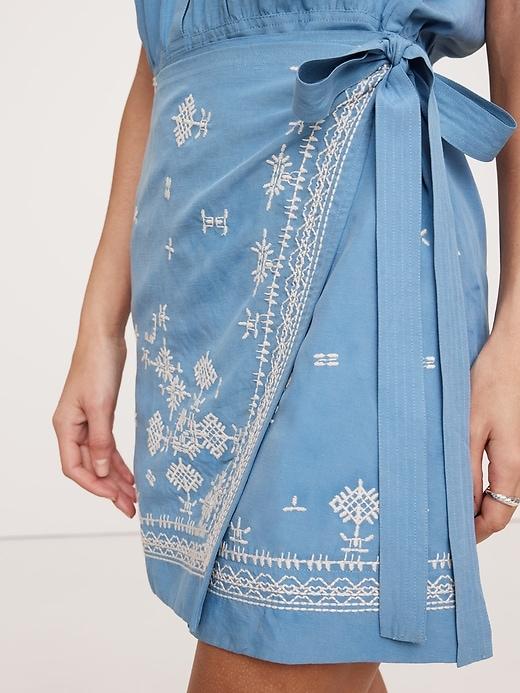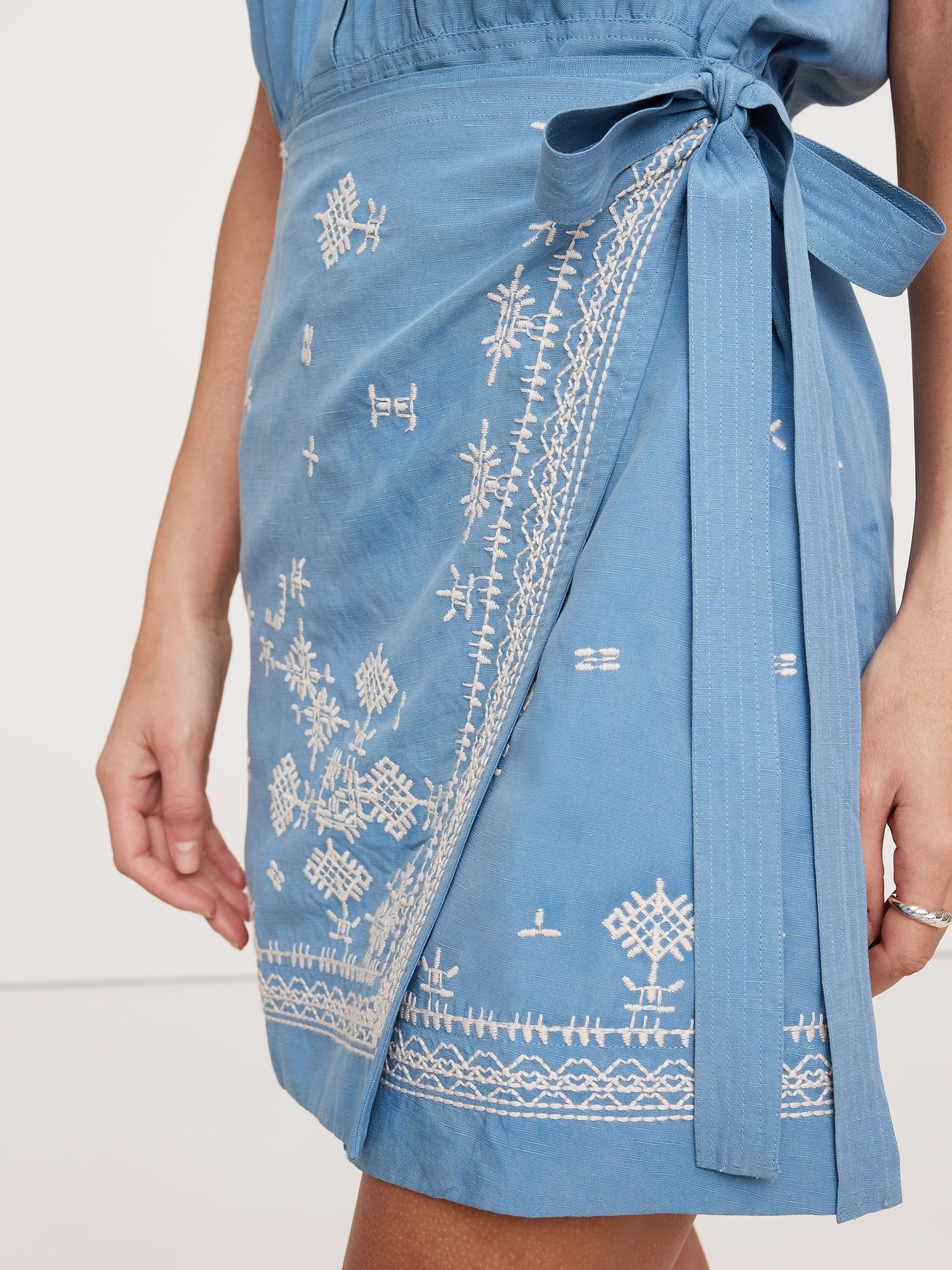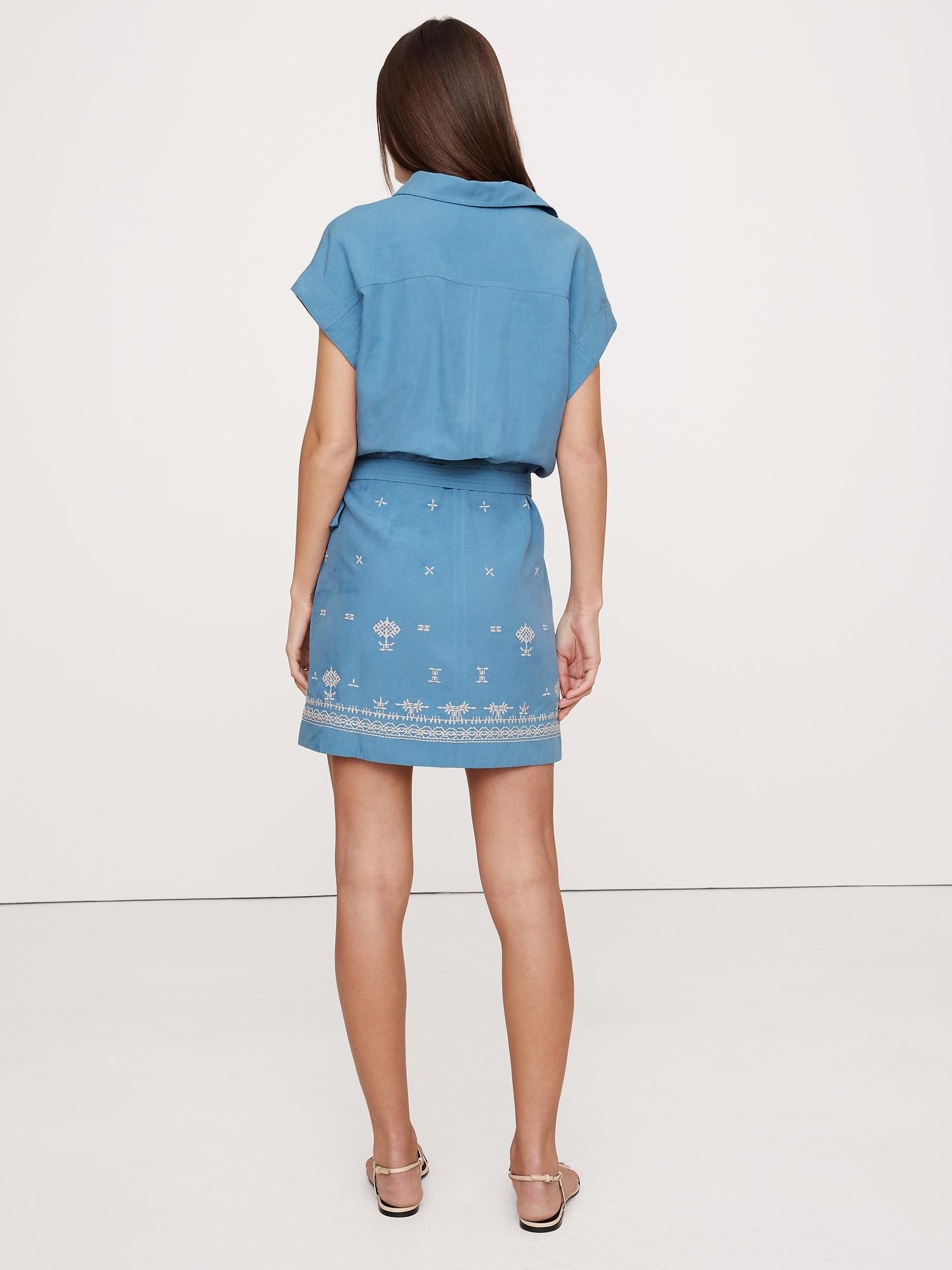 A timeless shirt dress with allover embroidered accents. We kept the fit easy and cut it in a blend of silky TENCEL™ lyocell and linen that looks (and feels) really good on. Relaxed fit: Relaxed fit through shoulders, chest and waist. Straight skirt. Sustainability: Made with TENCEL™ lyocell, a sustainably sourced fiber from responsibly-harvested trees. Point collar with button front. Chest pocket. Wrap skirt with tie closure. Unlined. #743570
