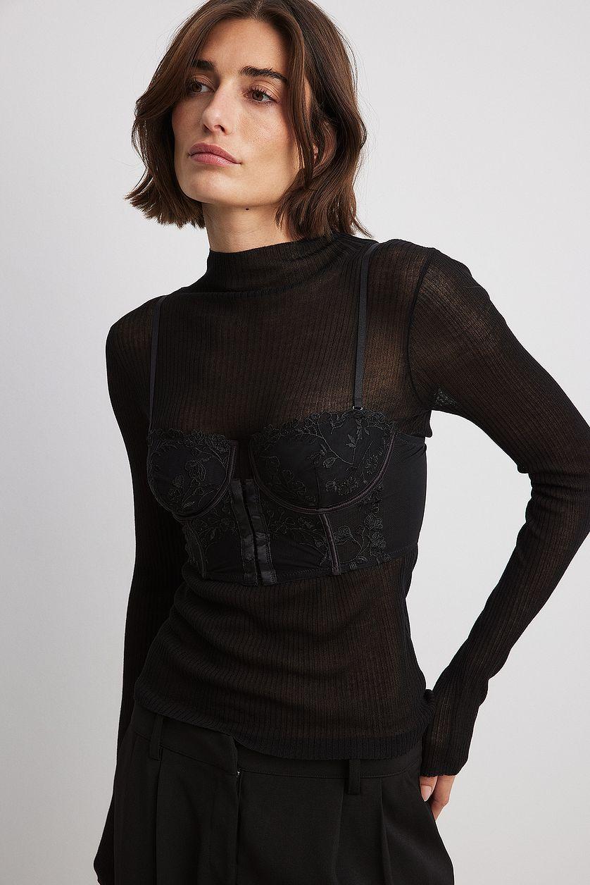 This balconette features underwire cups. It has a hook closure down the front and thin, adjustable, removable shoulder straps. This balconette features a floral, embroidered design.