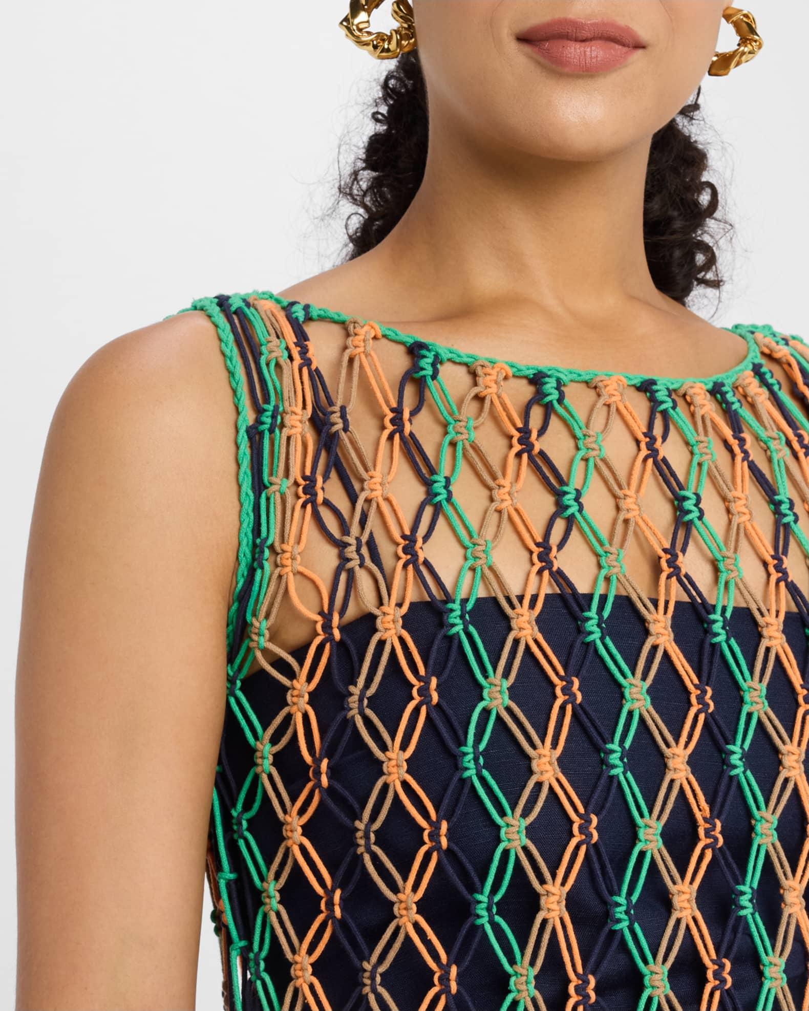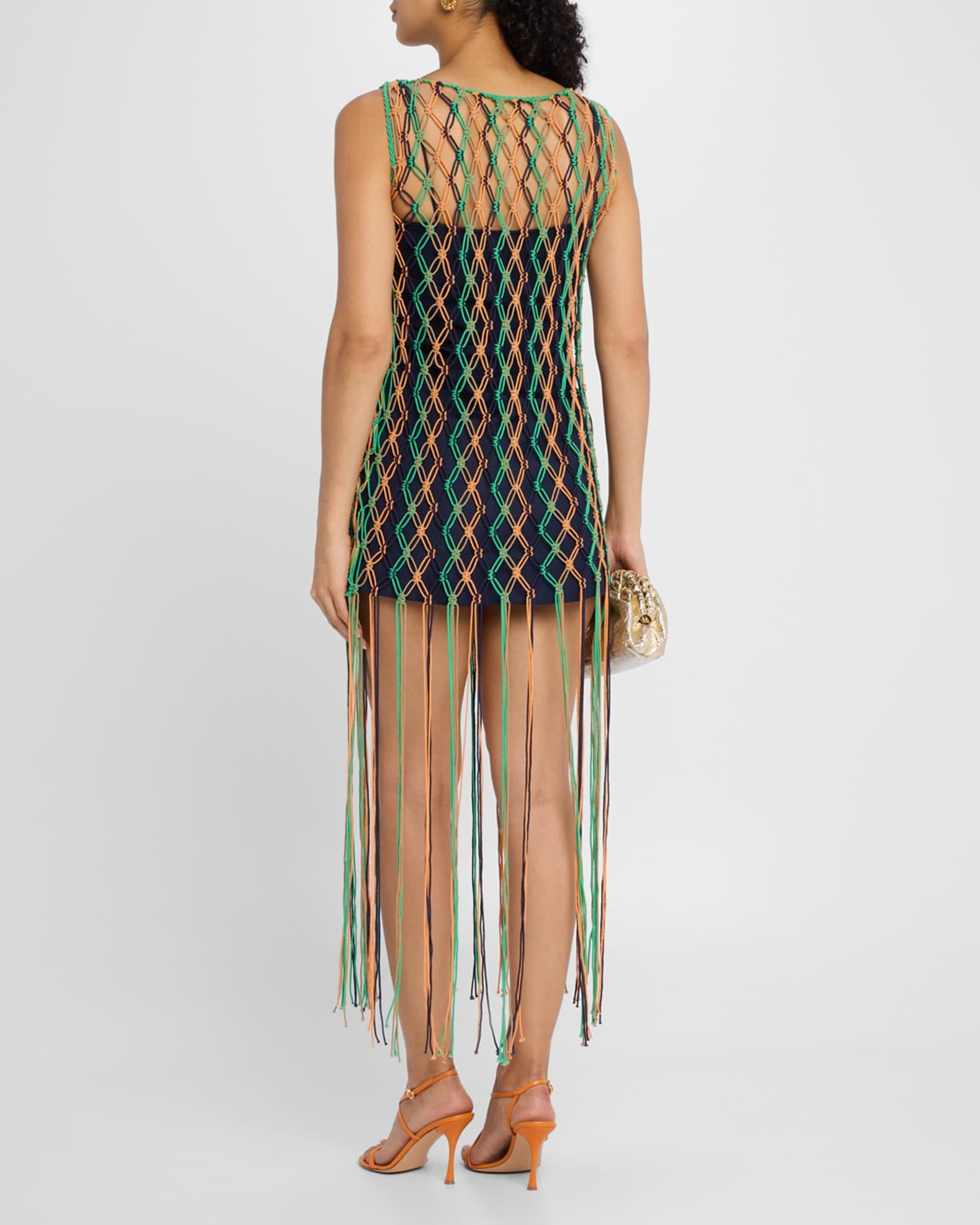 A bold statement piece, the "Emelia" dress by Significant Other features woven multi-color macramé and is finished with a flowing, fringe hem. Includes a separate slip dress. High neckline Sleeveless Figure-hugging silhouette Hem falls below the knee Invisible back zip Viscose/linen Lining: Cotton Hand wash or dry clean Imported