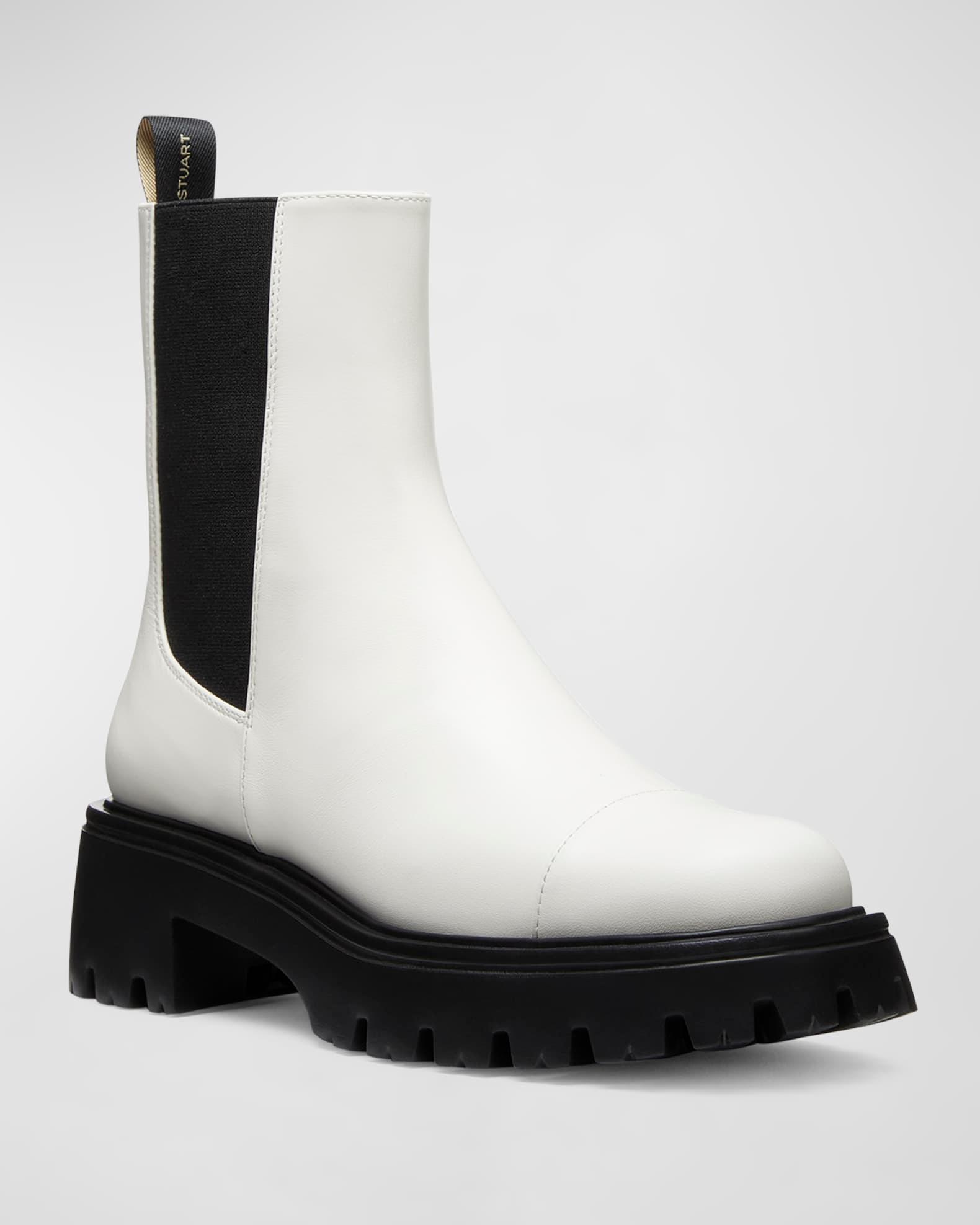 Stuart Weitzman "Emerson" Chelsea boots in calf leather, polyester, and elastane 2.00 in / 50 mm block heel Round cap toe Gored sides Pull-tab on back Pull-on style Lining: Acetate Leather outsole Spot clean Made in Spain Size Note: Item runs large, consider ordering a size down.