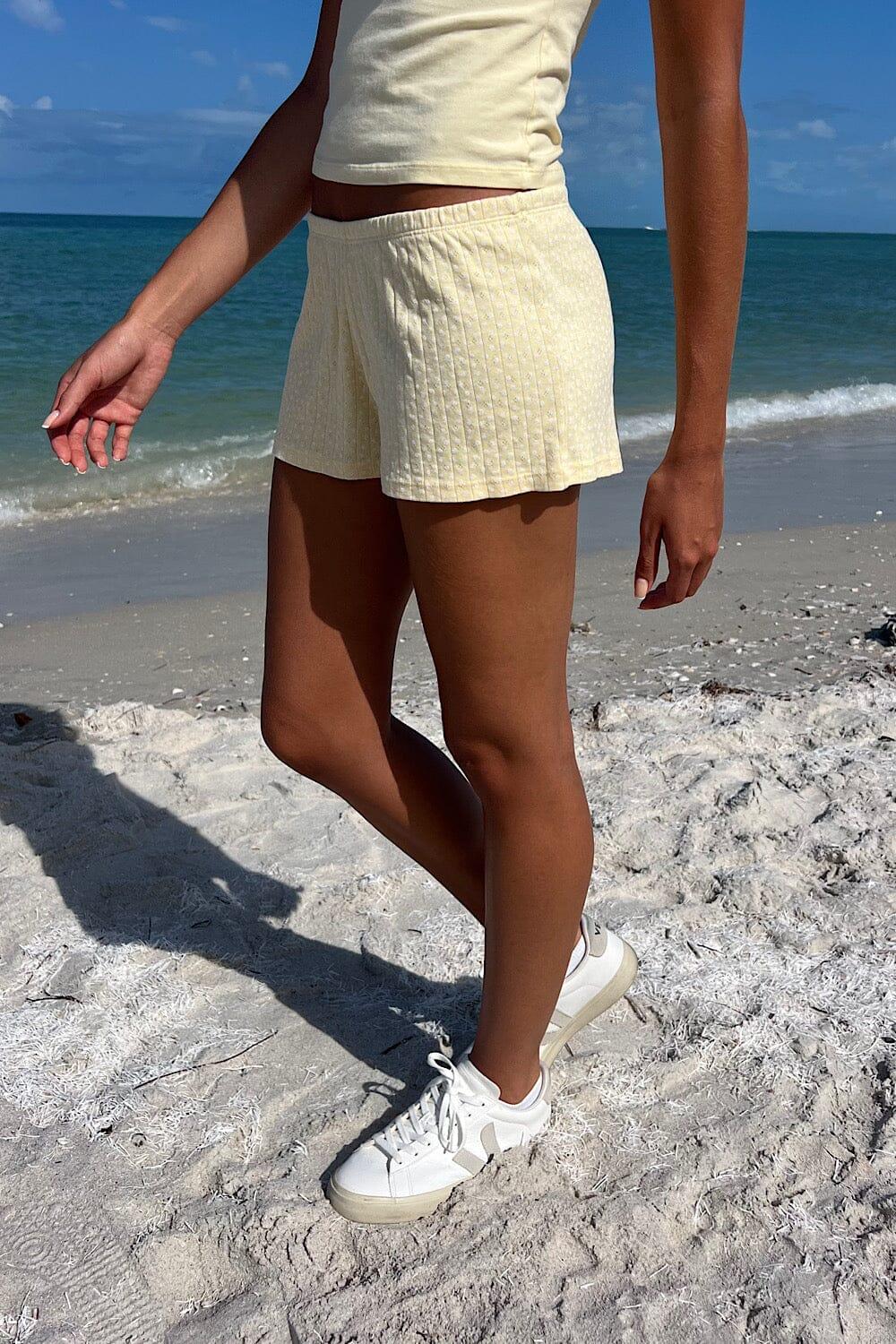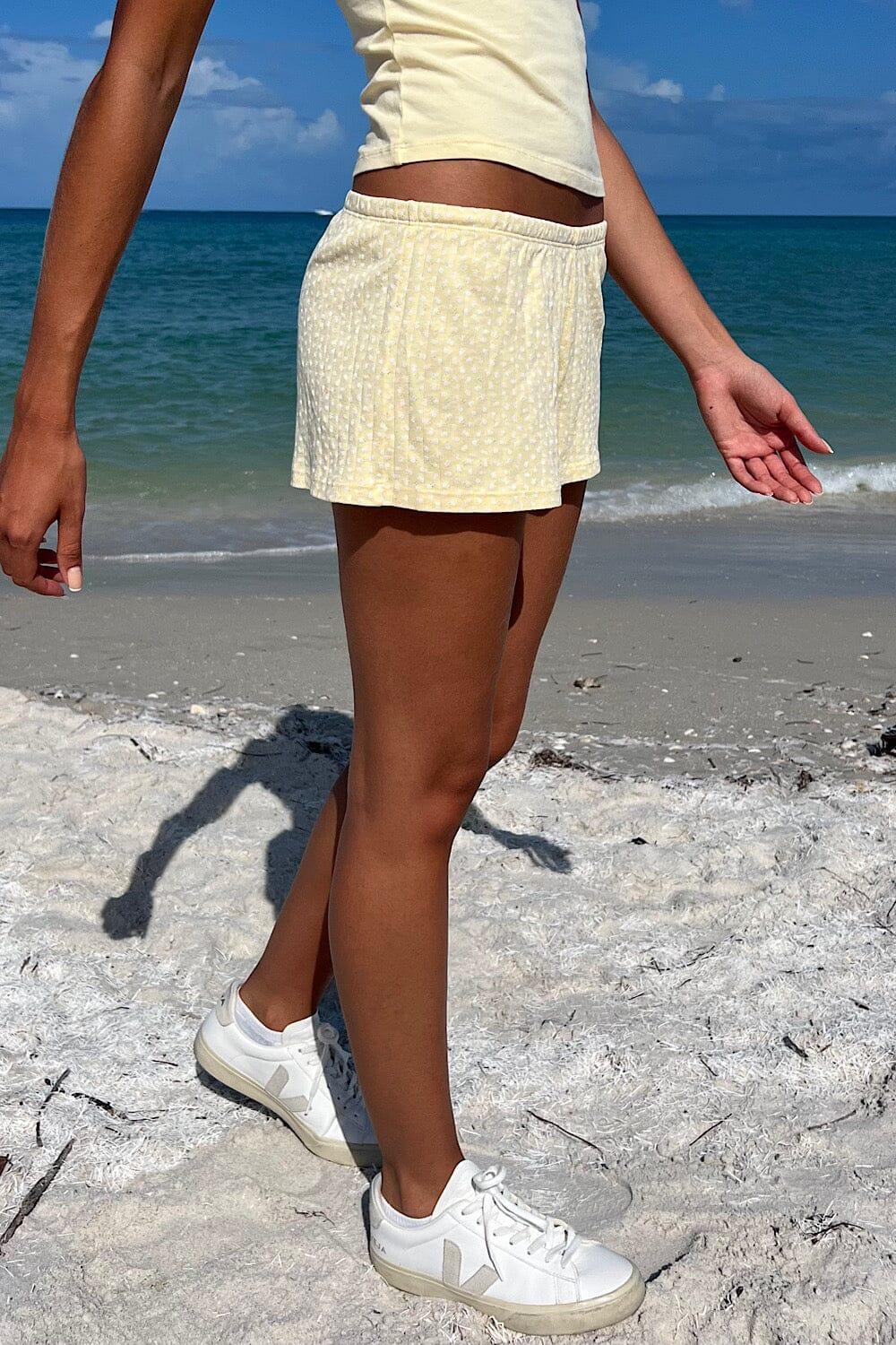 Super soft cotton sweatshorts in pastel yellow with white eyelet floral print and an elastic waistband.Fabrics: 100% cottonMeasurement: 9.5" (24cm) rise, 2" (5cm) inseam, 28" (71cm)waist (stretches)Made in: Italy