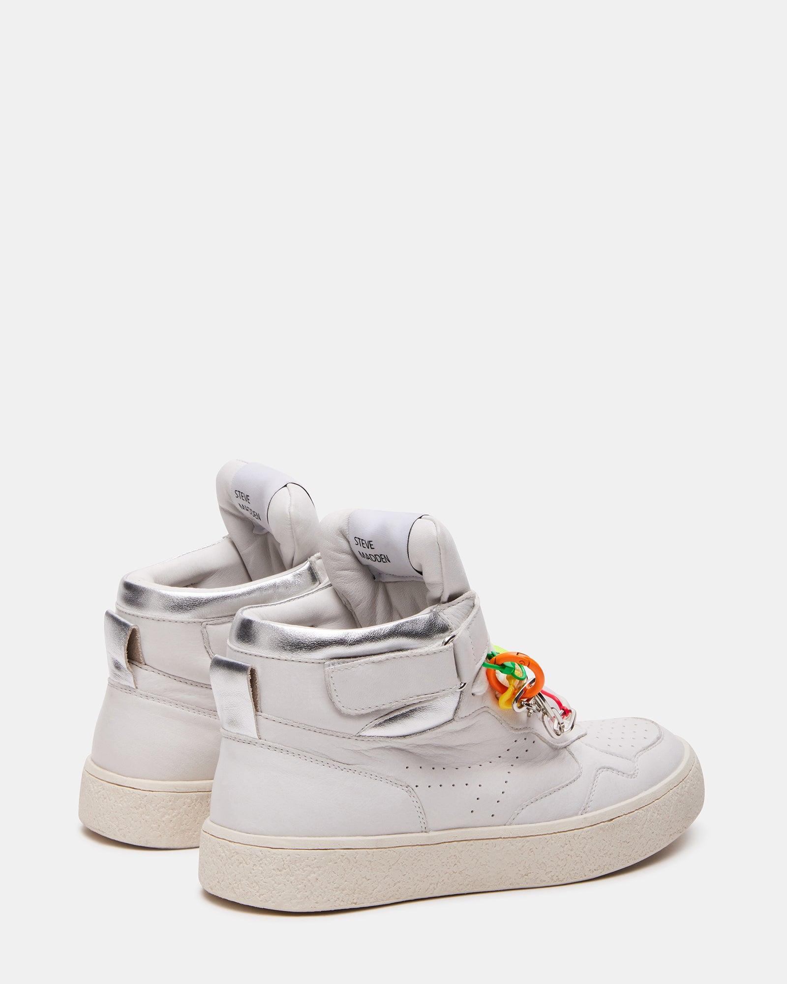 SPORTY + QUIRKY + FUN The EMILEE sneakers feature a padded collar and flatform sole for a substantial, structured silhouette. A selection of cheerfully mismatched charms and chains accent the laces for a pop of color. High top flatform sneaker with charms Laced closure with stay-put ankle straps Contrast accent panels at back Perforated details at front and sides Crepe texture low flatform sole Colorful charms Padded ankle collar 1 inch heel height Leather upper material with charms Textile and synthetic lining Synthetic sock Synthetic sole Imported