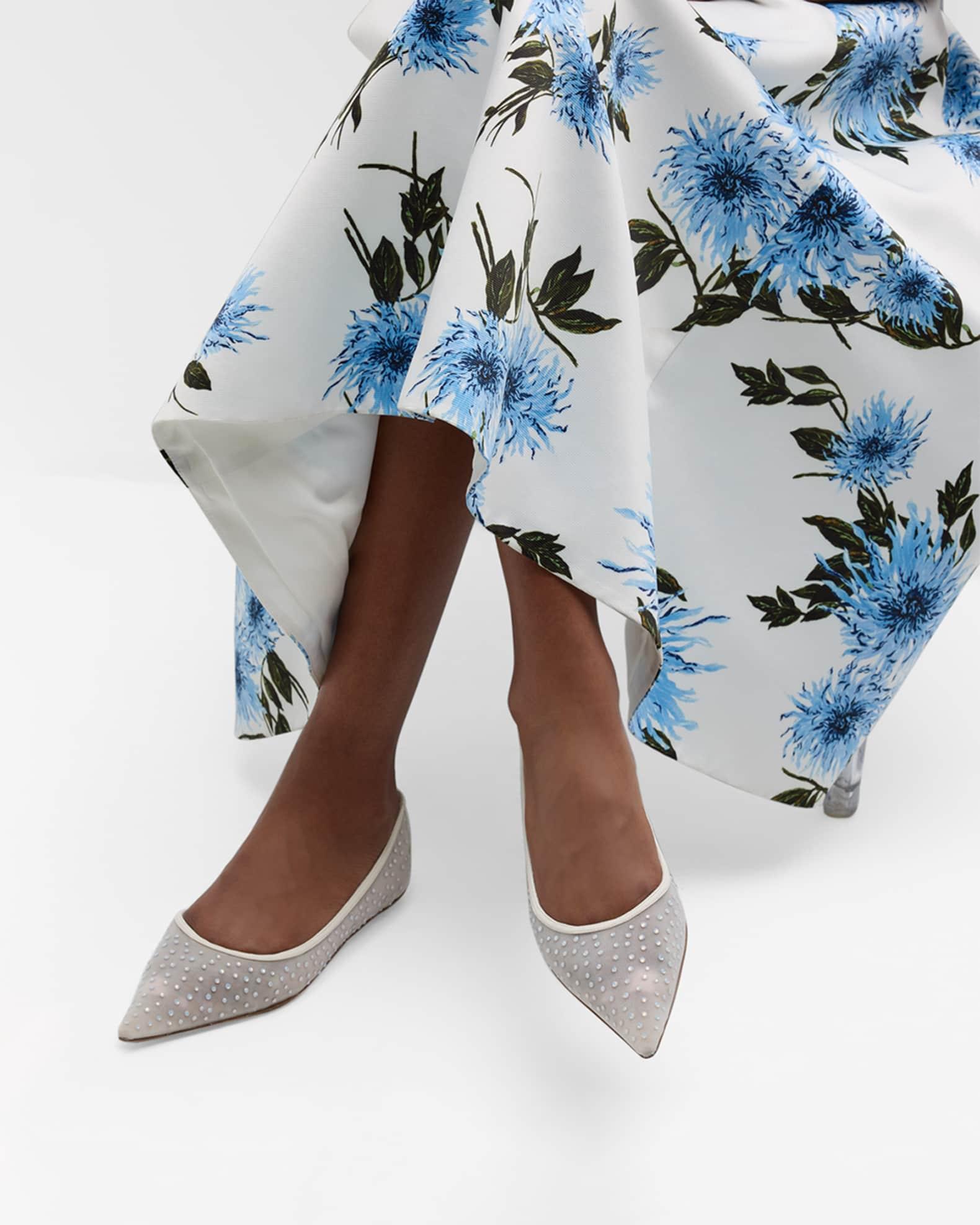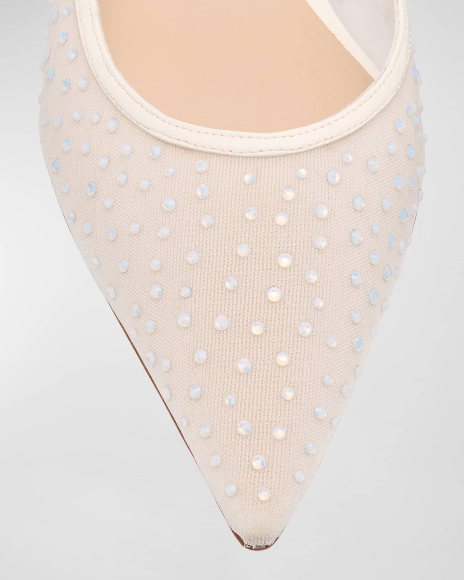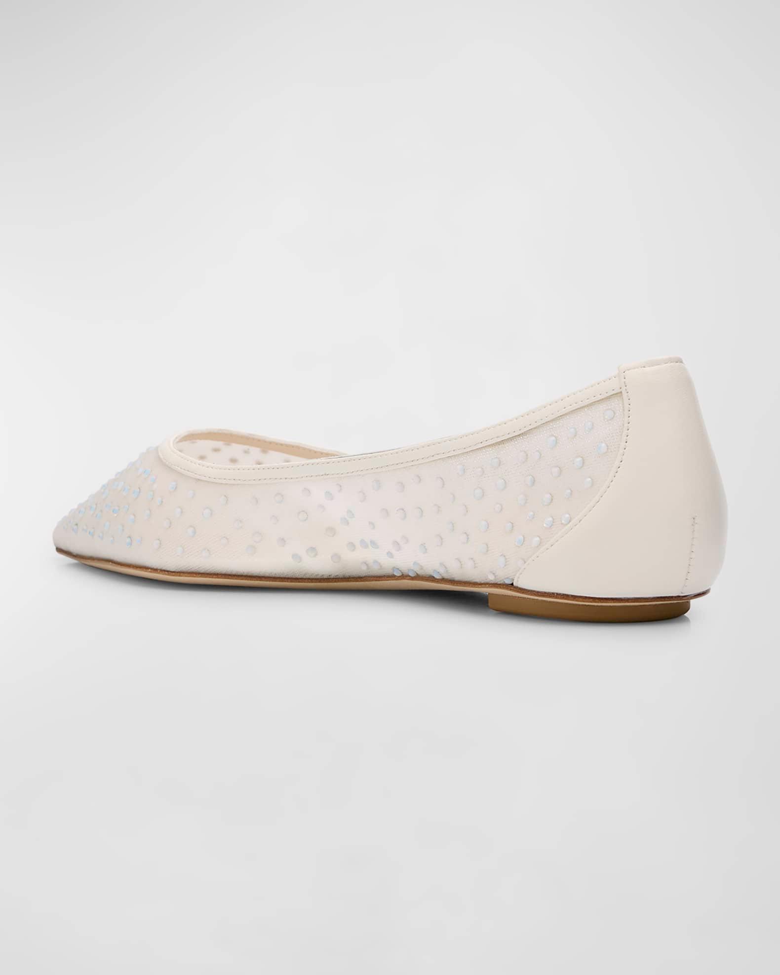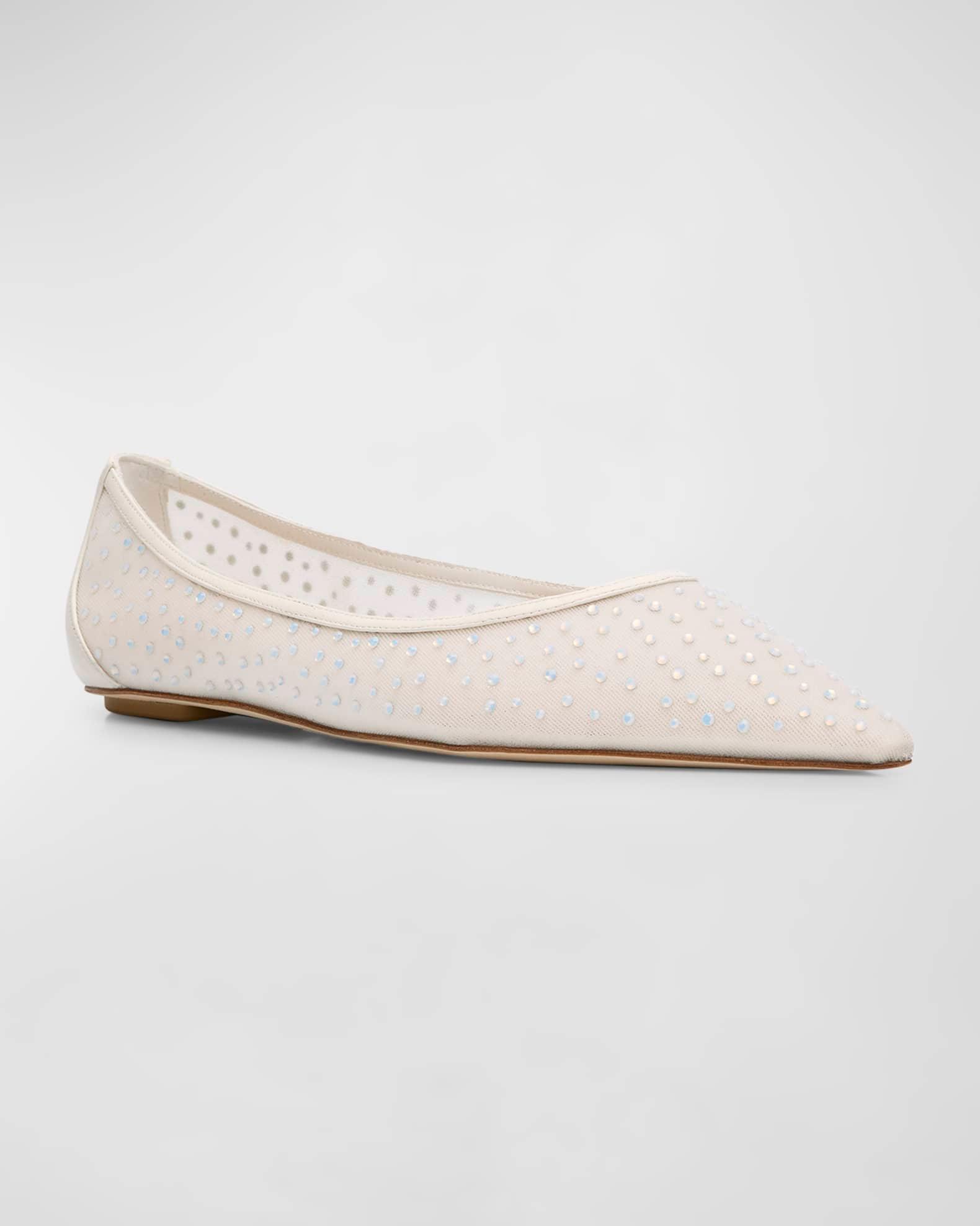 Stuart Weitzman "Emilia" crystal-studded sheer nylon mesh ballerina flats with leather trim 0.17 in / 5 mm flat heel Pointed toe Slip-on style Leather outsole Lining: Leather Spot clean Made in Italy