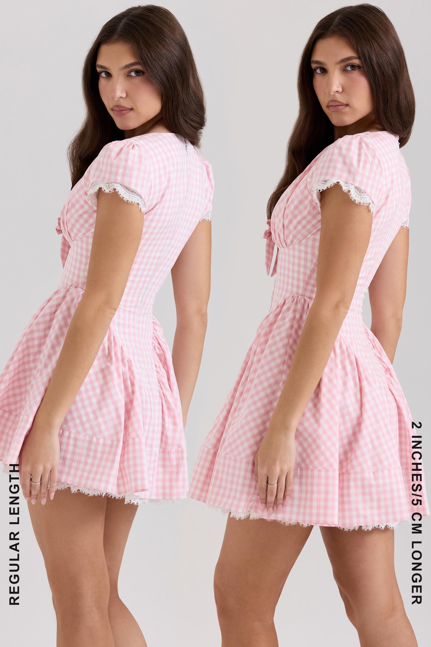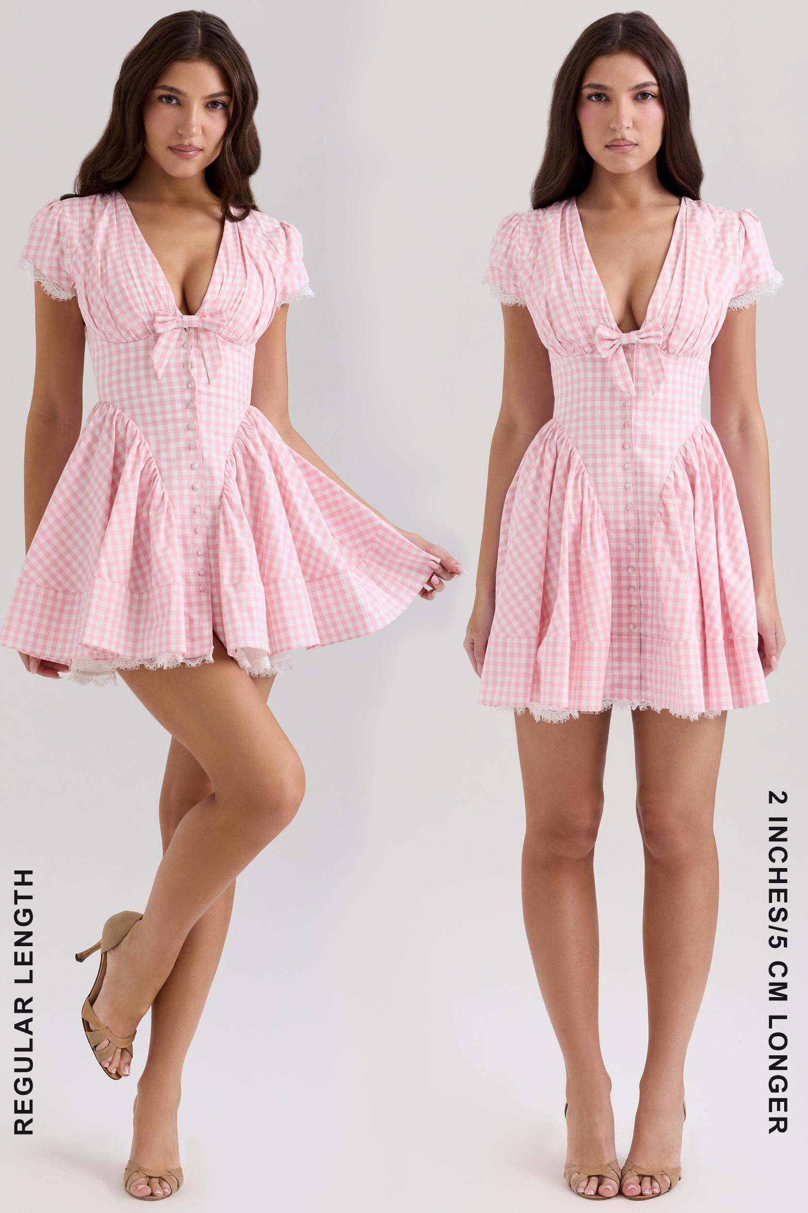 Transport yourself to spring picnics in the sun with the playful charm of 'Emiliana'. Made from stretch cotton printed with the prettiest gingham check, this beautiful mini silhouette embodies a romantic point of view that's so suited to the season. The deep plunging neckline is beautifully gathered for a flattering fit around the bust that's framed with cute cap sleeves and the bow in the middle. Boning continues to contour the body and flatter the waistline while curved seams at the hips gently define the volume skirt.