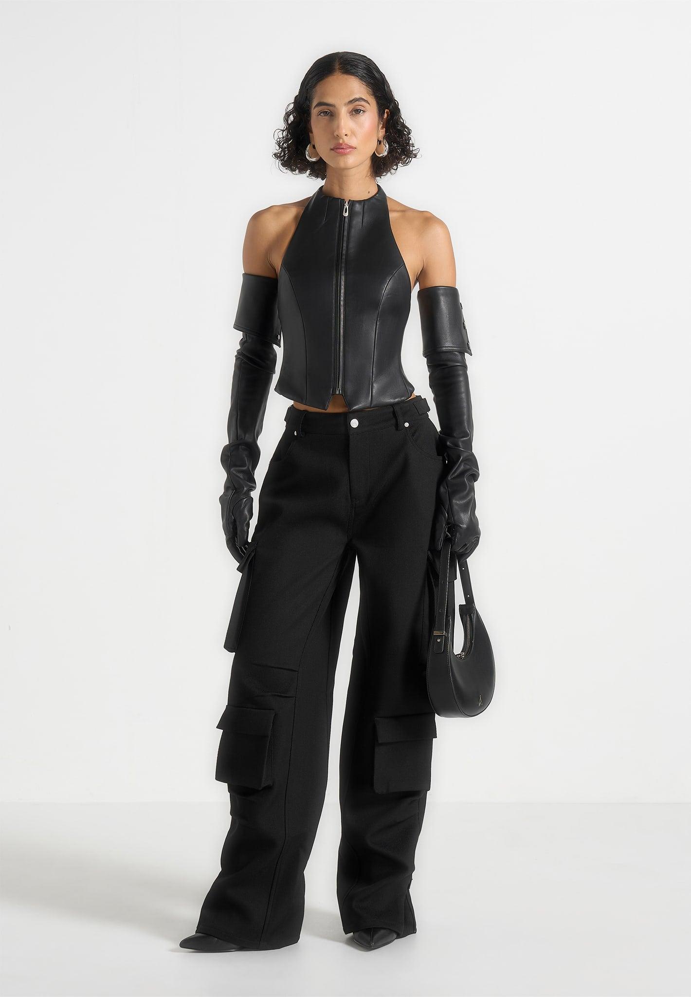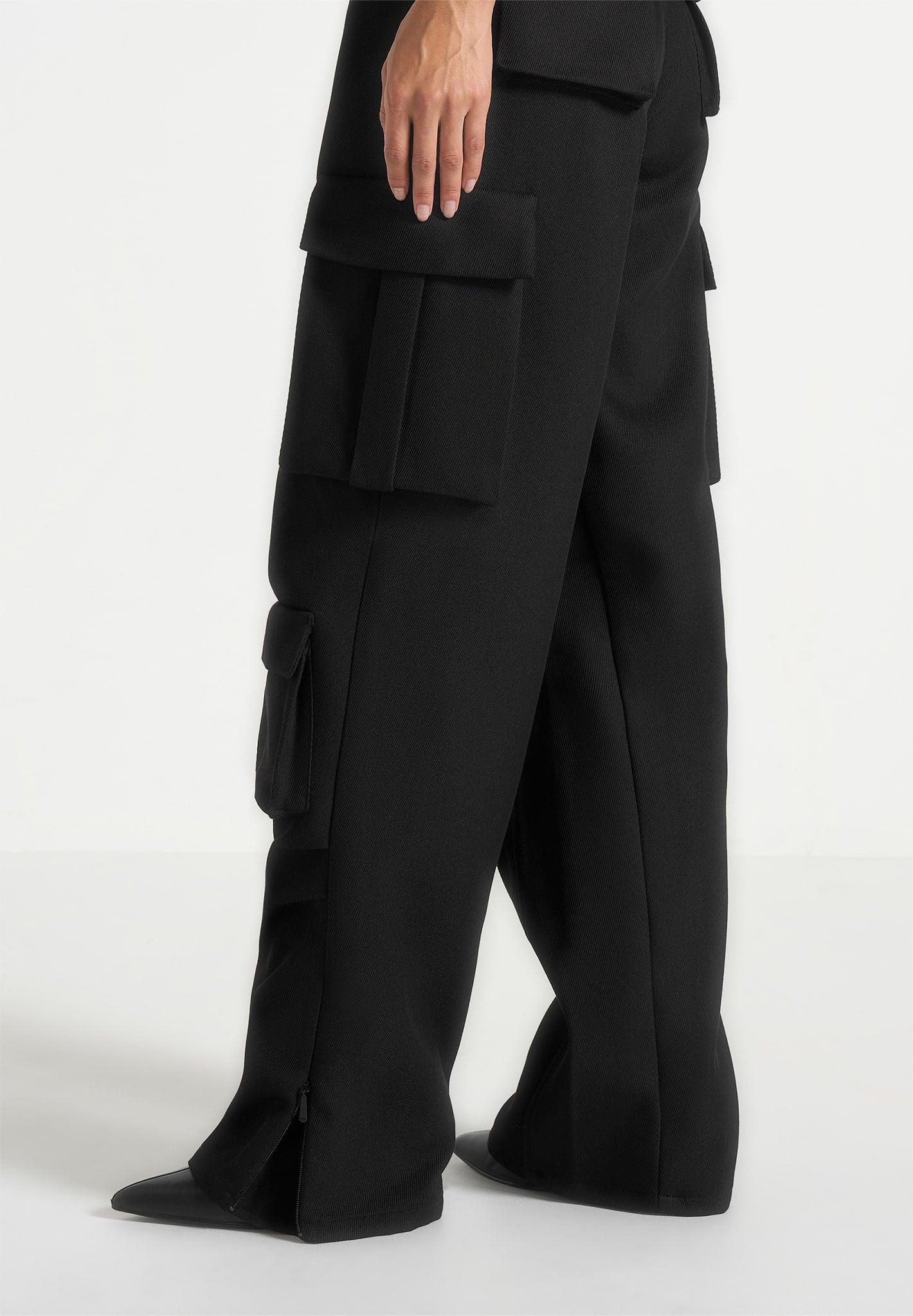 These wide-leg cargo trousers merge elevated fabric with utilitarian function. Crafted from a satin-finish woven material, they feature a mid-rise fit with a clean waistband, signature branded hardware, and multiple flap pockets for practical edge. The full-length silhouette is relaxed yet structured, designed to bring movement and statement styling to both casual and polished looks. Mid-rise waist with tailored waistband and belt loops Wide-leg cut for a relaxed, elongated silhouette Shine-finish satin fabric for a refined, contemporary feel Flap pockets at sides and back for a utility-inspired look Silver Manière De Voir embossed button for subtle signature branding