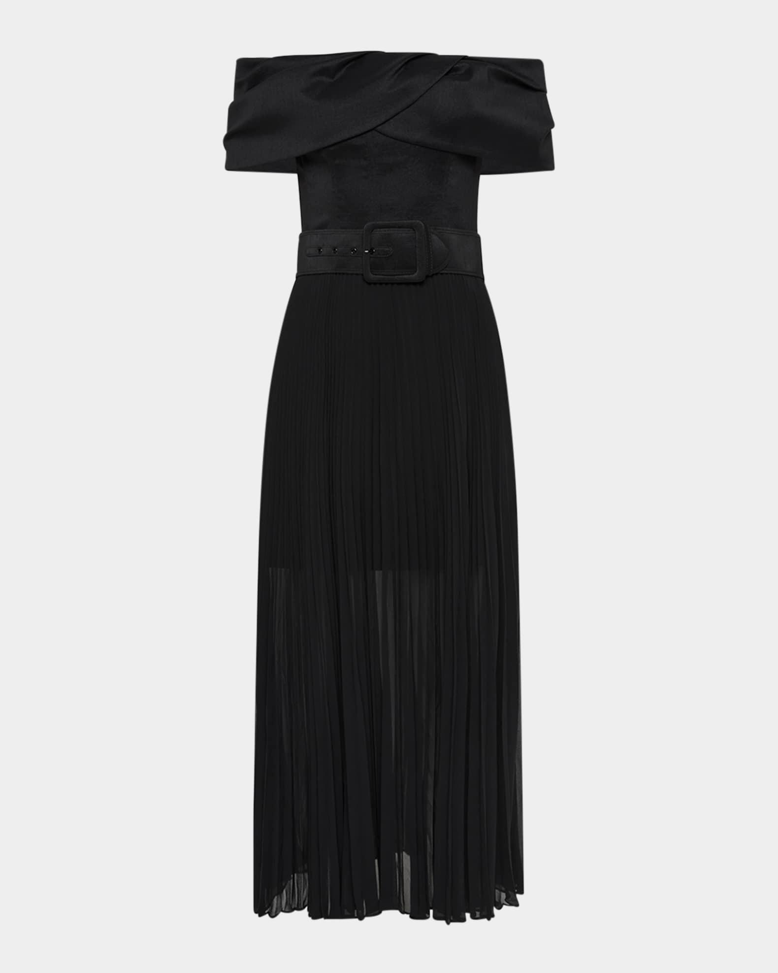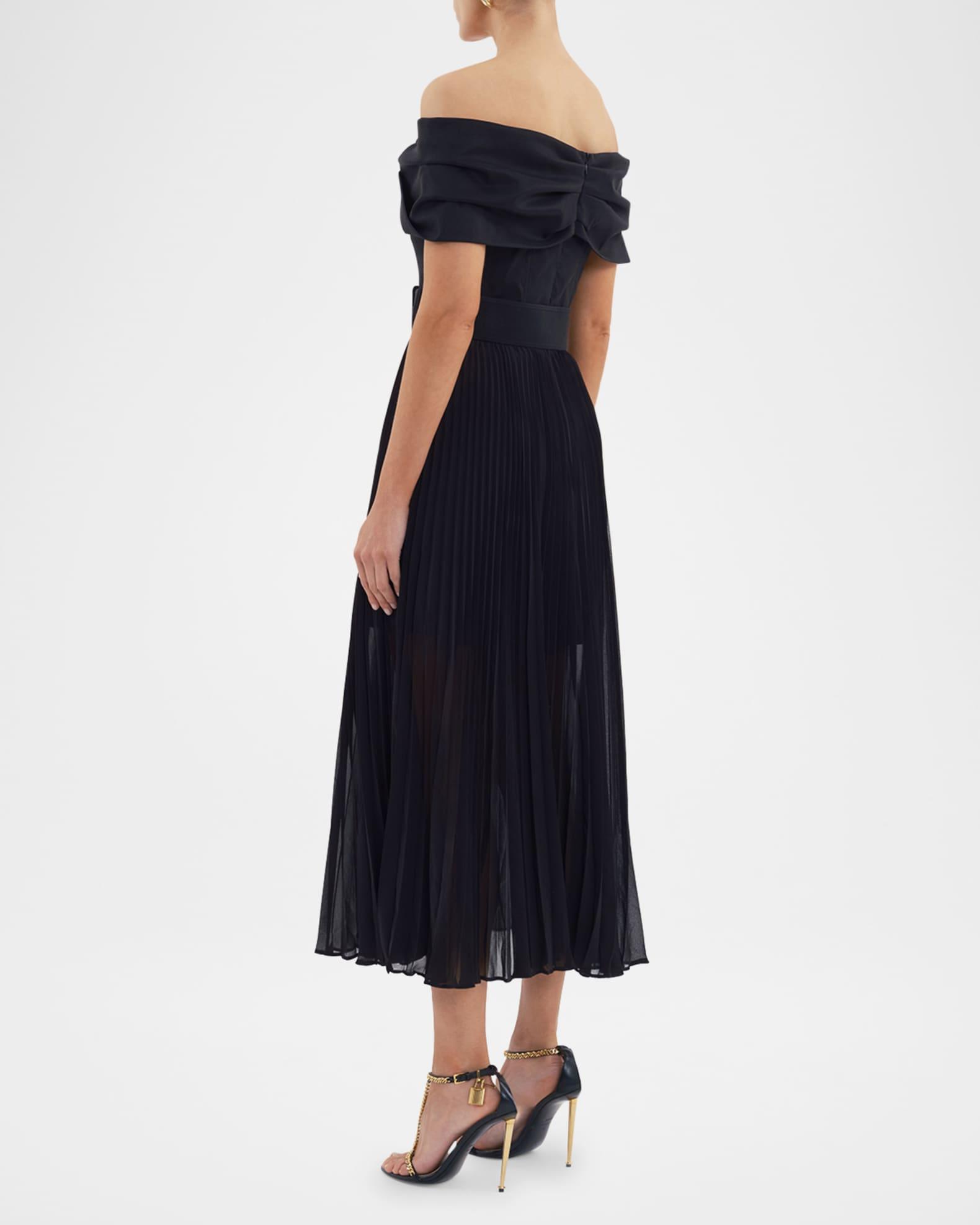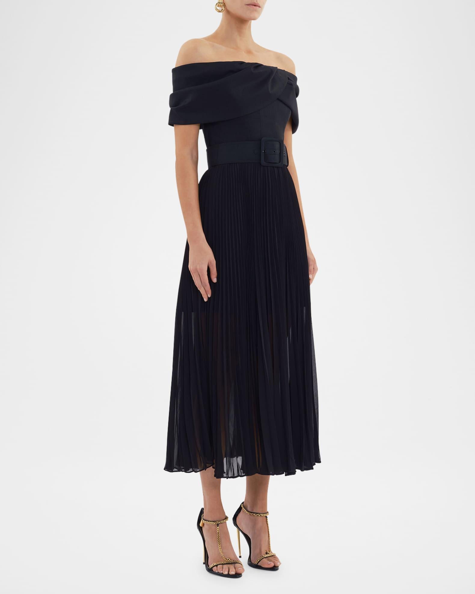 REBECCA VALLANCE "Emilie" pleated midi dress with draped sash detail Off-the-shoulder neckline Short sleeves Belted waist Hem falls below the knee A-line silhouette Invisible back zipper Polyester/nylon/polyamide/elastane Imported Model is 5'10"/177cm.