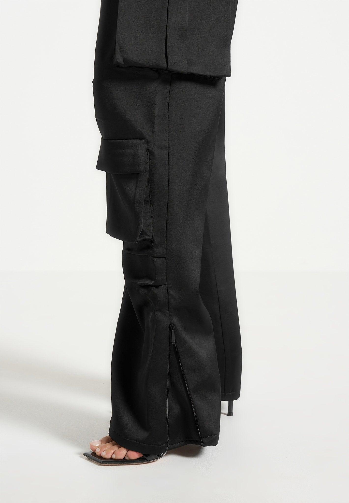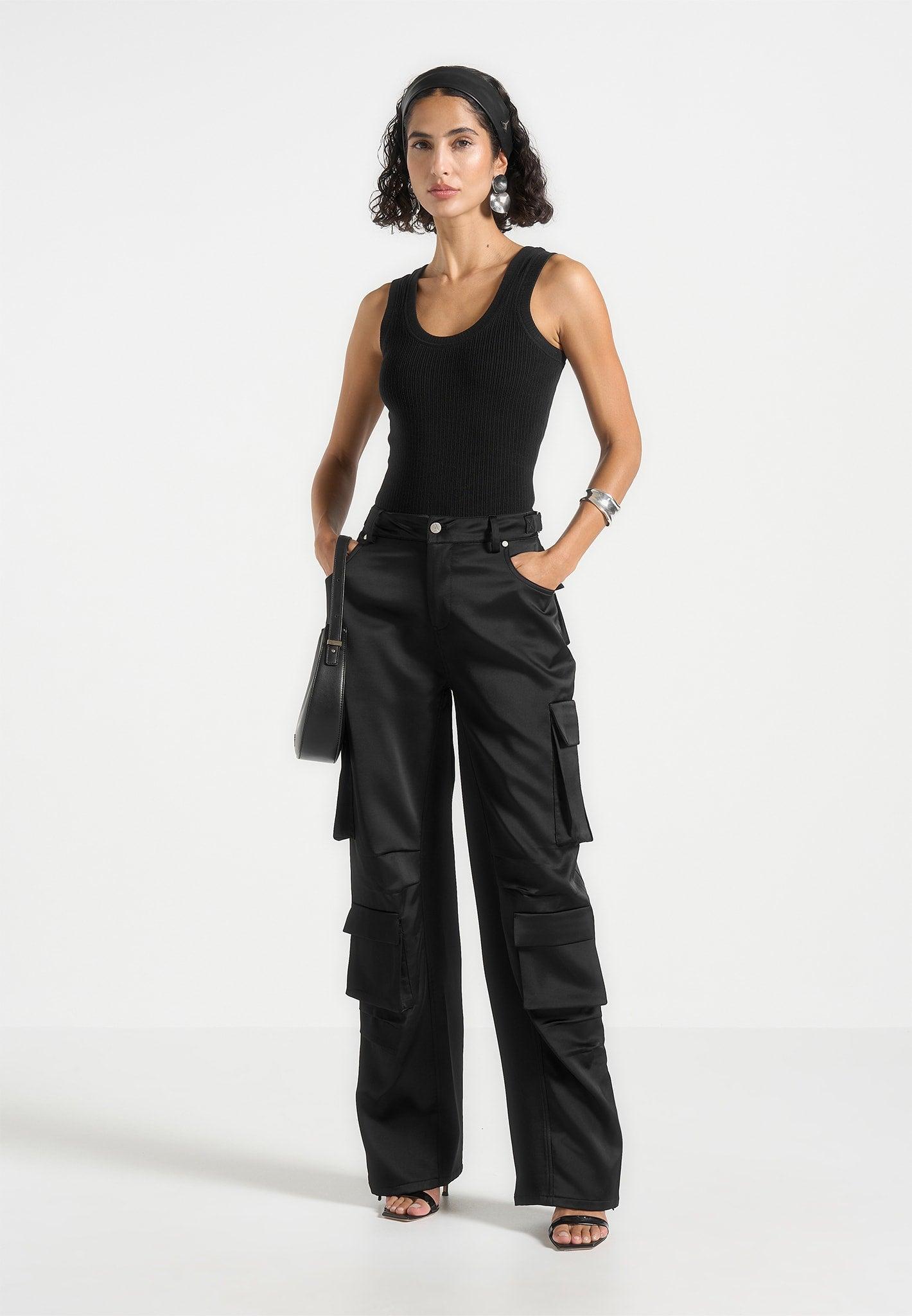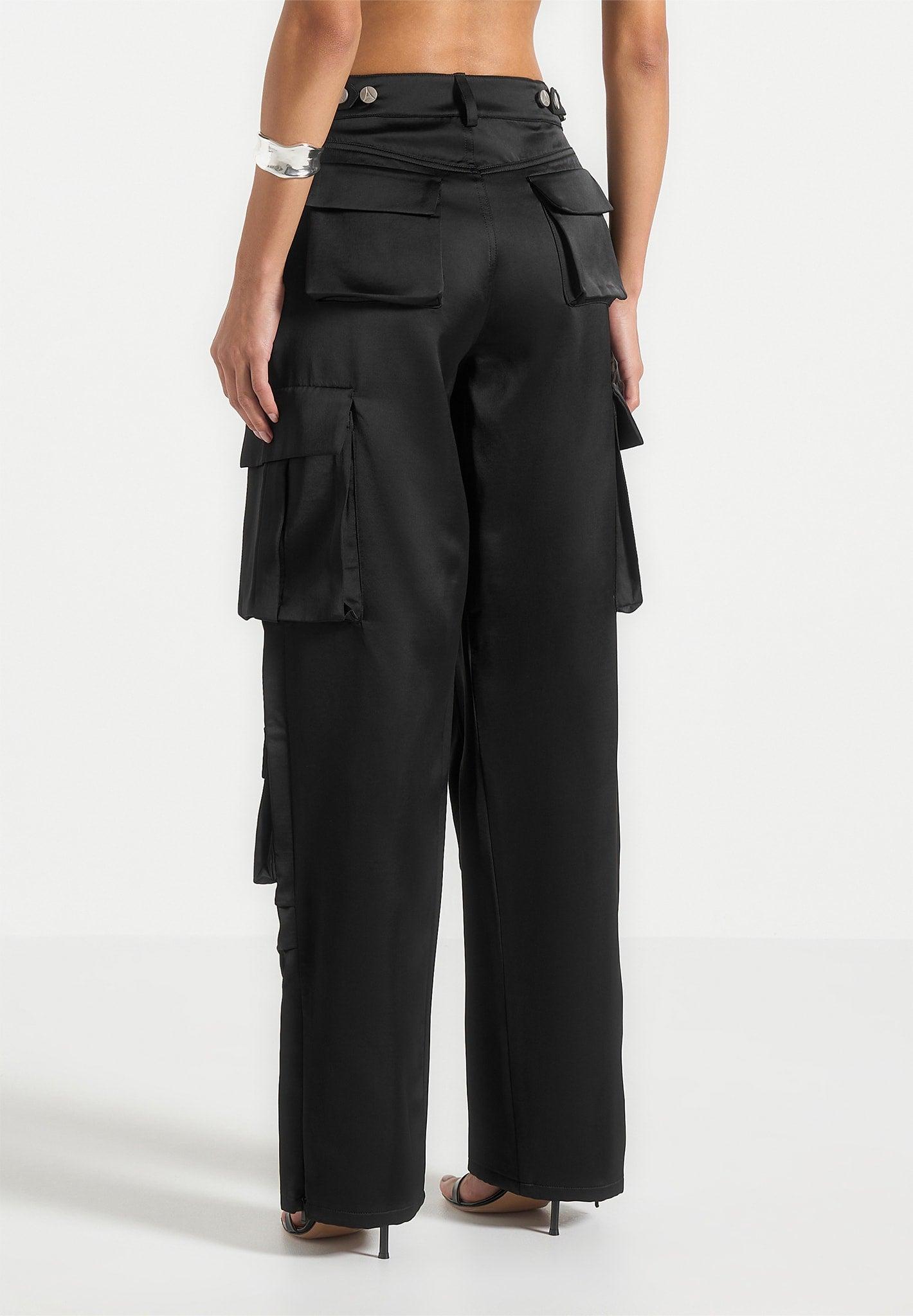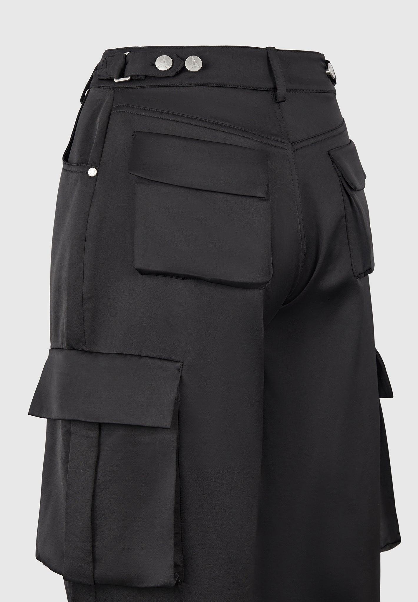 These wide-leg cargo trousers merge elevated fabric with utilitarian function. Crafted from a satin-finish woven material, they feature a mid-rise fit with a clean waistband, signature branded hardware, and multiple flap pockets for practical edge. The full-length silhouette is relaxed yet structured, designed to bring movement and statement styling to both casual and polished looks. Mid-rise waist with tailored waistband and belt loops Wide-leg cut for a relaxed, elongated silhouette Shine-finish satin fabric for a refined, contemporary feel Flap pockets at sides and back for a utility-inspired look Silver Manière De Voir embossed button for subtle signature branding 54% Polyester 46% Rayon Always check the care label for wash instructions.