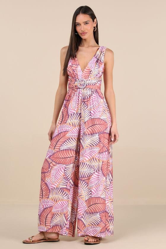 Crafted from lightweight woven fabric with a sweeping leaf-inspired print, this breezy yet sophisticated jumpsuit is ready for a season of patio dinner parties. Adjustable, tapered straps support a plunging bodice with a gathered, banded waist that boasts a straw-woven O-ring at the center. Ultra-relaxed wide pant legs fall to full-length hems. Hidden back zipper/clasp.