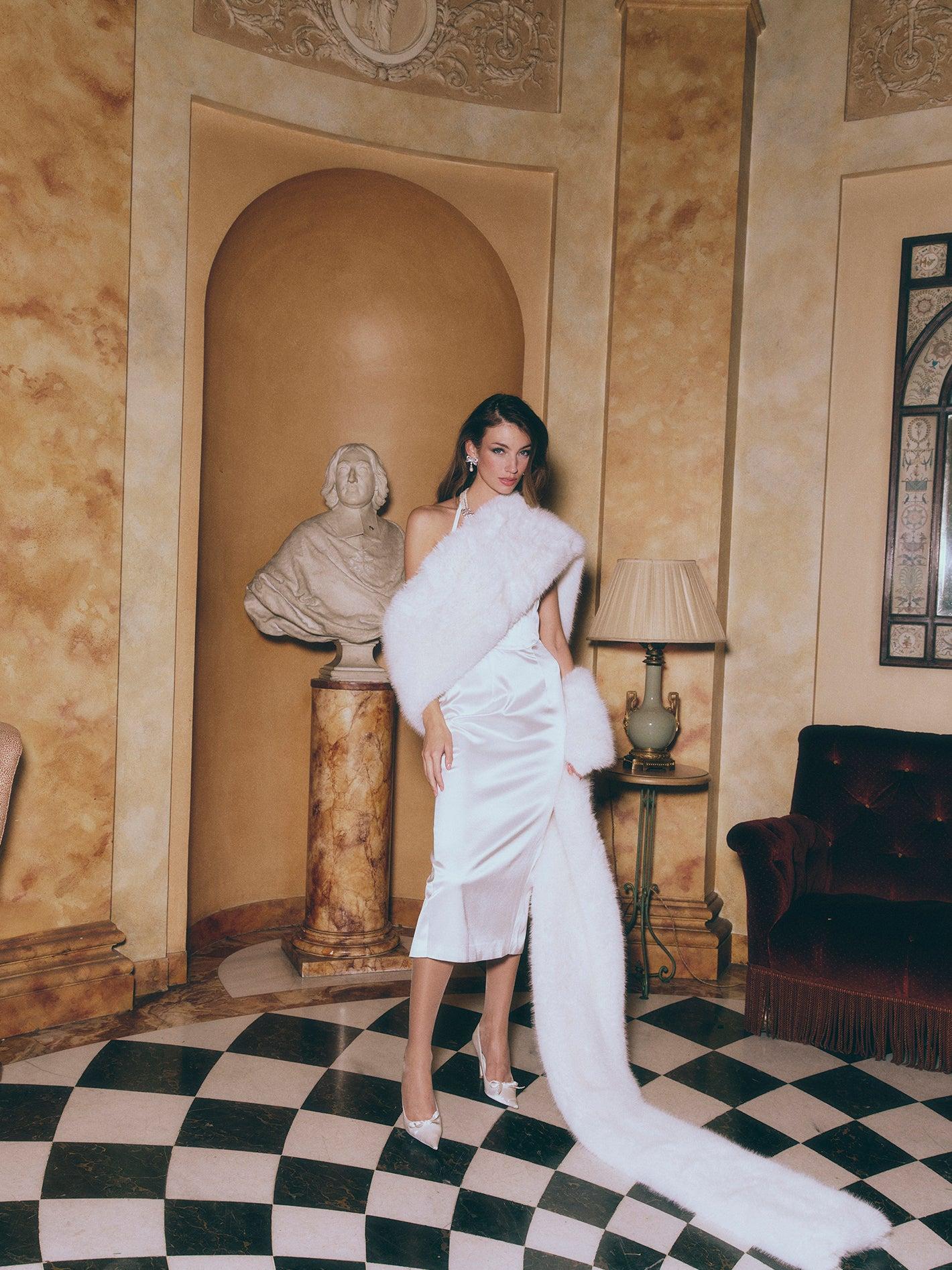 The Emma Fur Shawl is a statement of timeless luxury and elegance, designed to elevate any evening look with effortless glamour. Crafted from ultra-soft, premium faux fur, this shawl drapes beautifully over the shoulders, providing both warmth and sophistication. Its generous length and plush texture make it a standout accessory, whether paired with a gown for a formal event or layered over a chic ensemble for a dramatic touch. Features: Luxurious Faux Fur: Soft, smooth, and cruelty-free material with a plush feel. Elegant Drape: Designed for effortless styling, perfect for adding drama to any outfit. Generous Length: Provides full coverage for a regal, statement-making look. Versatile Styling: Ideal for pairing with gowns, cocktail dresses, or formal wear. Comfort and Warmth: Keeps you cozy without compromising on style.