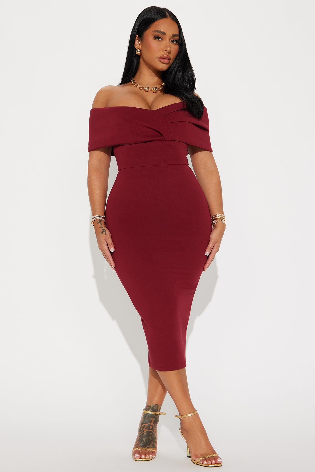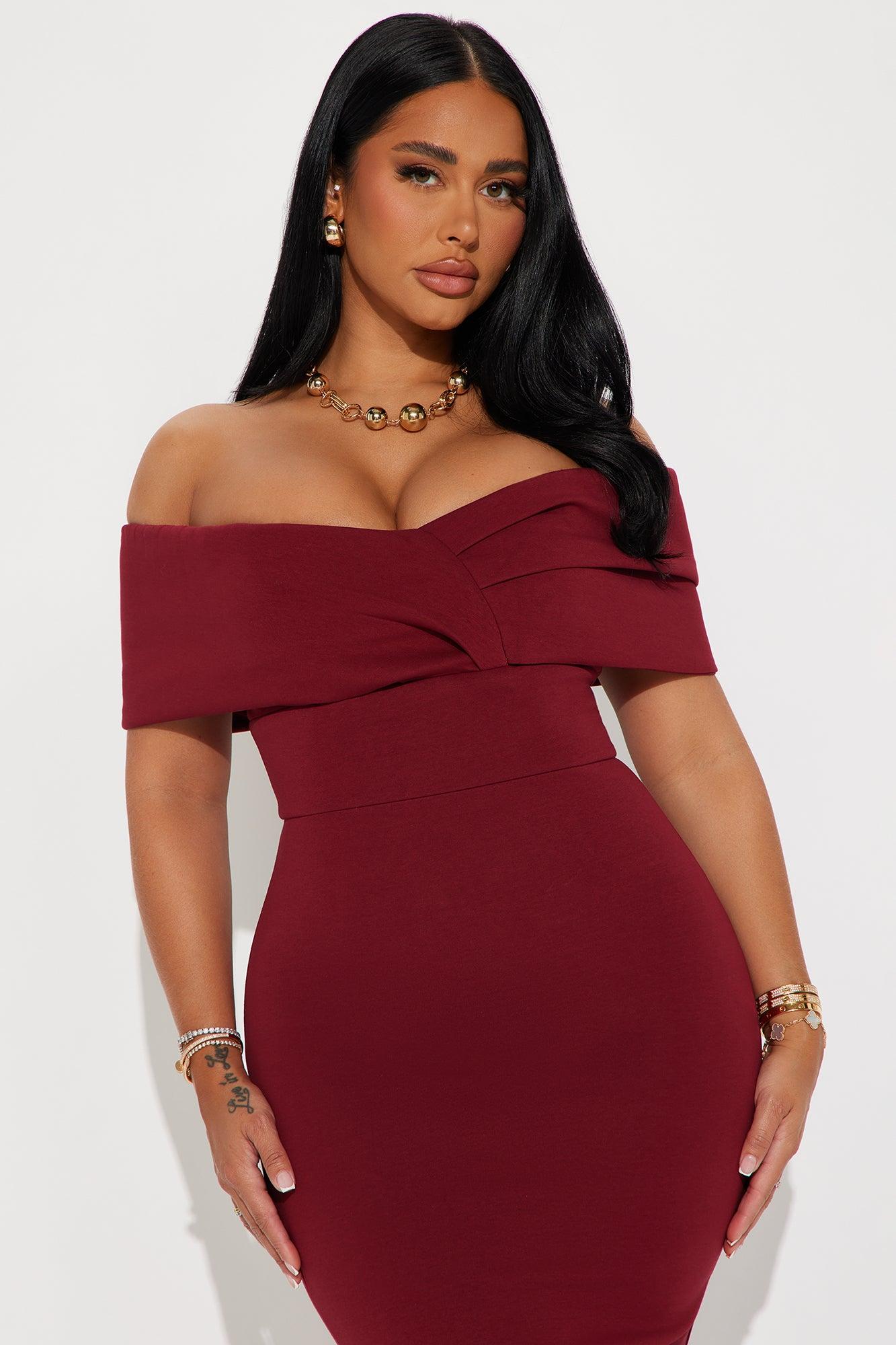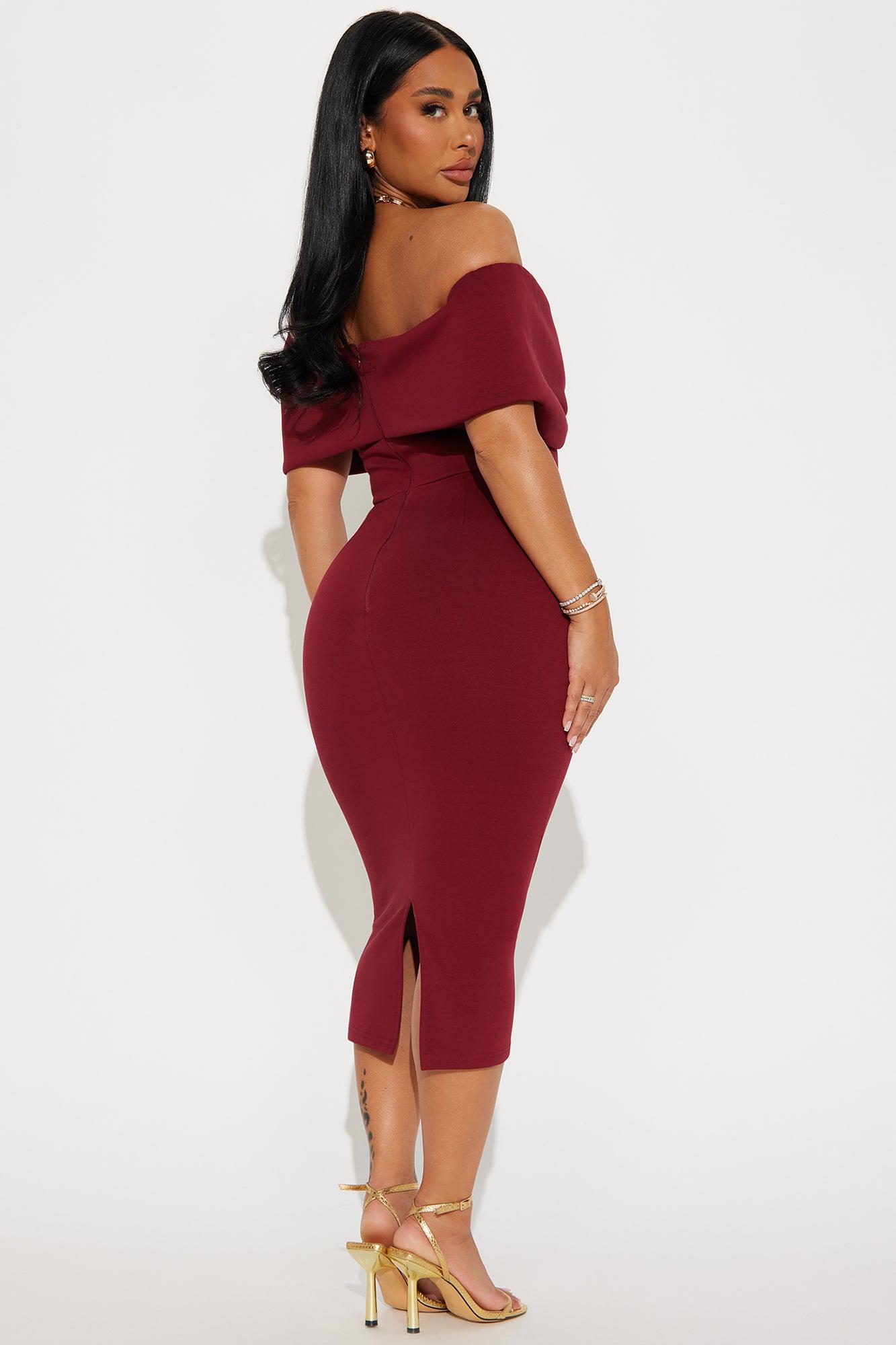 Available In Mocha And Wine. Off Shoulder Midi Dress Off shoulder Short sleeves Twist detail Back slit Back zipper Stretch Length = 45" Self: 52% Polyester 42% Cotton 6% Spandex Lining:100% Polyester Imported California Proposition 65WARNING: Cancer and Reproductive Harm - www.P65Warnings.ca.gov.