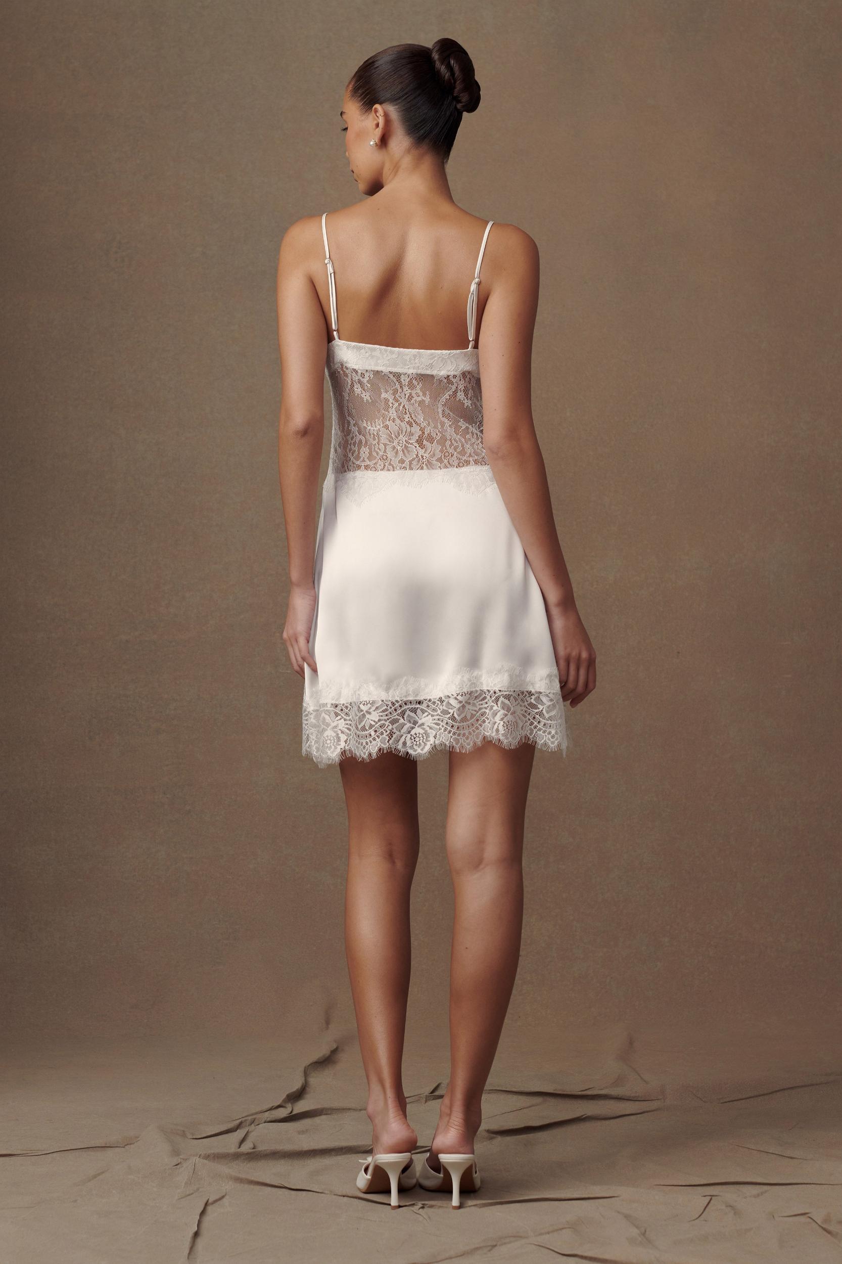 For the wedding night.Exude timeless elegance in our EMMETT Lace Slip Dress. Featuring a flattering V neckline and adjustable satin straps for a perfect fit, this dress boasts sheer underbust and back panelling details for a touch of allure. Crafted from a luxurious mix of satin and lace fabrications, it showcases a delicate lace trim hem and an A-line silhouette. Unlined for a natural feel, this dress effortlessly combines sophistication with femininity.