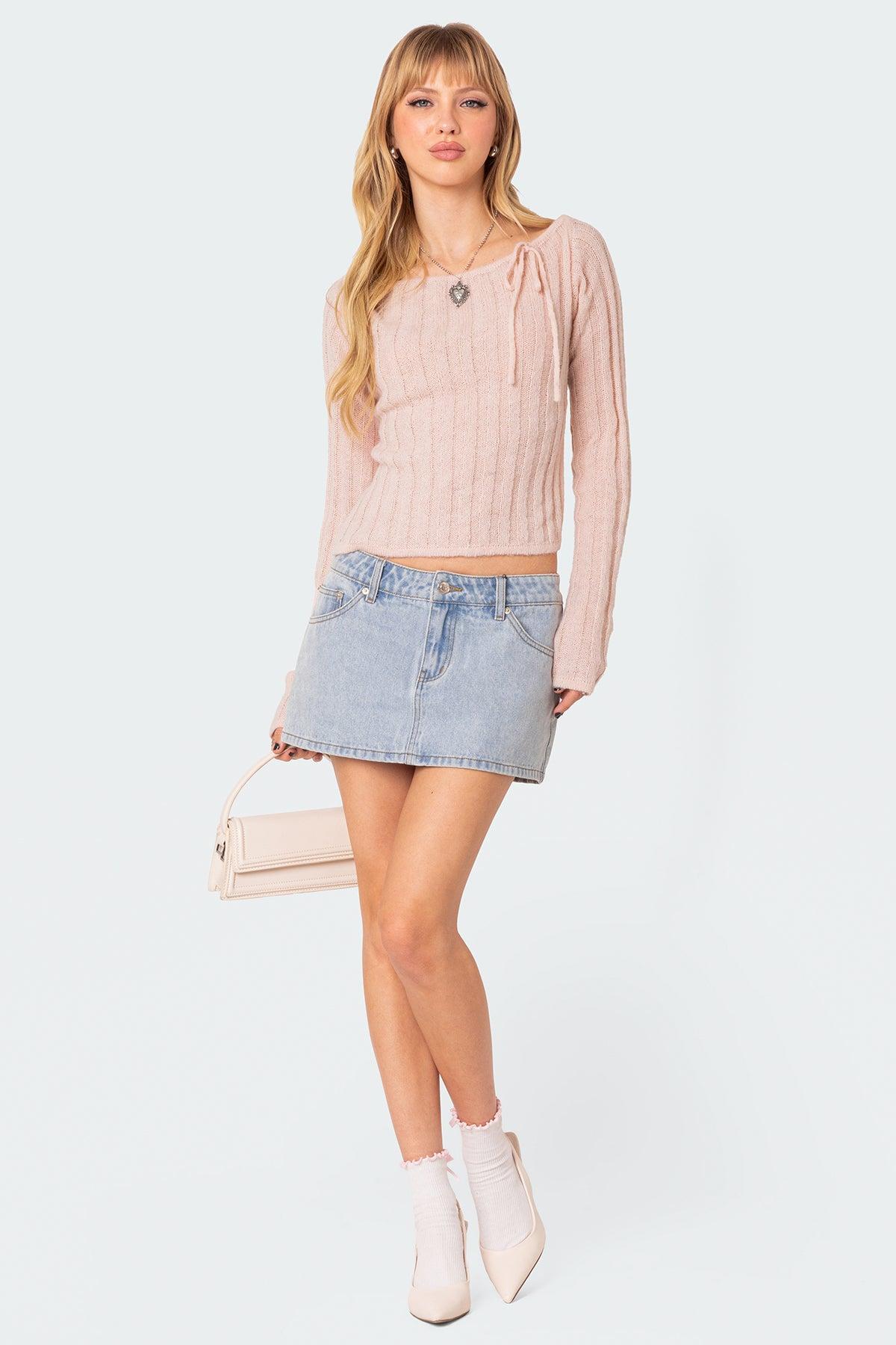 Top Long sleeves Open back tie straps Tie front detail Knit fabric Polyester, Rayon Model wears size S Model height is 5'6 Item care: Wash with similar color