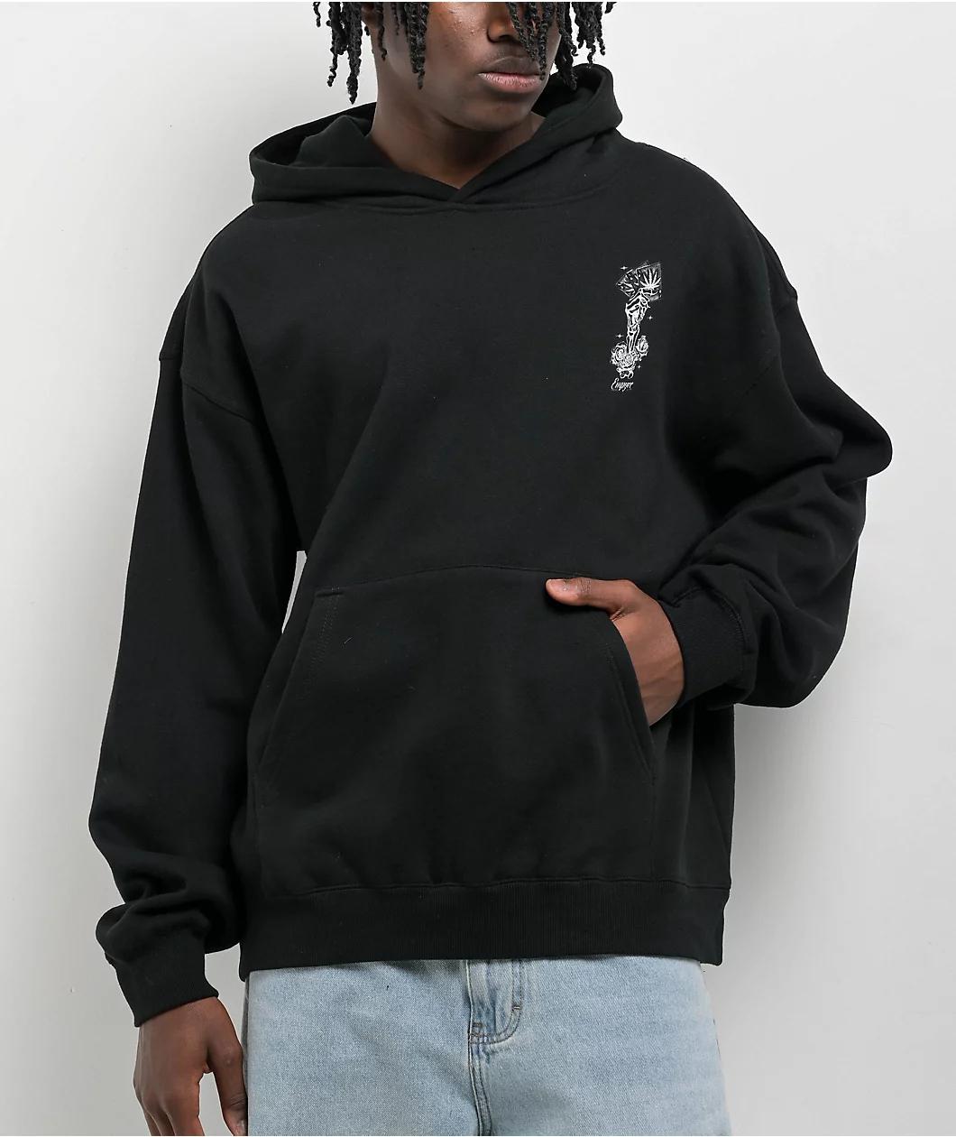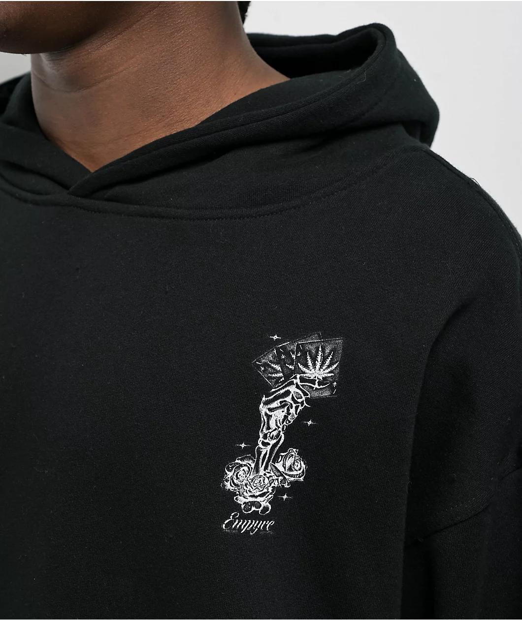 Inspired by gambling with a morbid vibe, Empyre offers the Aces Of Fades hoodie in a solid black cotton blend with printed graphics on the left chest and back. The image on the front displays a skeletal hand holding three weed leaf playing cards abov