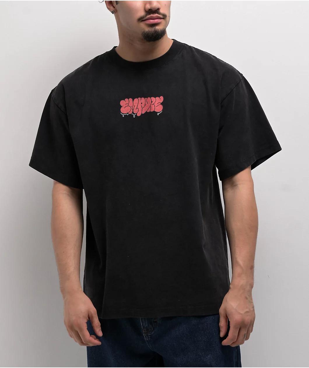 From Empyre, the Alley Cat t-shirt comes in a washed black colorway, with red graffiti branding centered on the chest. A larger graphic of a mischievous cat is printed on the back. The tee is finished with a printed neckline and a ribbed collar.