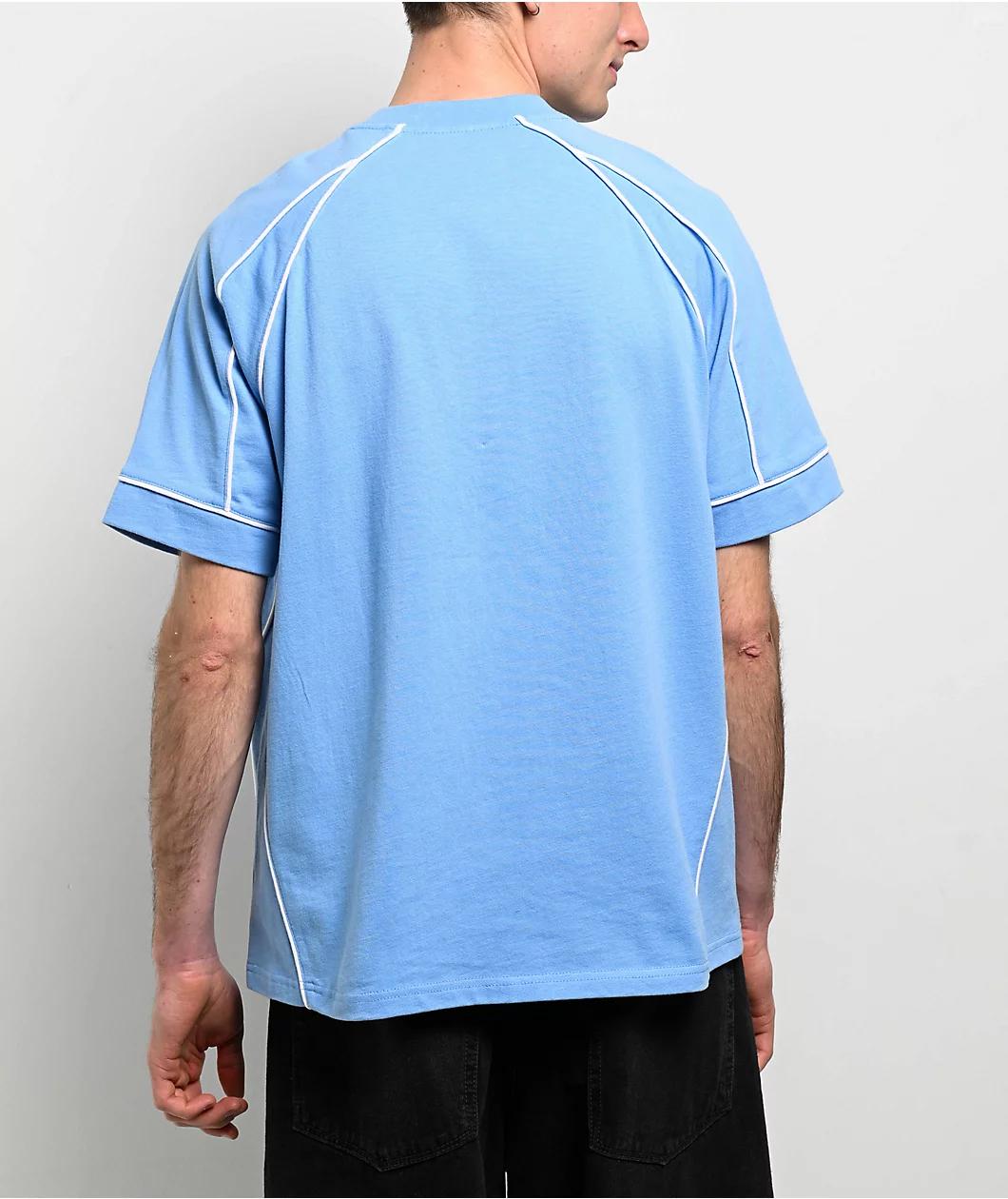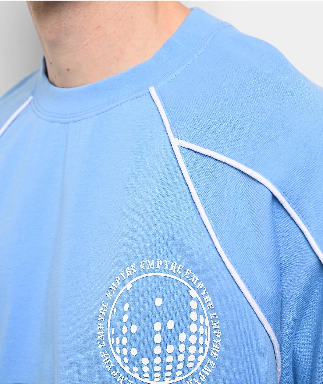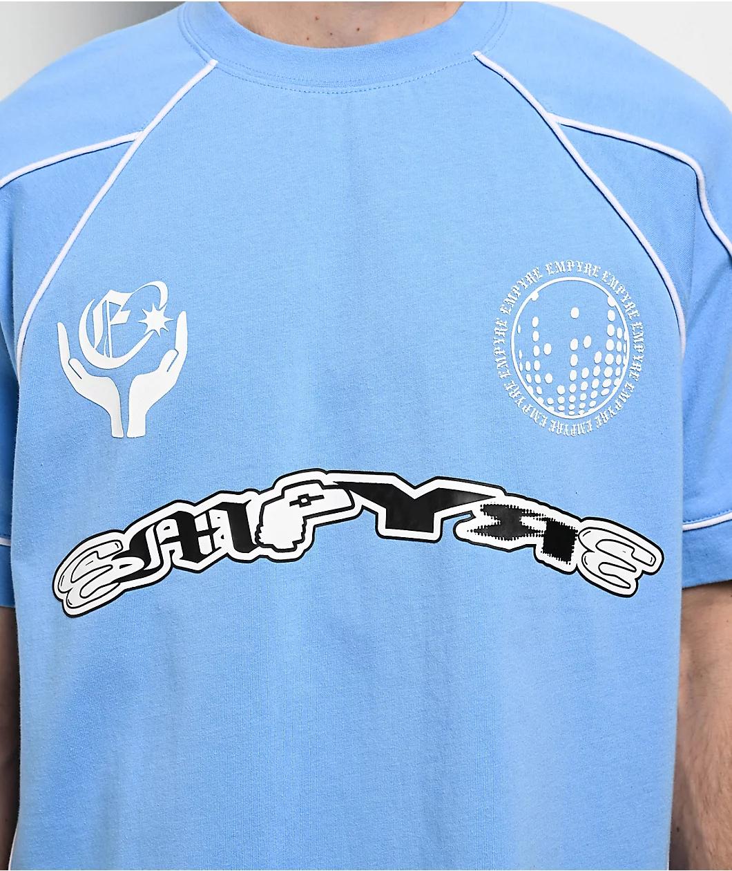 Enjoy the look of a classic sports jersey with the warmth and comfort of a classic t-shirt in the blue Astrolink tee from Empyre. White contrast piping throughout creates a sporty look, and frame faux sponsor branding graphics on the chest. The cotto