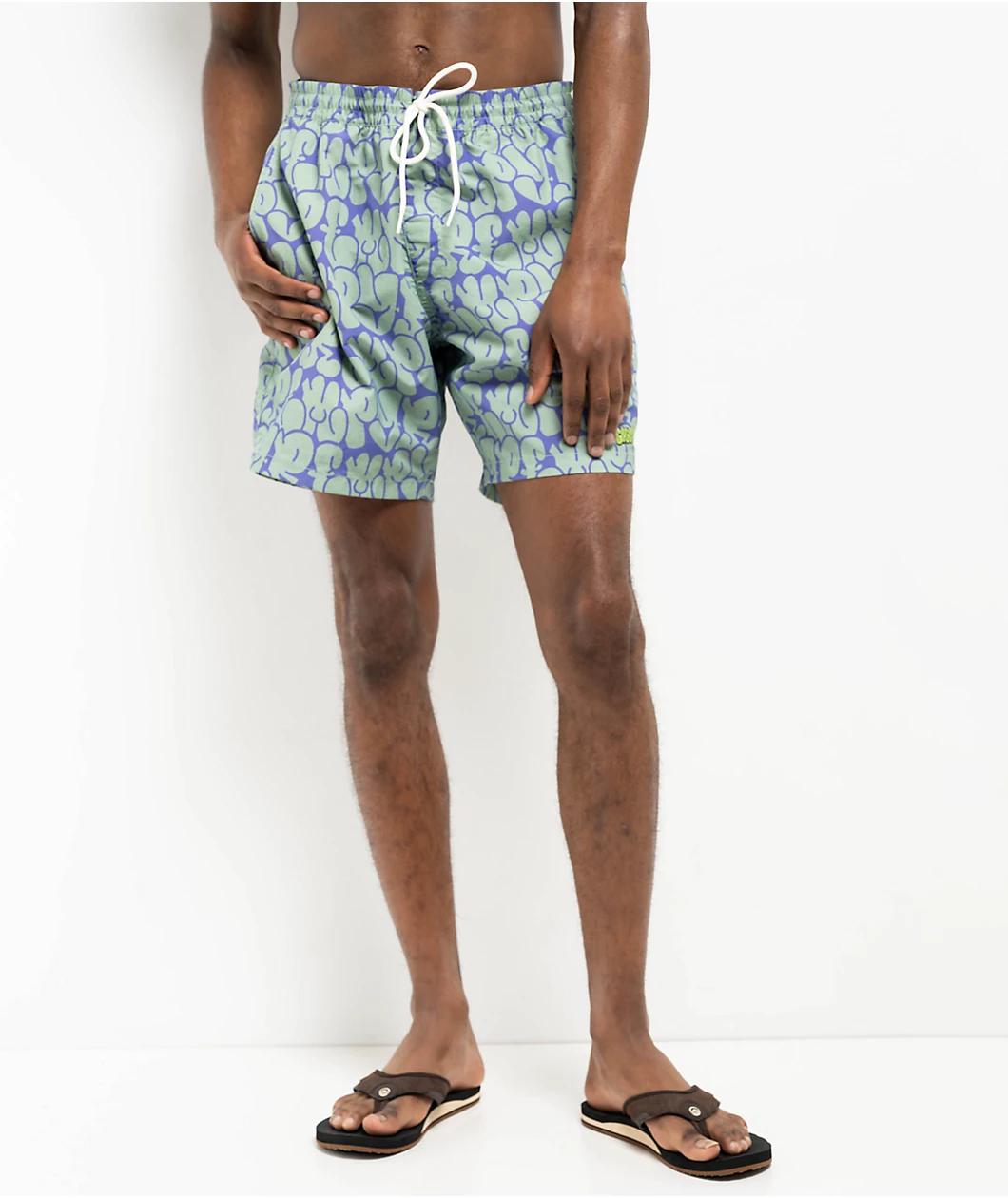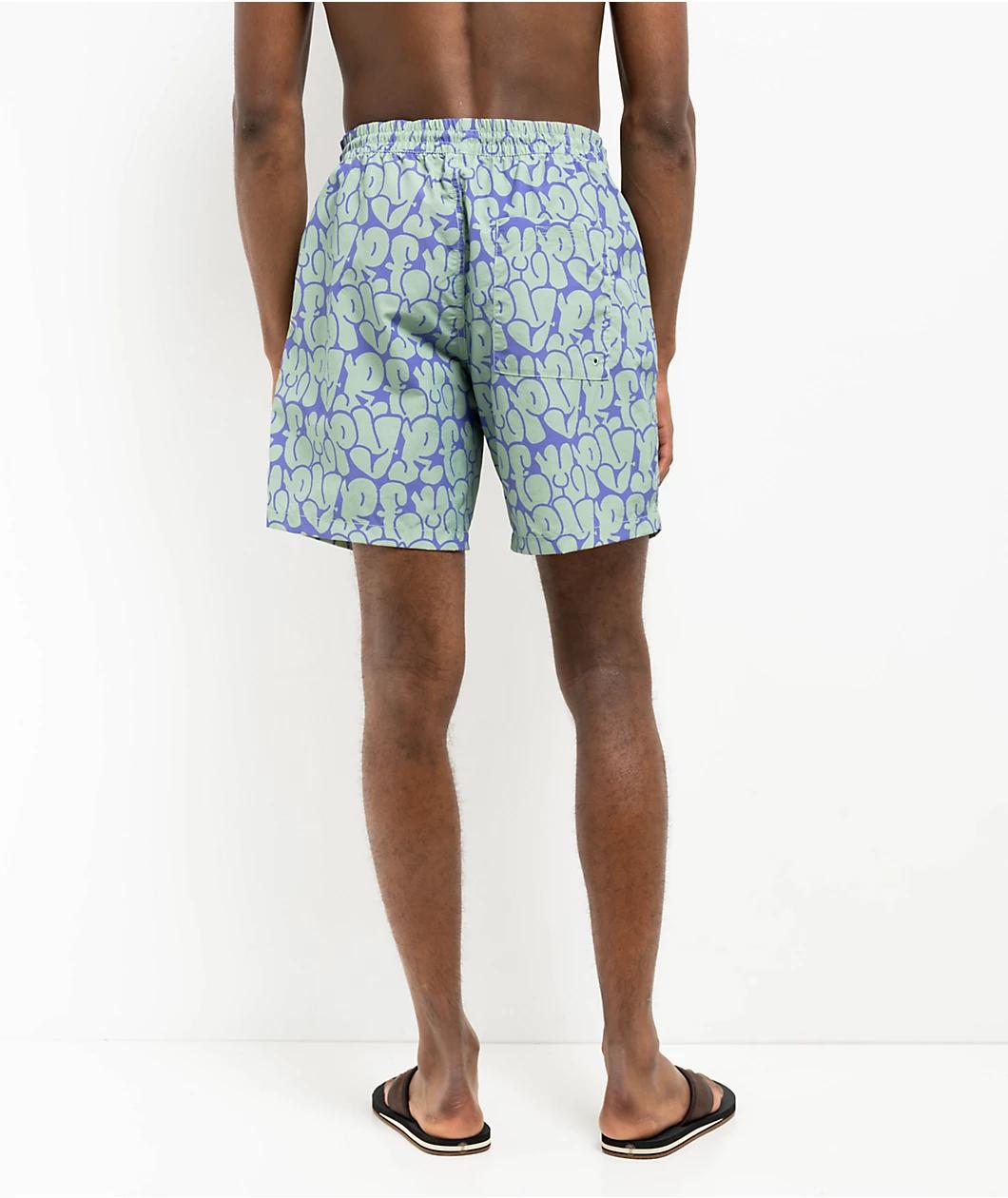 Offered by Empyre in a 100% recycled nylon build with a graffiti-inspired sublimated pattern throughout, the Bubble Floater board shorts arrive in a "Granite" green and purple "Opulence" colorway with screen-printed red branding near the left leg ope