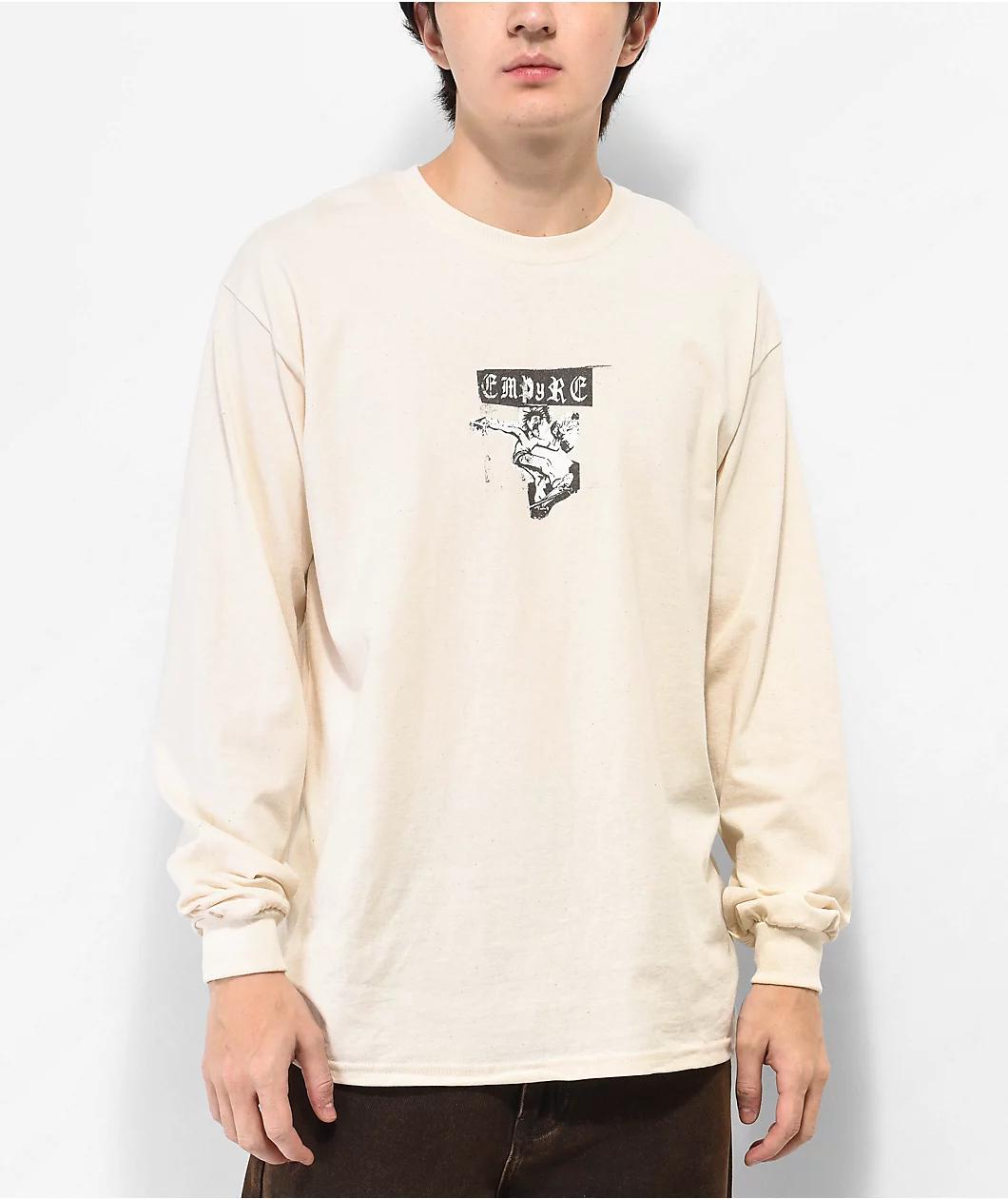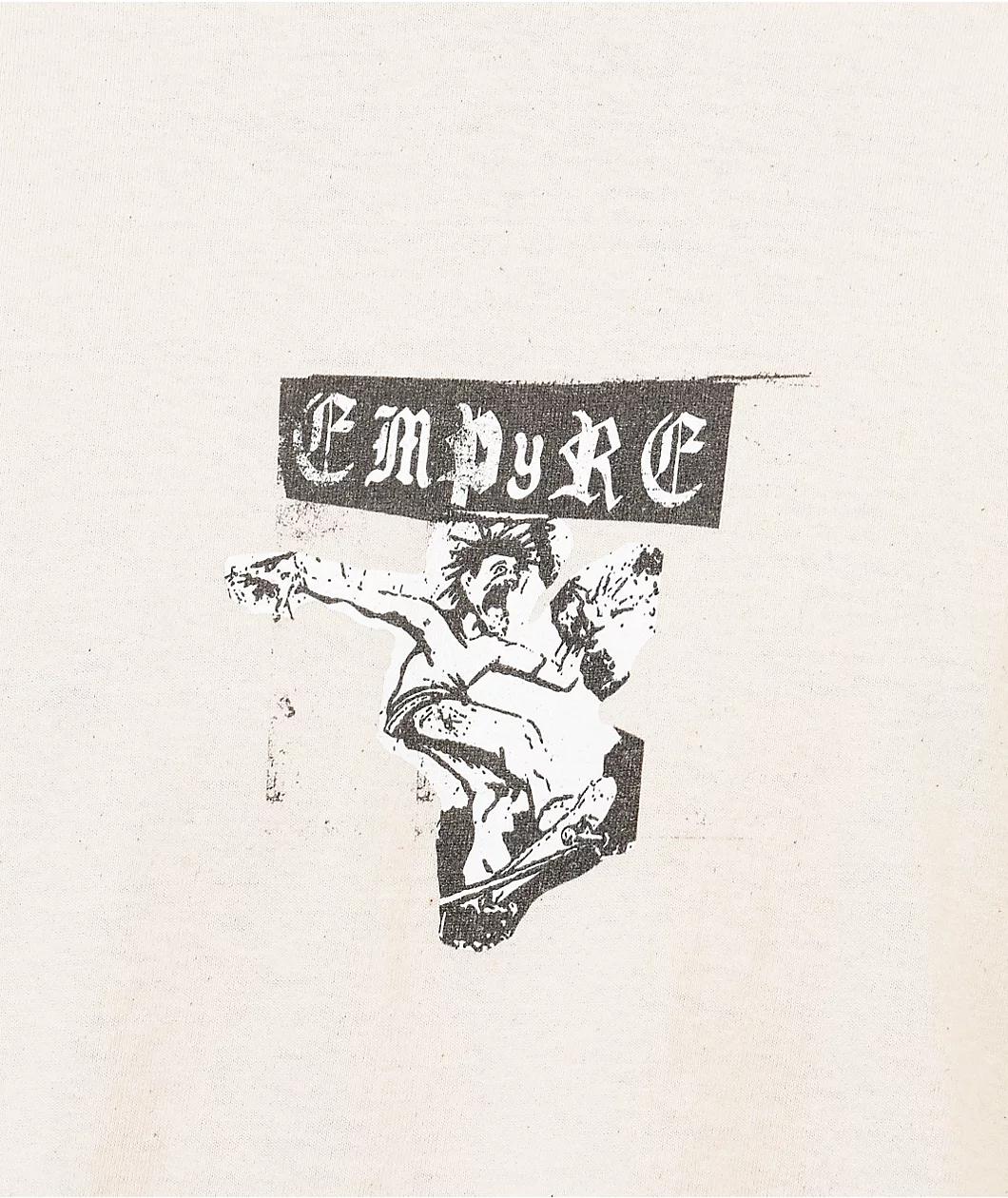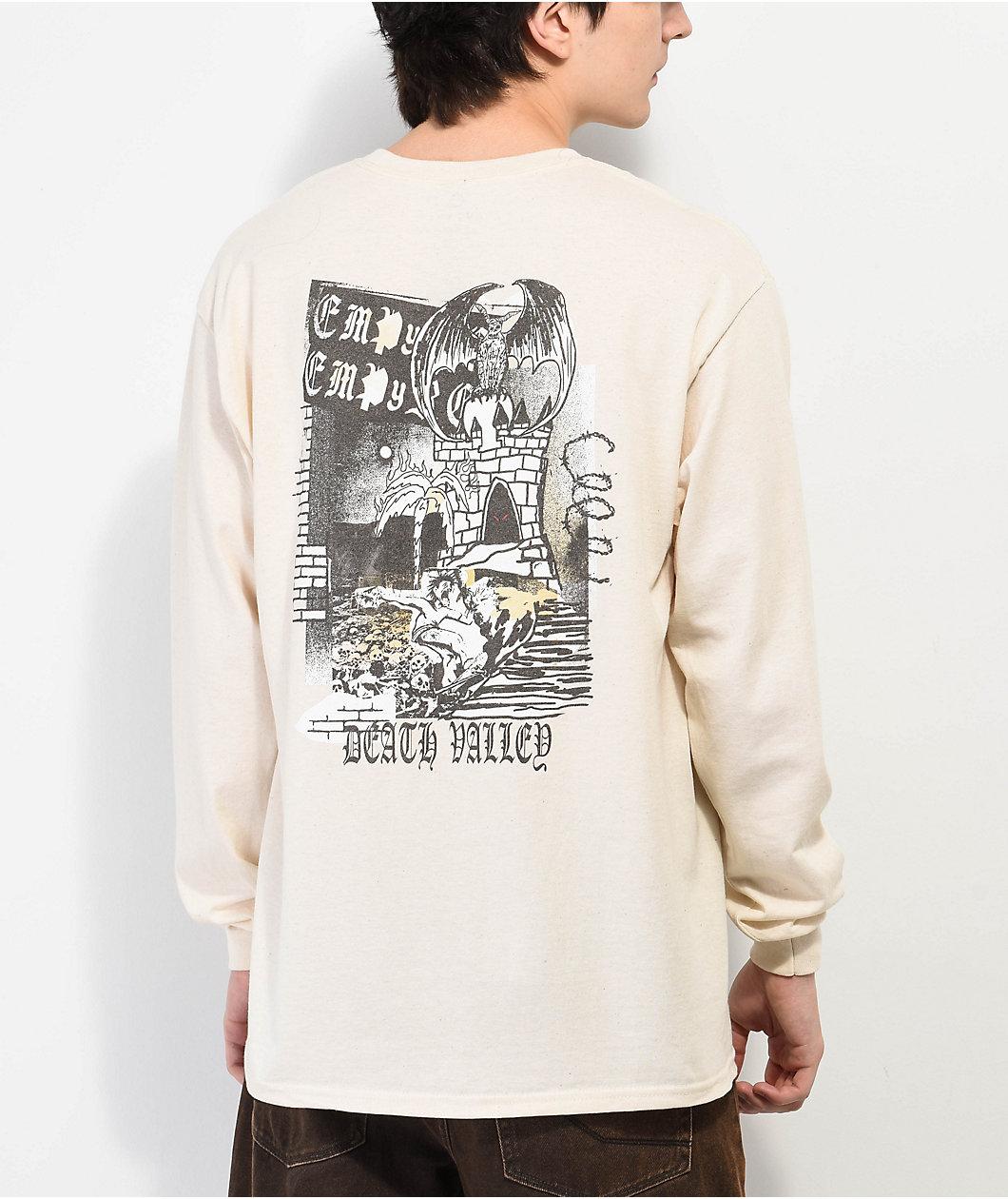 The Death Valley long sleeve t-shirt from Empyre features retro punk-inspired imagery throughout. A large graphic of a skateboarder with gothic imagery is screen-printed on the back, as additional brand text is printed on the front in black. Made from bre