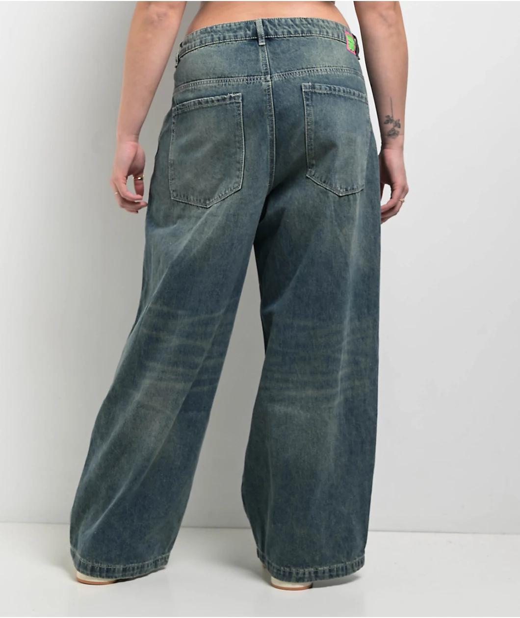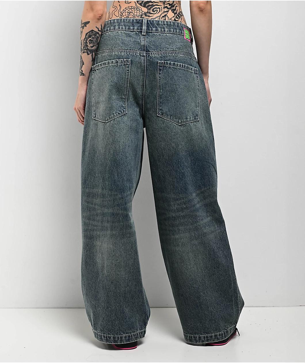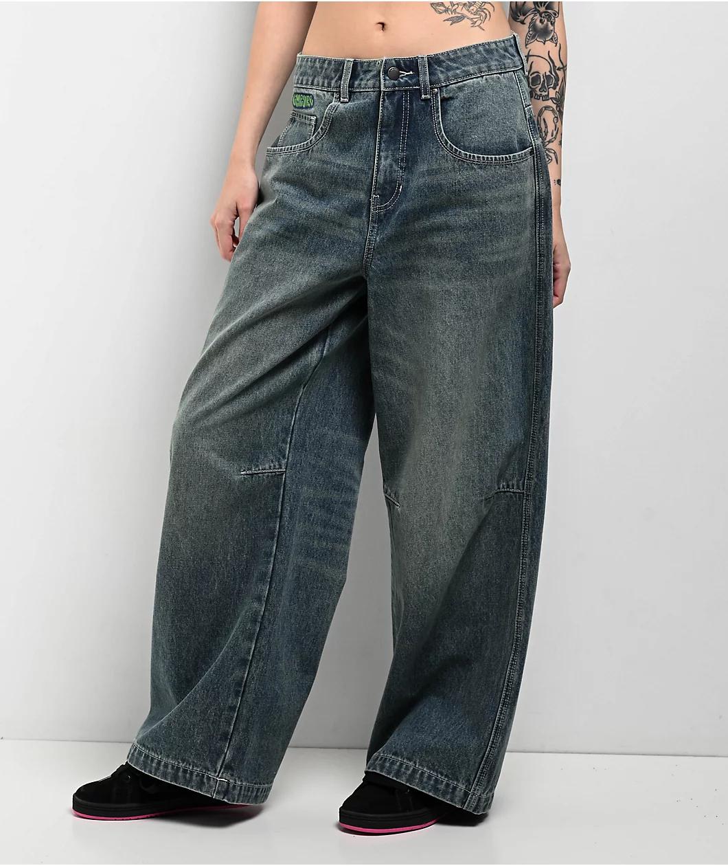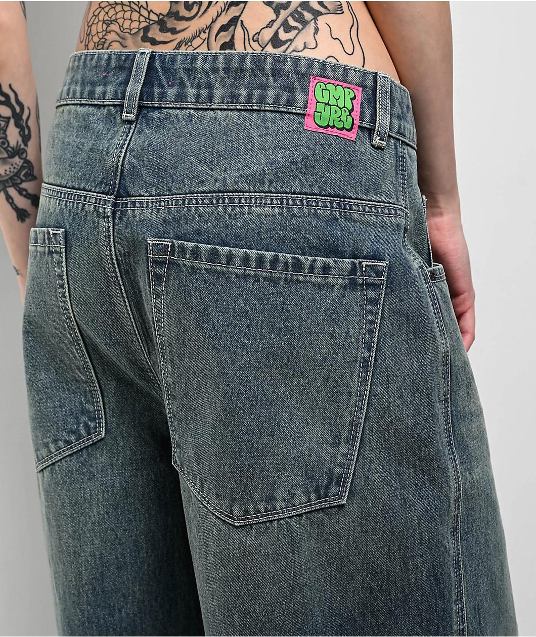 Add a carefree, drapey accent to any ensemble with the Engine Extent jeans from Ninth Hall, arriving in a blue cotton build with an oversized, wide-leg silhouette and a vintage wash treatment for a faded, worn look. Subtly branded with graffiti lette