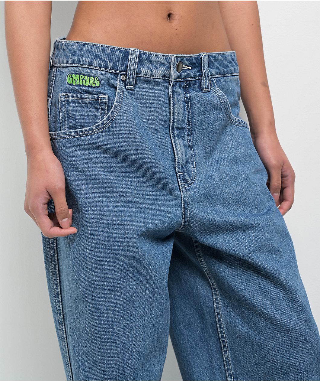 Offering a low rise waist with a loose, wide leg silhouette, Empyre presents the Extent jeans in a classic "Billie" blue hue. Utilizing a standard five-pocket layout with embroidered graffiti branding on the coin pocket, the Y2K-style jeans feature e