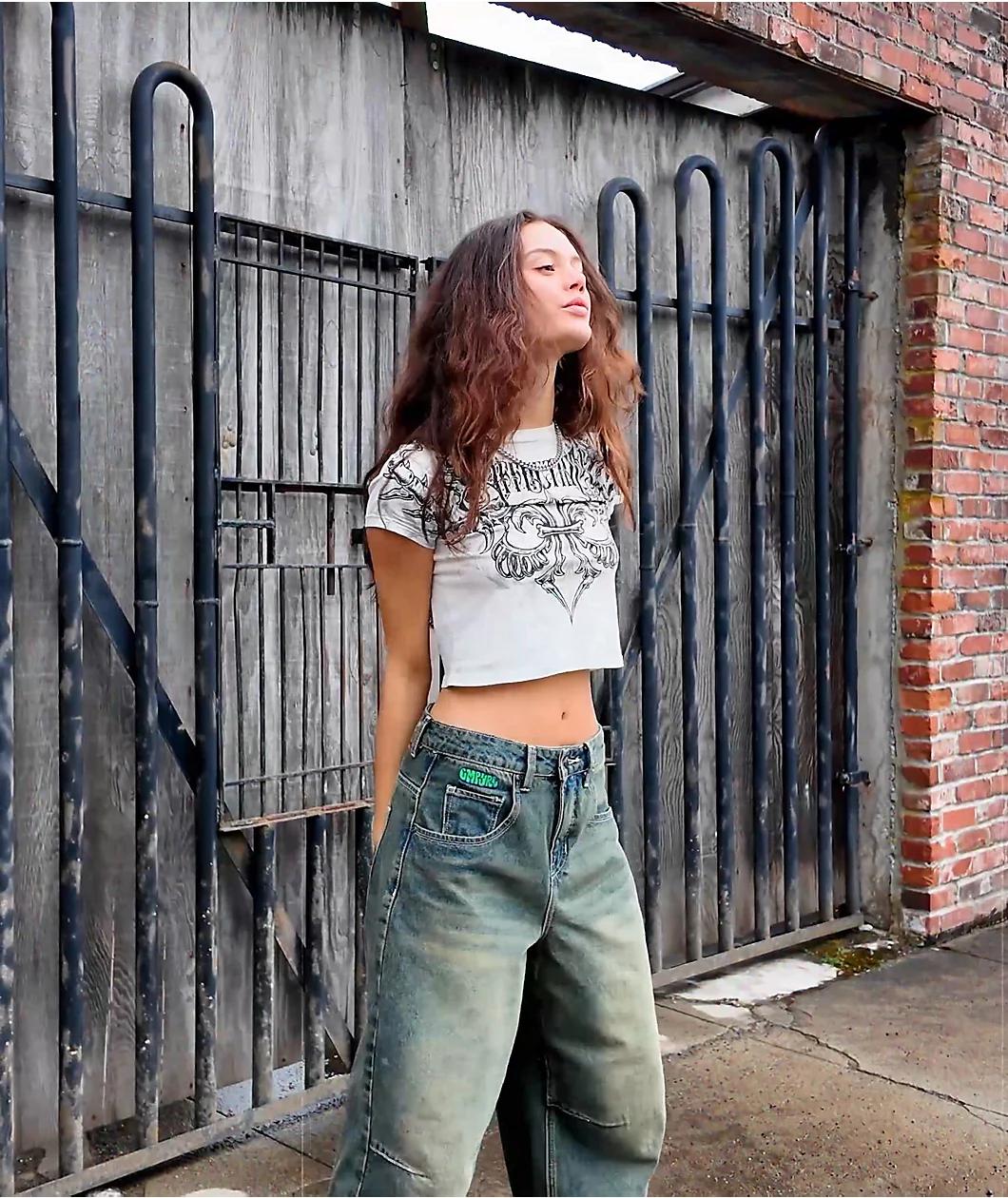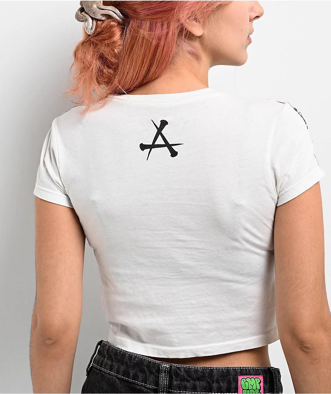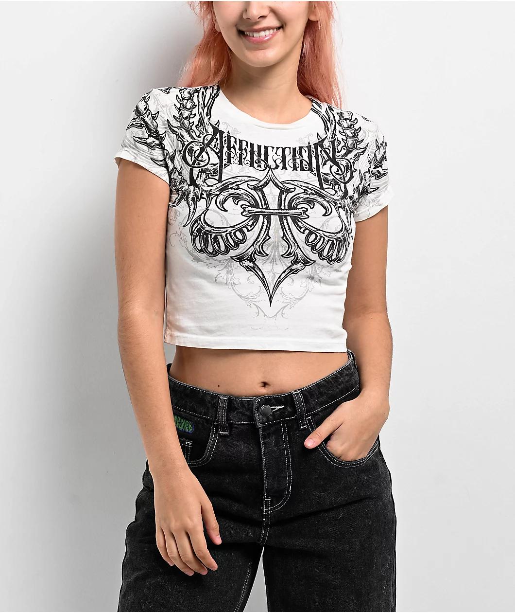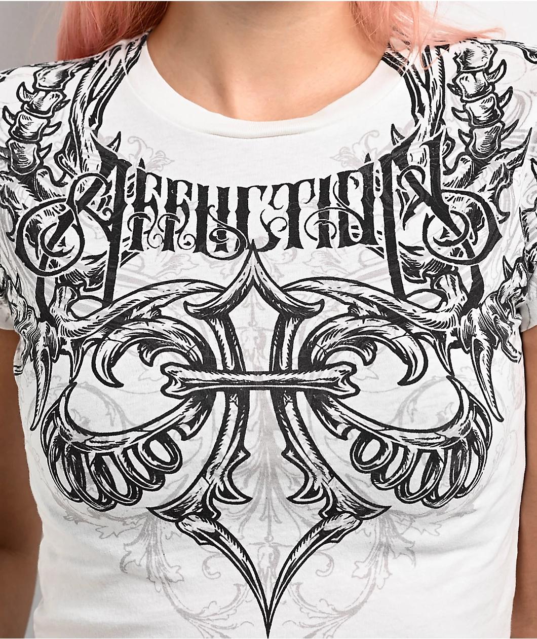 Incorporating traditional gothic design elements with a thorny vertebrae motif, the white Vertibrate crop t-shirt from Affliction is the perfect addition to any outfit looking for an alternative twist. Branding on the chest blends into the backbone d