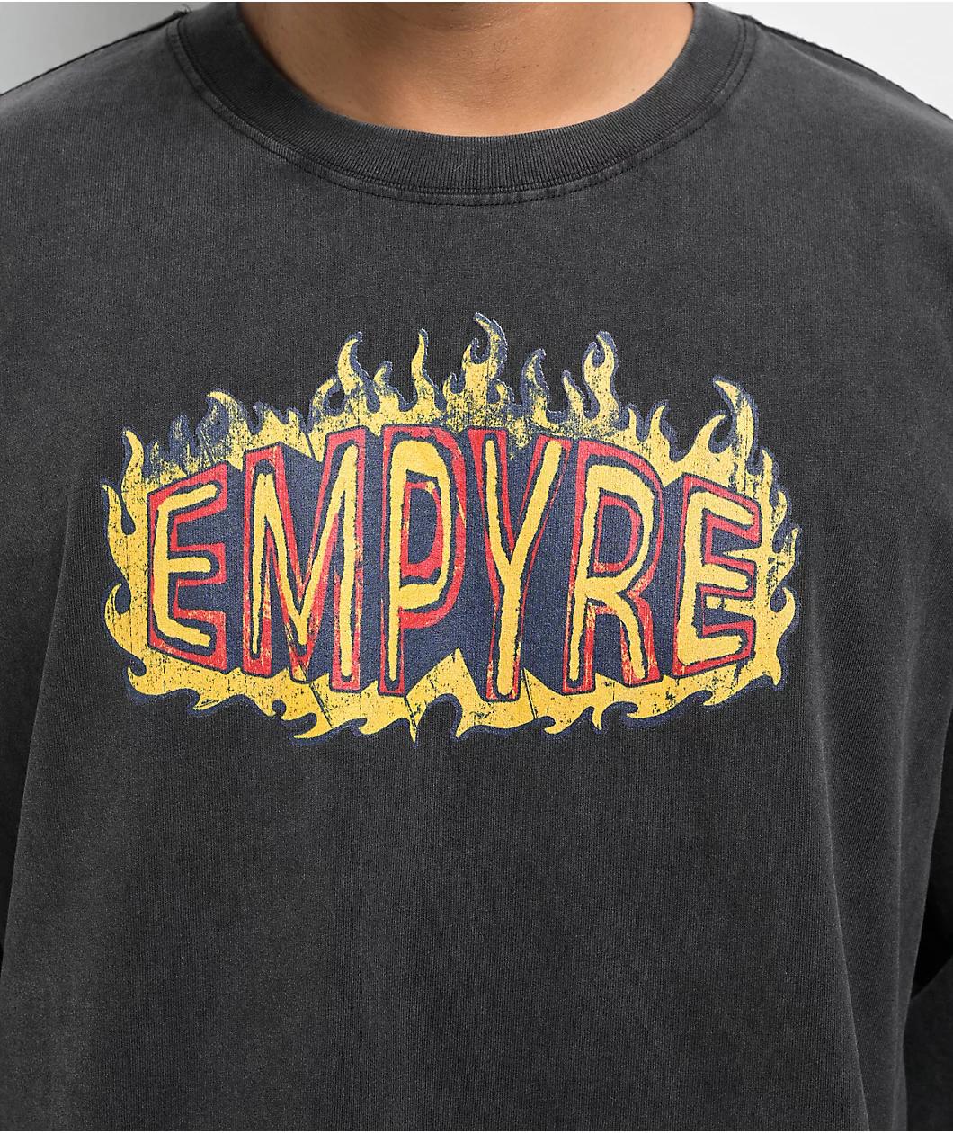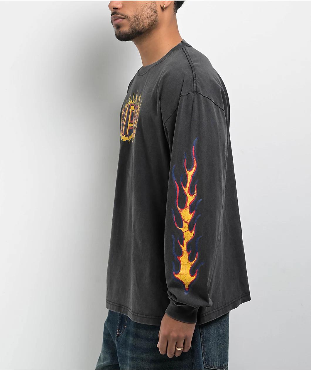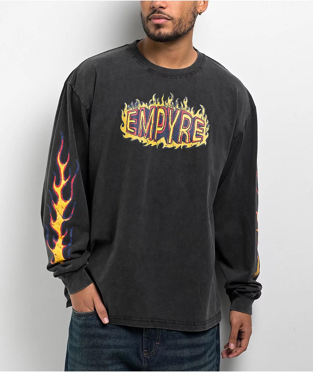 Empyre welcomes the Flame Thrower long sleeve t-shirt in a black cotton build with a washed treatment for a vintage appeal. Sporting illustrated Flame graphics printed on each sleeve, the comfortable tee displays burning branding across the chest in