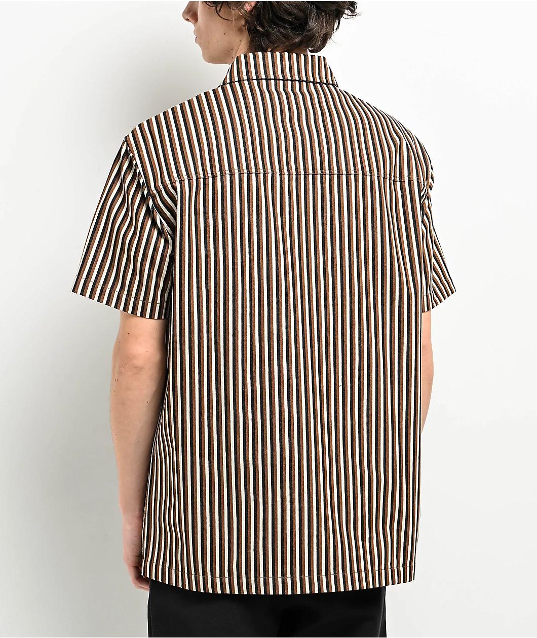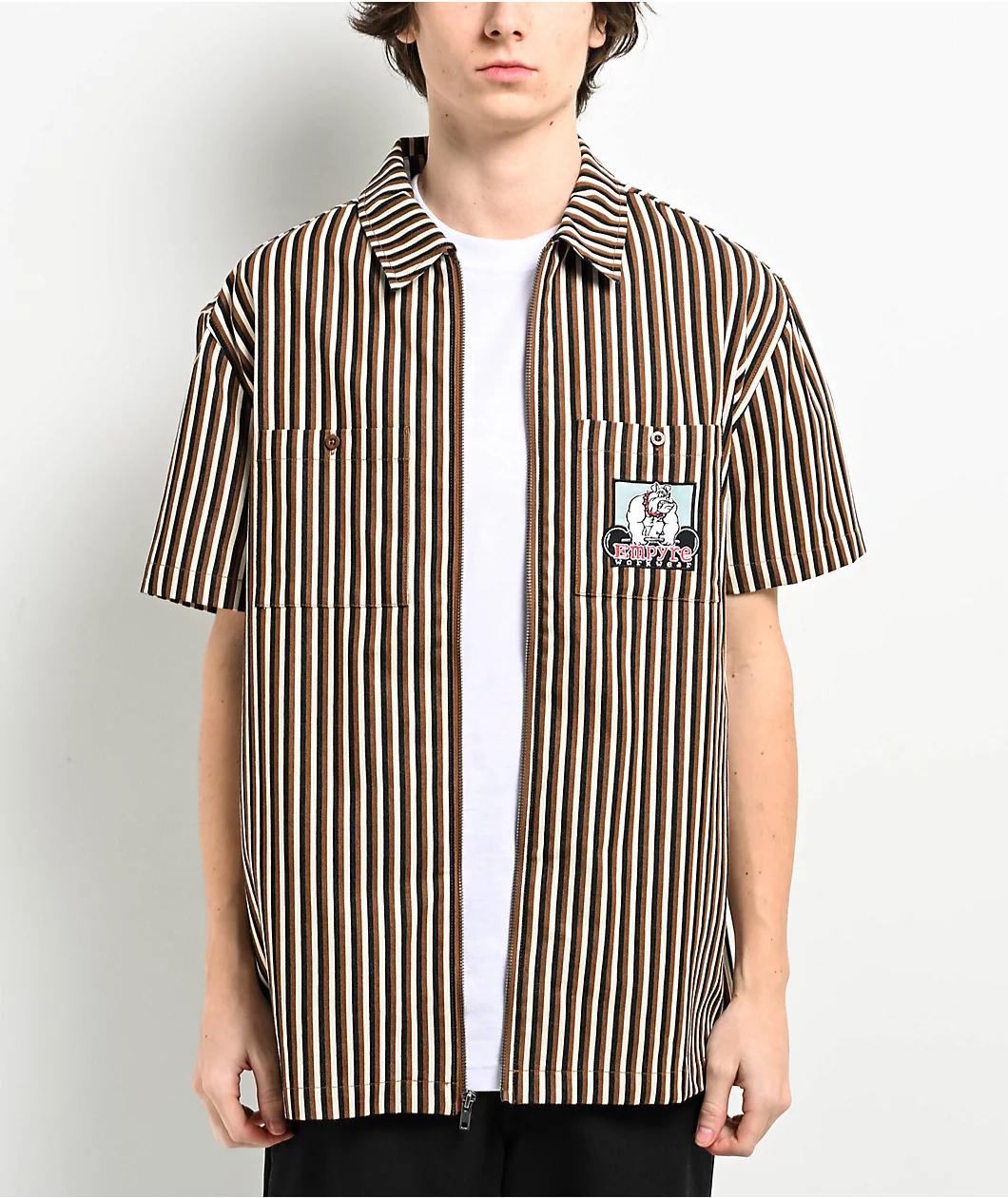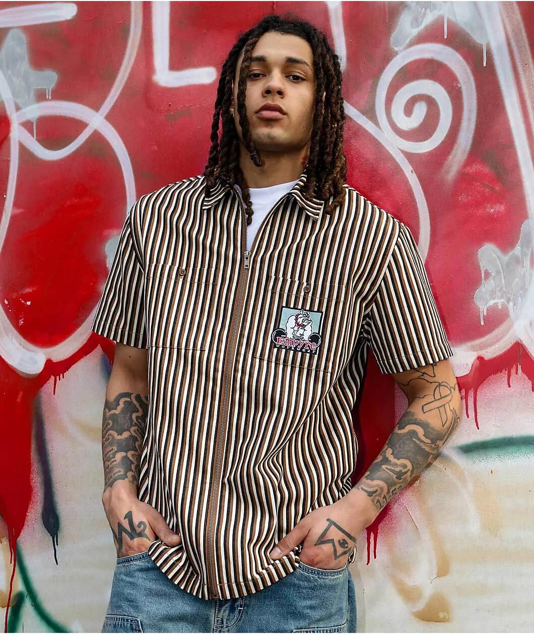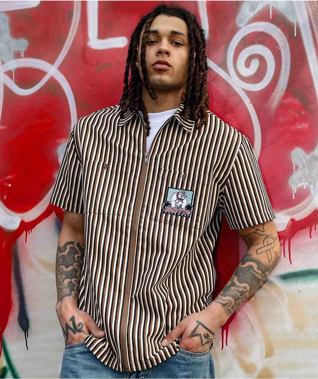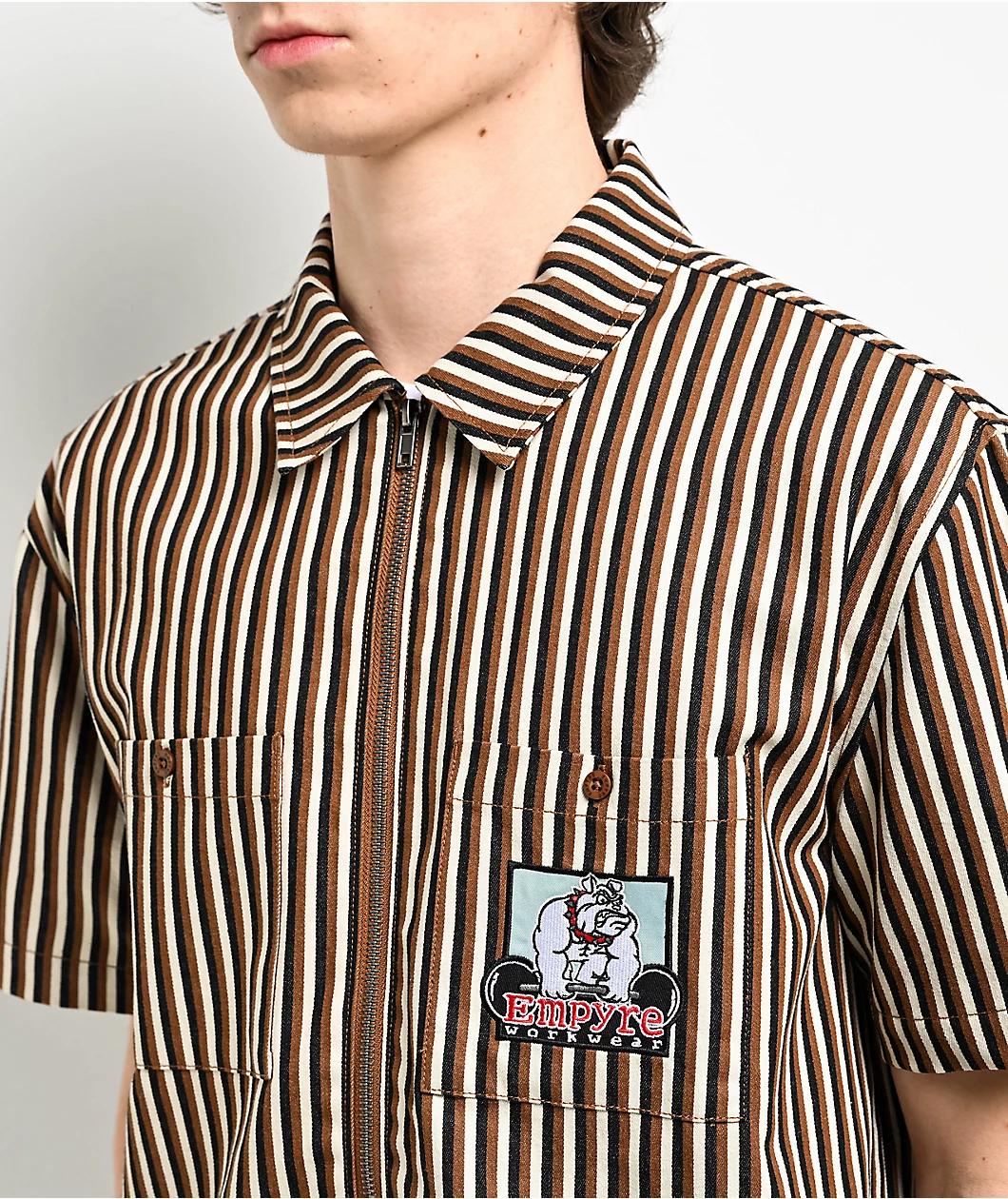 Created as workwear, Empyre provides the Glen shirt in a brown, black and white vertical stripe pattern using a short sleeve silhouette with a full zipper closure.