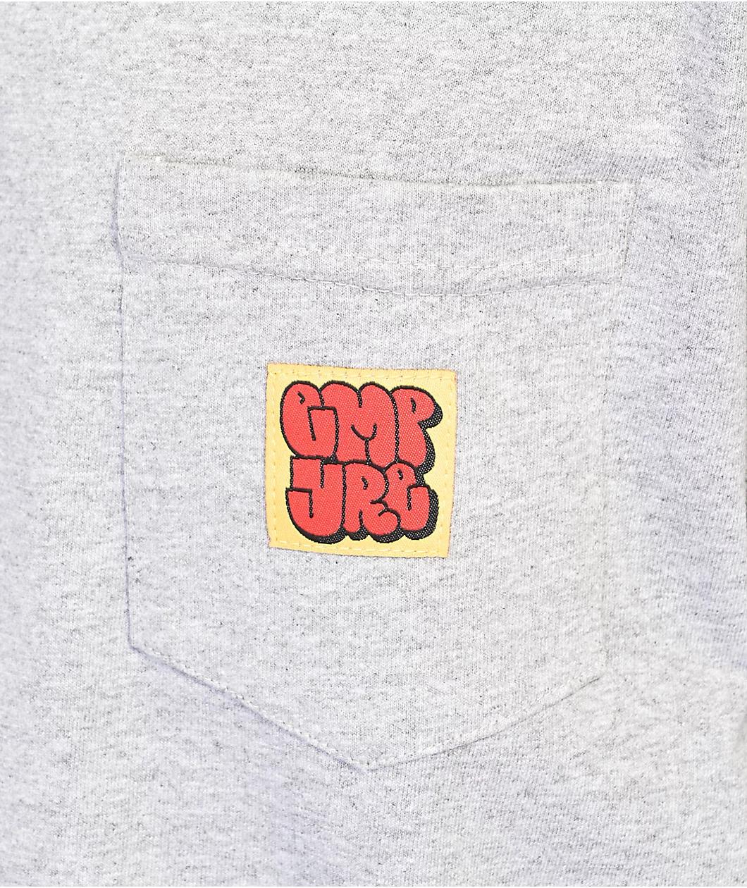 The Empyre Graffiti long sleeve t-shirt from Empyre comes in a grey cotton construction, with red and yellow woven detailing along the chest pocket. The regular fit silhouette has ribbed accents along the cuffs and collar for added durability, while a scr