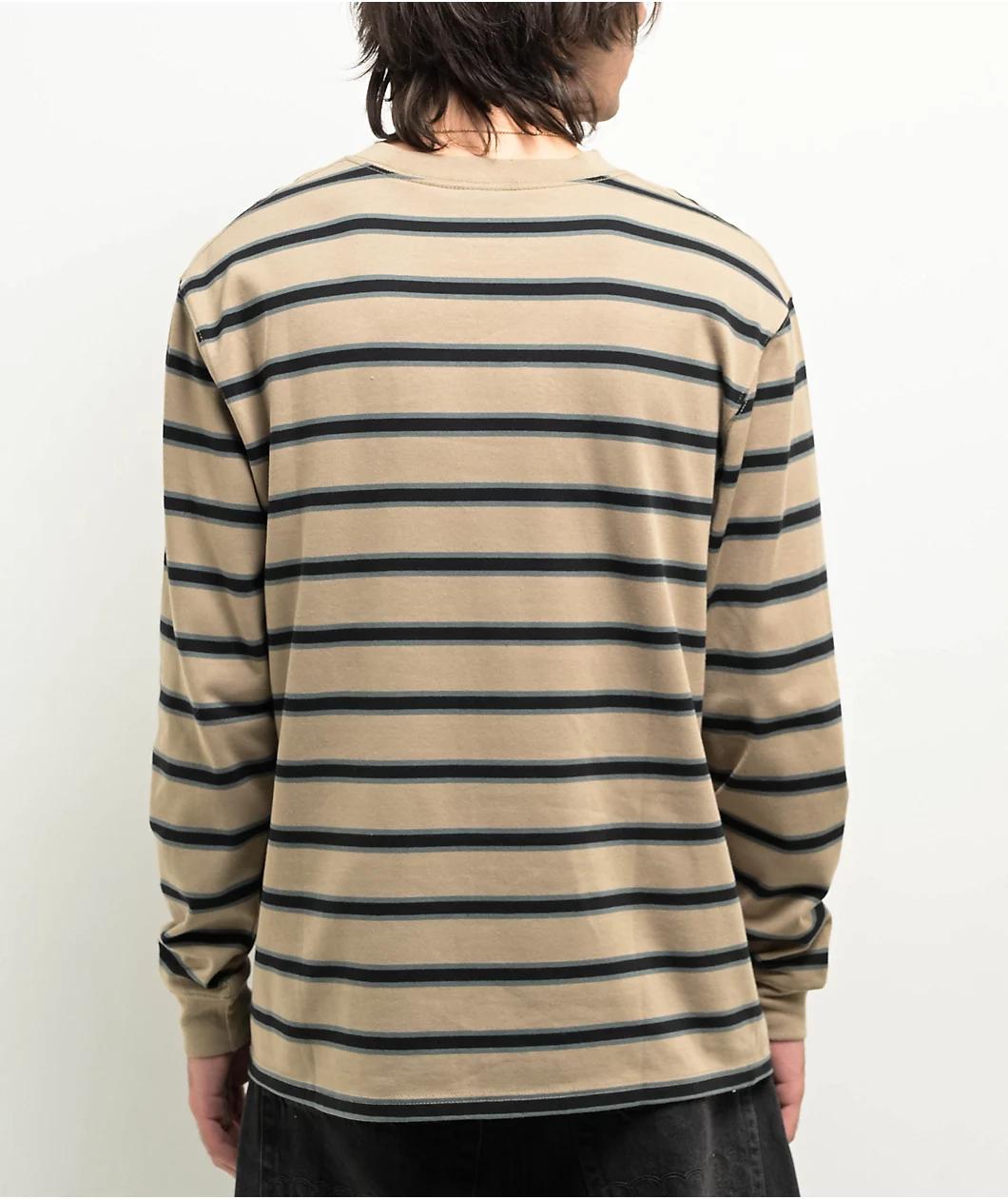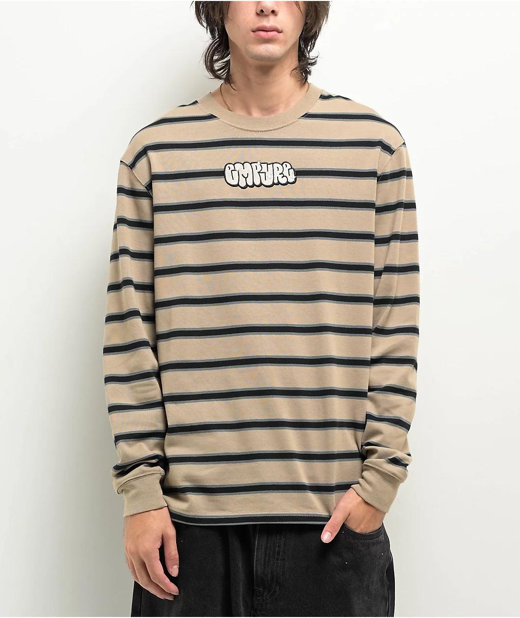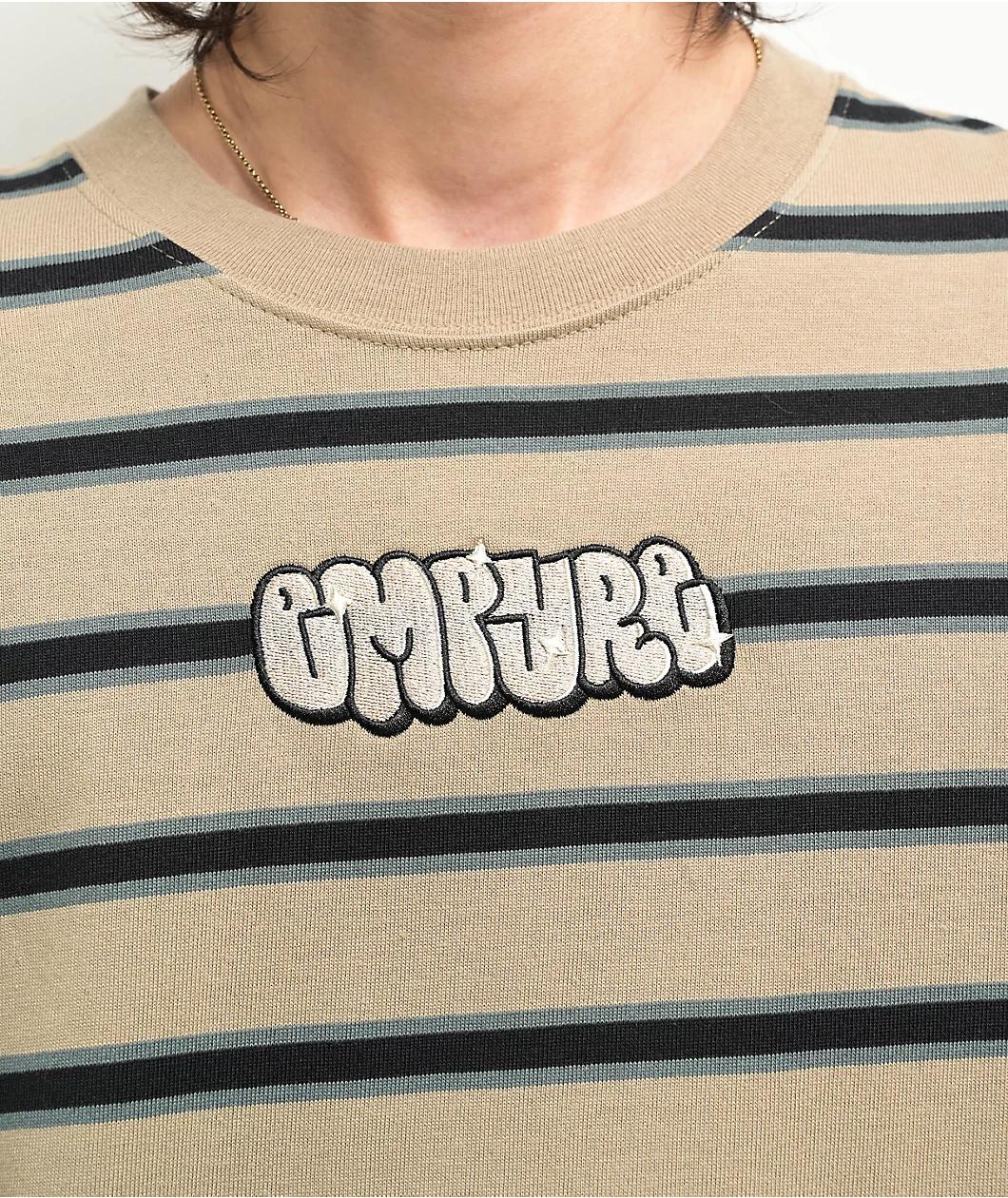 Add a streetwear vibe to your outfit with the Logan stripe long sleeve t-shirt from Empyre in a beige and black colorway. This tee showcases graffiti bubble letter branding across the chest, adorned with stars - producing an edgy, sophisticated vibe.
